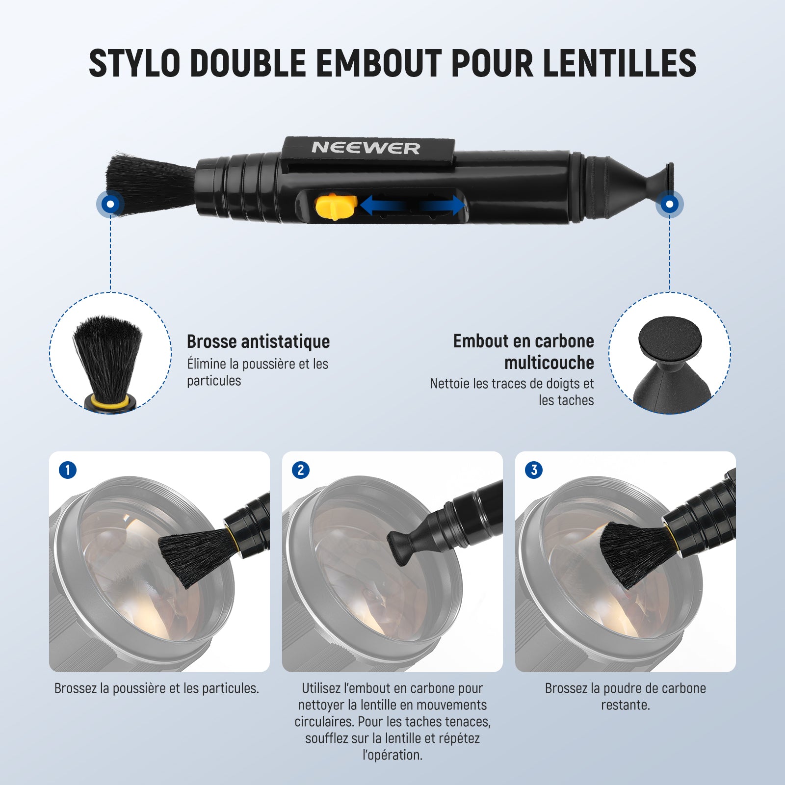 • 【Stylo brosse pour objectif 2 en 1】 Ce stylo de nettoyage pour objectif possède deux embouts : une brosse douce rétractable pour éliminer la poussière et une pointe en feutre pour absorber le sébum, les traces de doigts et les taches. Idéal pour nettoyer les objectifs, les boîtiers d'appareil photo, les claviers et autres appareils.