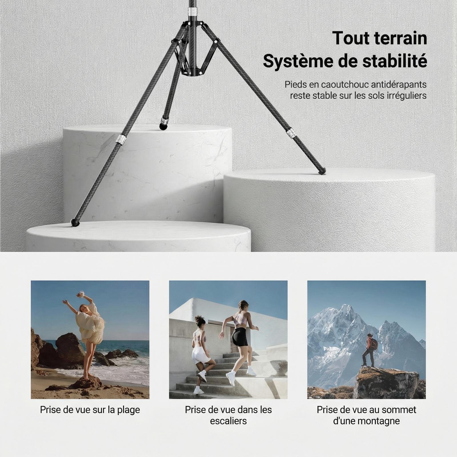 - Support sûr et stable : la construction robuste en fibre de carbone, combinée avec des pieds de trépied antidérapants en caoutchouc, assure la stabilité sur n'importe quel terrain, gardant votre équipement d'éclairage et vos accessoires de photographie en toute sécurité. Un crochet intégré au bas de la colonne centrale vous permet d'ajouter un contrepoids pour plus de stabilité