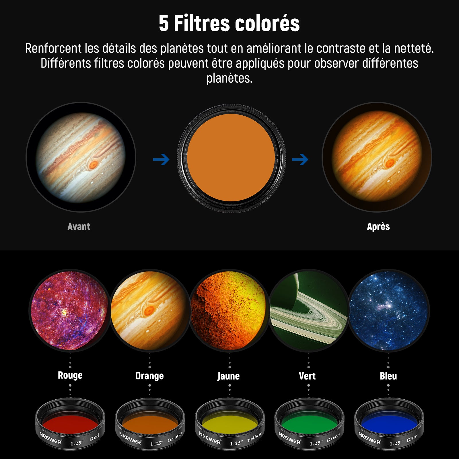 - 5 Filtres colorés-Ils améliorent votre observation planétaire. Rouge: Fait ressortir Mercure et Vénus du ciel bleu lorsqu'elles sont observées pendant la journée. Orange: Augmente le contraste entre les zones claires et sombres et pénètre les nuages. Jaune: Fait ressortir les calottes polaires sur Mars. Vert: Renforce les taches de givre, les brouillards de surface et les projections polaires sur Mars. Bleu: Divise l'étoile binaire Antarès lorsqu'elle est au maximum de sa séparation.