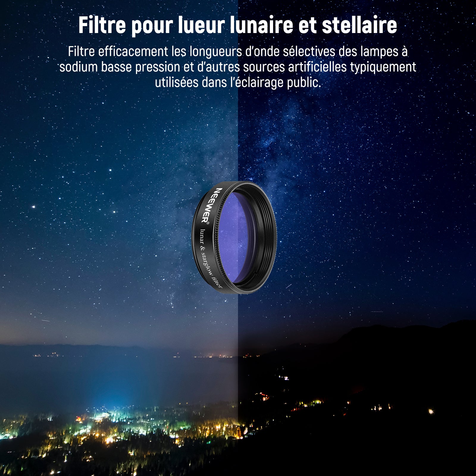 - Filtre à lumière stellaire lunaire- Minimise l'éblouissement, fait ressortir les détails de la surface et augmente le contraste; filtre aussi efficacement les longueurs d'onde sélectives de l'éclairage au sodium basse pression et des réverbères.