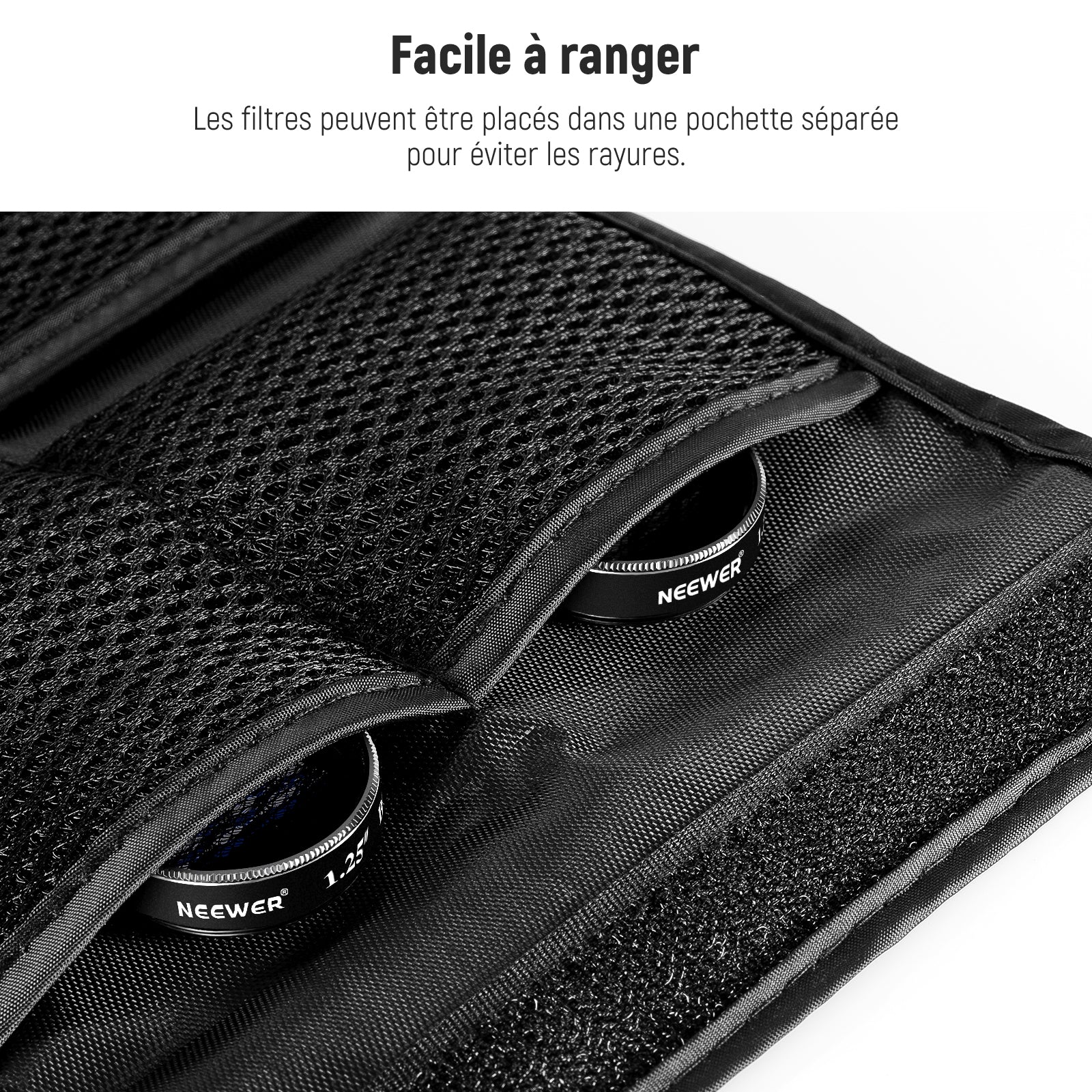 - Super mince et léger-0,16"/4mm d'épaisseur et pèse seulement 5,12oz/147g. Ce filtre ultrafin et léger ajoute un poids à peine perceptible à votre installation de tournage lorsqu'il est monté. Il suffit de le ranger dans l'étui de transport pour le conserver ou pour l'utiliser en déplacement.