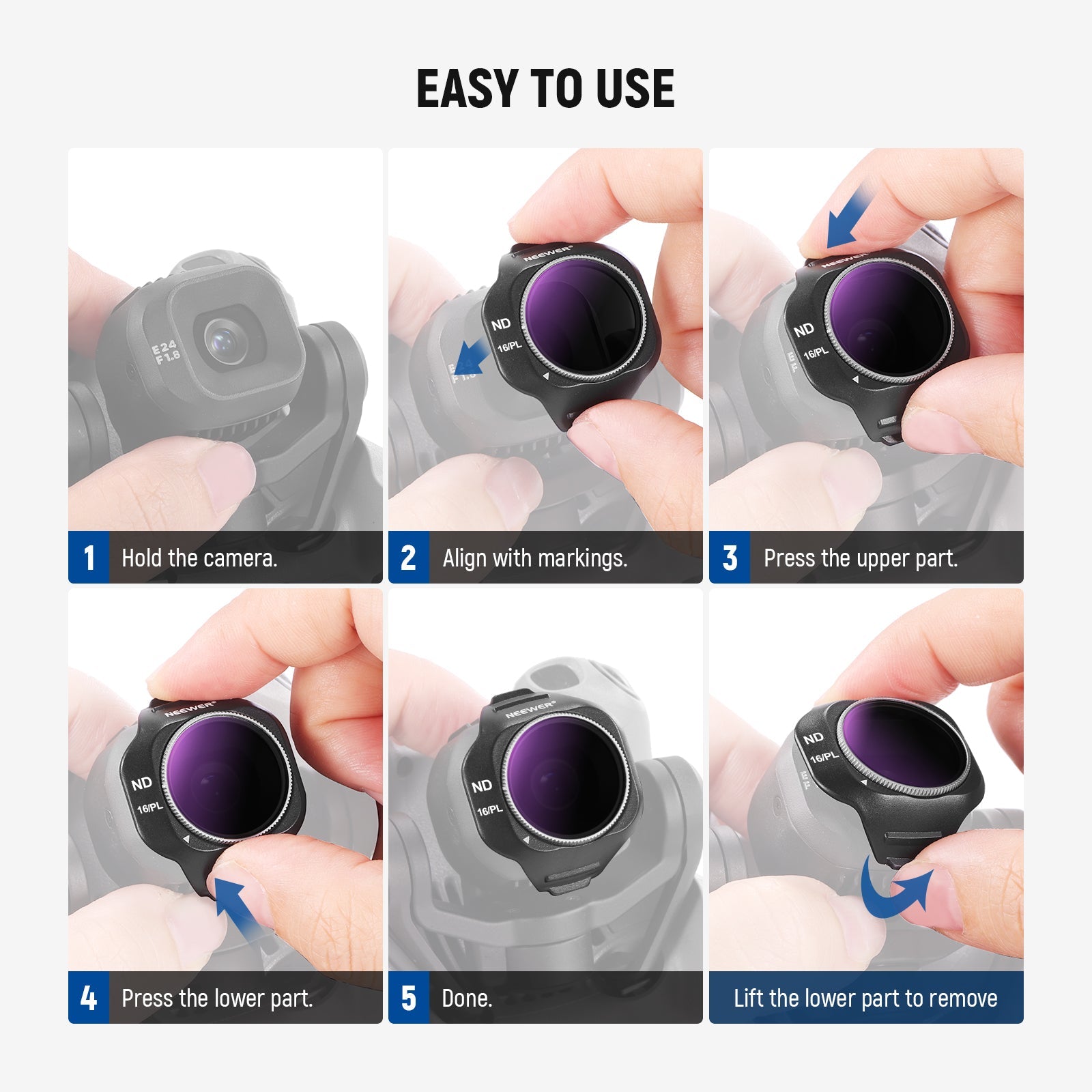 - Quick Snap On Attachment- Hold the camera, align, and snap the filter on from top to bottom until it locks in place. The 0.04oz/1g lightweight frame preserves gimbal balance and accuracy