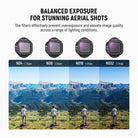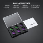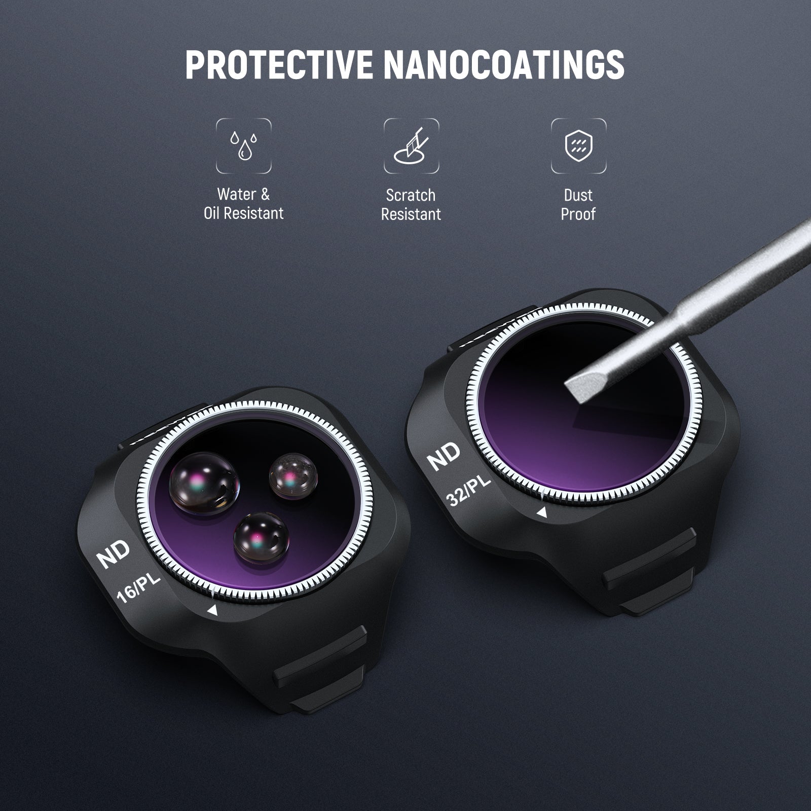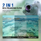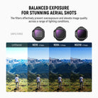 - Flexible Exposure Control- ND8, ND16, ND32, ND64 neutral density filters reduce light by 3, 4, 5, 6 stops respectively to prevent overexposure in different conditions and let you capture rivers, waterfalls, and light trails with dynamic motion blur