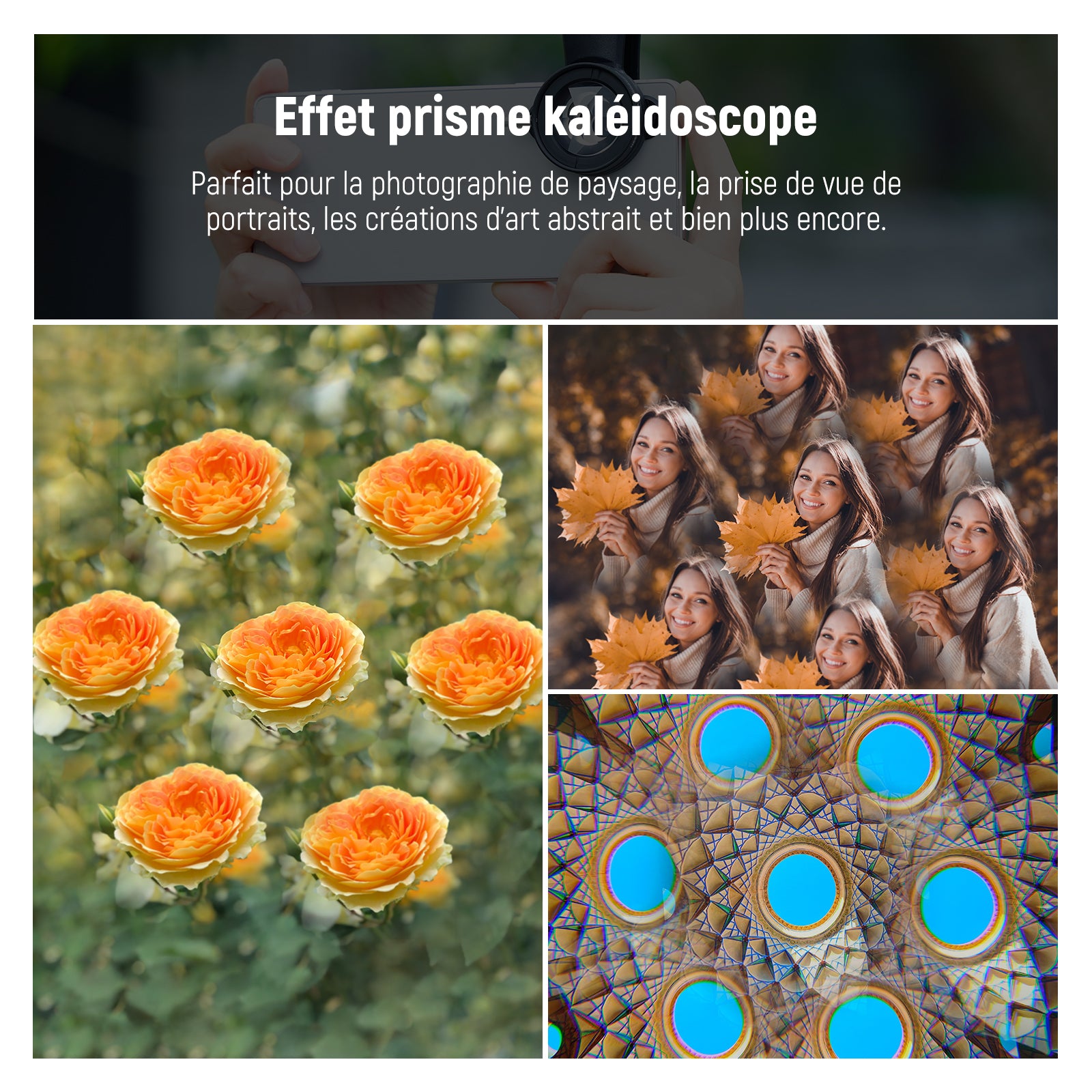 - Effet kaléidoscope créatif : le filtre à prisme kaléidoscope prévient et réfracte la lumière et crée ainsi plusieurs éléments dupliqués et circulaires dans l'appareil photo. En changeant les angles, il diffuse également la lumière et crée un effet kaléidoscope fascinant et surréaliste