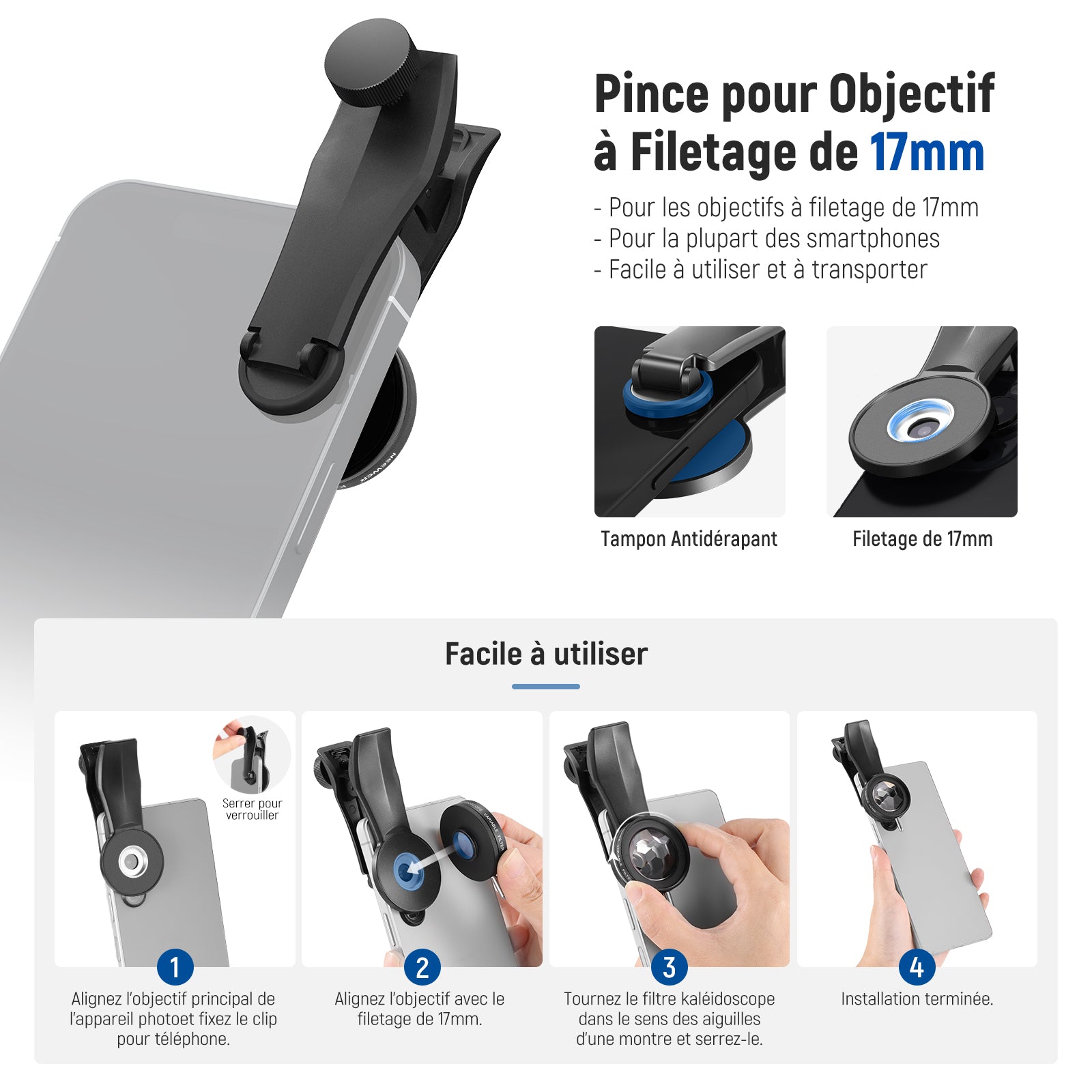 - Clip pour téléphone portable avec filetage de 17mm : avec le clip pour smartphone fourni avec un filetage de 17mm, vous pouvez fixer le filtre d'objectif sur des supports de téléphone portable, des étuis ou des plaques arrière compatibles compatibles avec les smartphones iPhone Android pour améliorer votre photographie mobile et votre vidéographie. L'accessoire indispensable pour appareil photo de smartphone pour les créateurs de contenu et les influenceurs