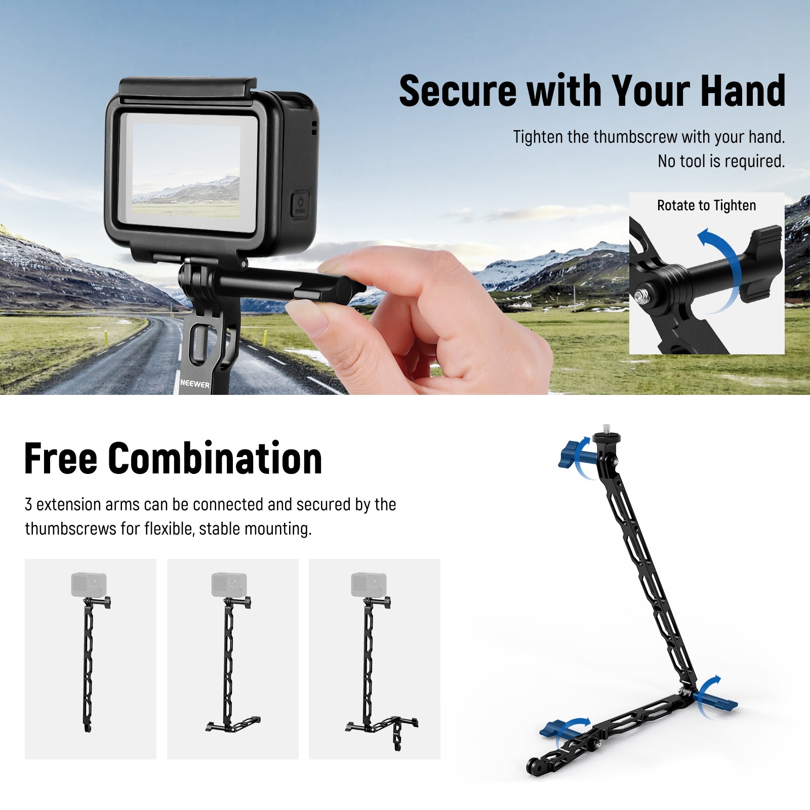 - 【Combinaison libre】 3 vis à oreilles relient les bras d'extension pour aider à obtenir les angles de caméra souhaitables. Serrez avec votre main sans l'aide d'aucun outil