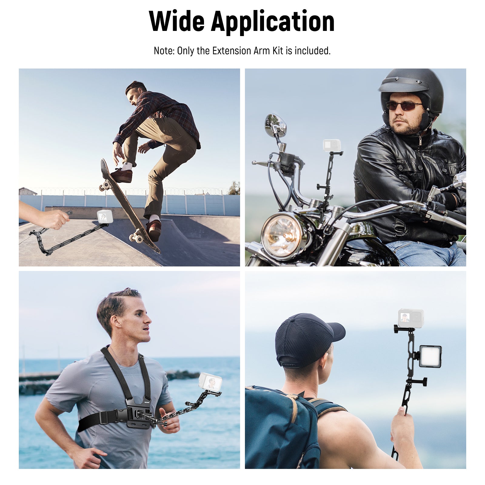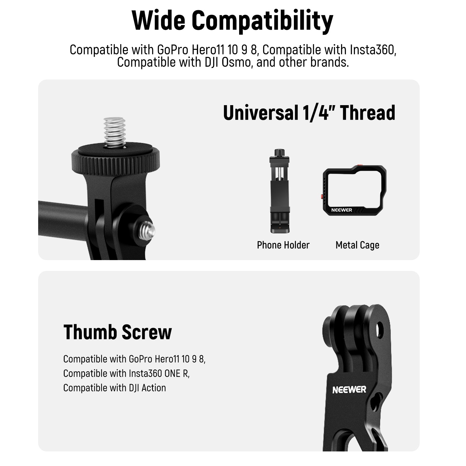 - 【Large compatibilité】Les bras d'extension sont compatibles avec GoPro Hero 13, 12, 11, 10, 9, 8, Insta360, DJI Osmo Action 5, Pro, Action 4, Action 3, Campark, AKASO, APEMAN, SJCAM et bien d'autres. Ils se fixent également aux supports de casque, trépieds et poignées via le support standard pour caméras d'action.