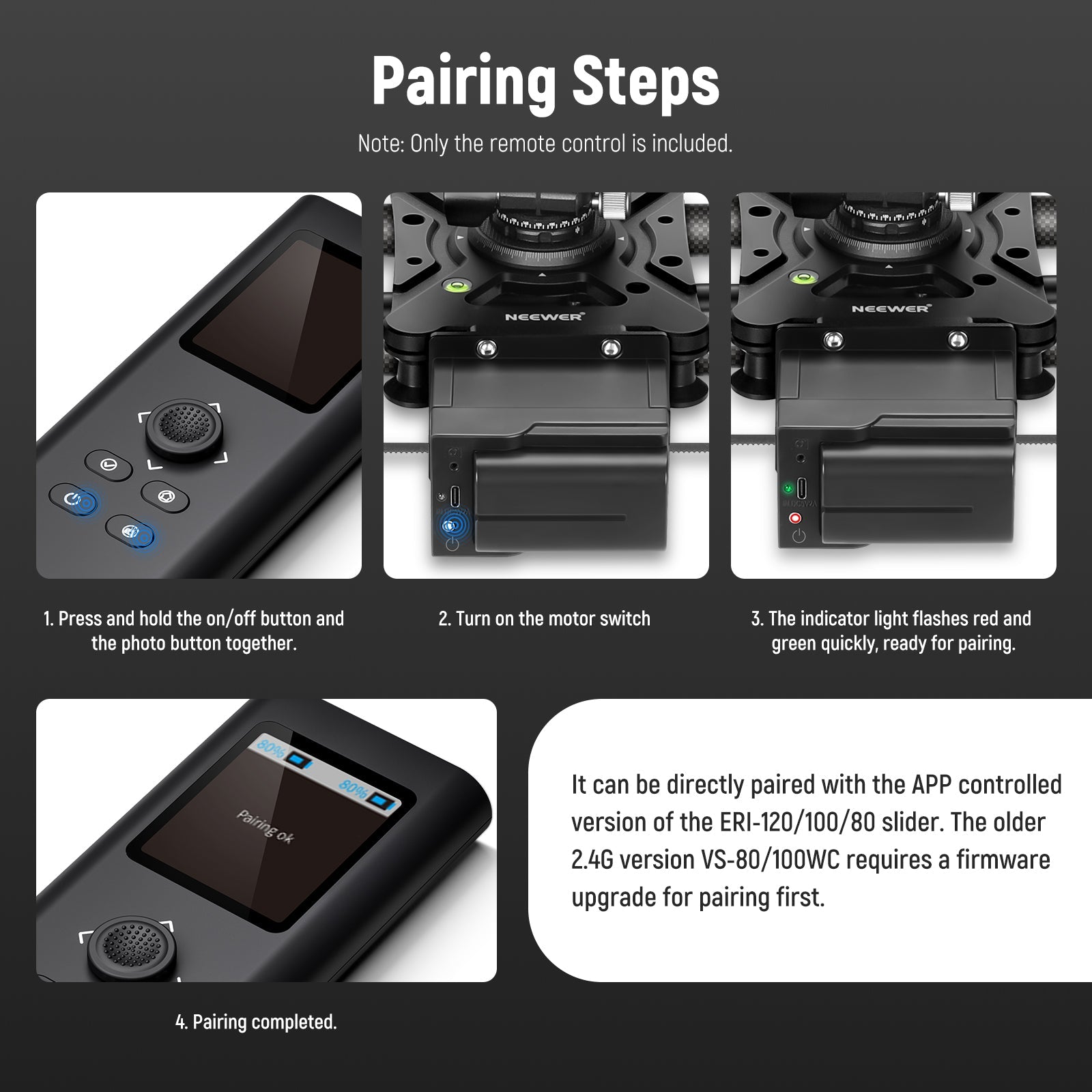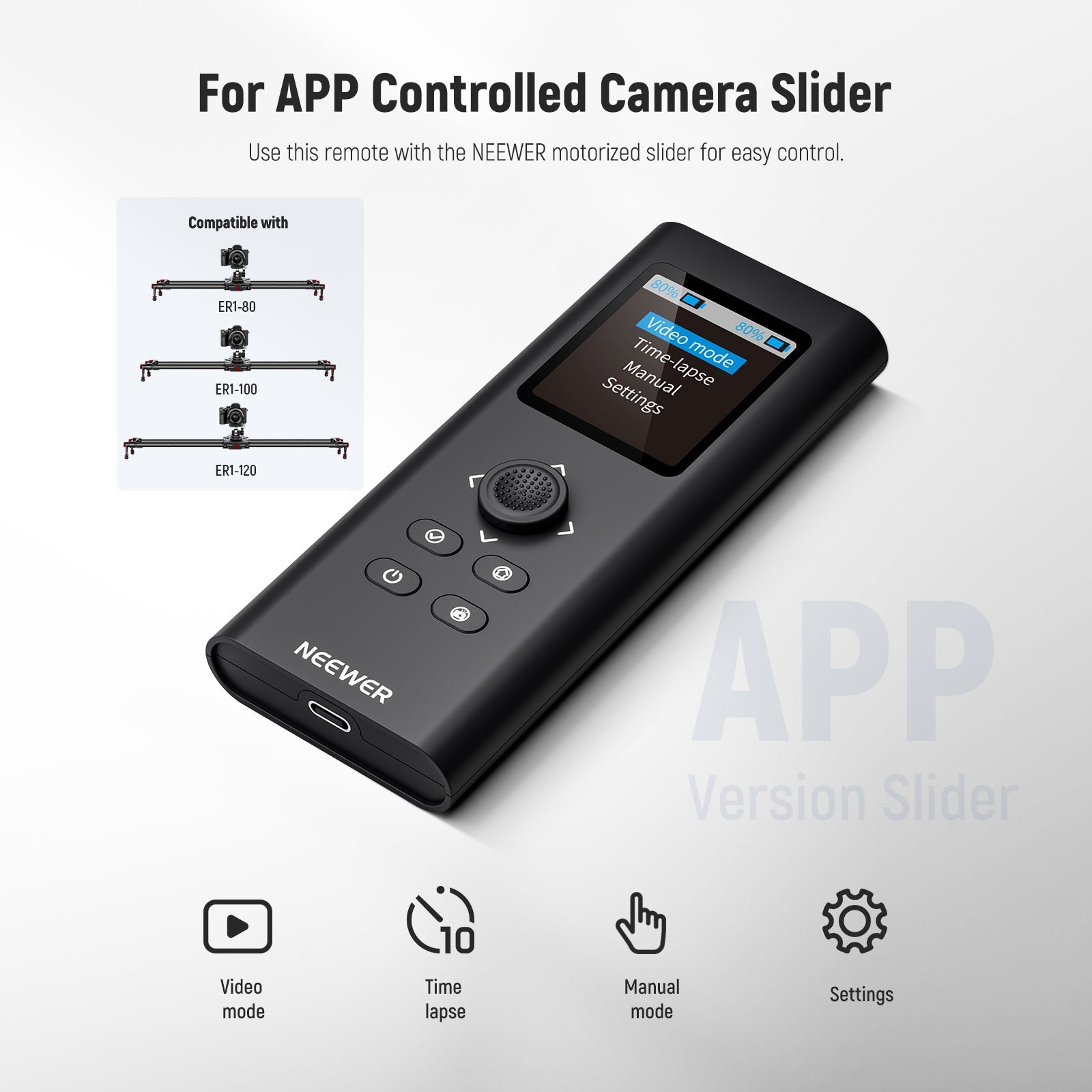 - 【Contrôle sans fil amélioré】 La commande à distance coulissante est mise à niveau pour être compatible avec VS-80WC/VS-100WC 2.4G et le curseur motorisé contrôlé par application de la série ER1. (ER1-120, ER1-100 et ER1-80). Obtenez-en un maintenant pour le coupler avec votre curseur NEEWER pour obtenir un contrôle facile