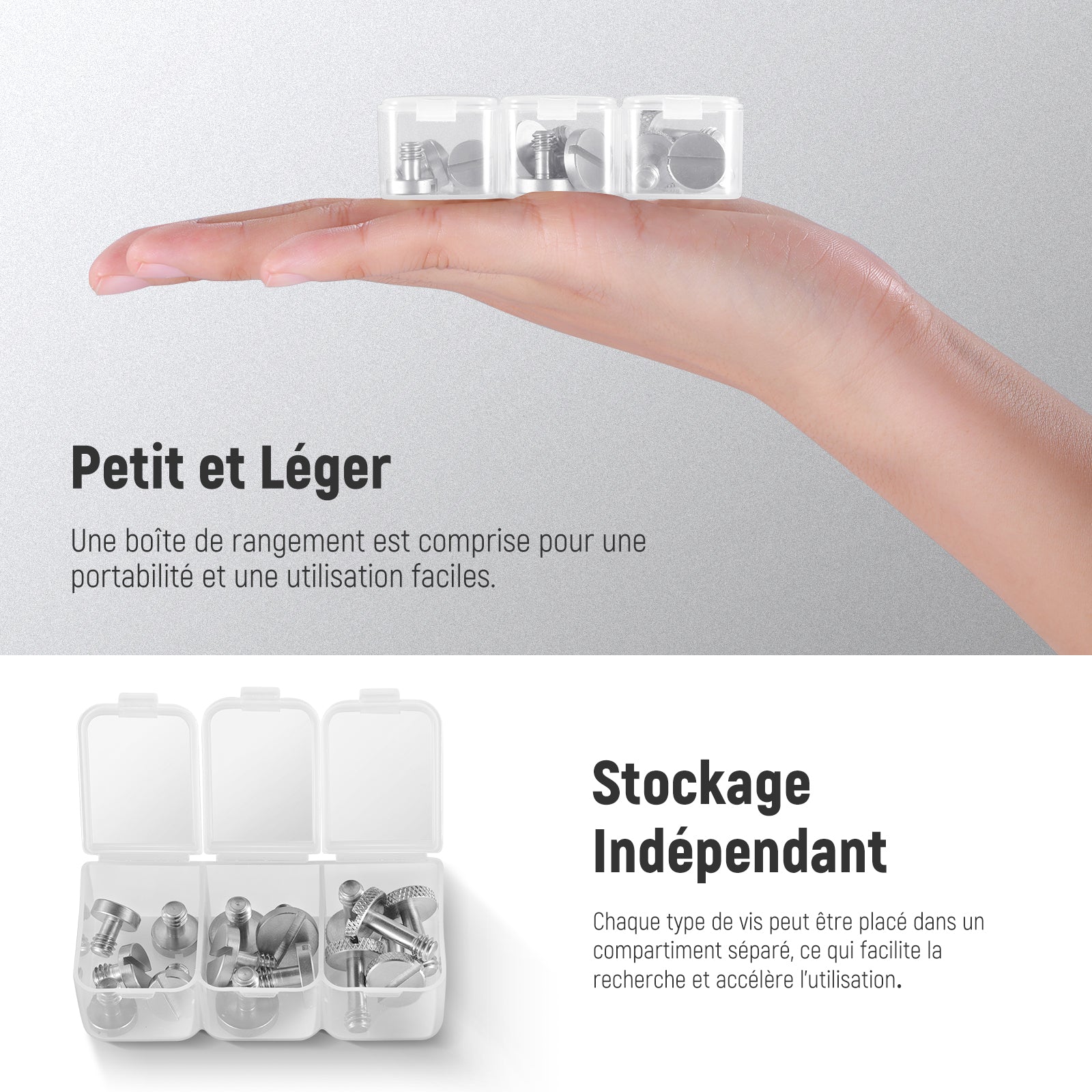 - 【Facile à Utiliser et à Transporter】 Insérez simplement la vis dans la fente centrale de la plaque à dégagement rapide et serrez à la main ou tournez avec un tournevis à tête plate (non inclus) pour la fixer fermement sur la plaque pour d'autres utilisations à dégagement rapide. 3 petits boîtes de rangement à vis inclus pour un transport et une organisation faciles.