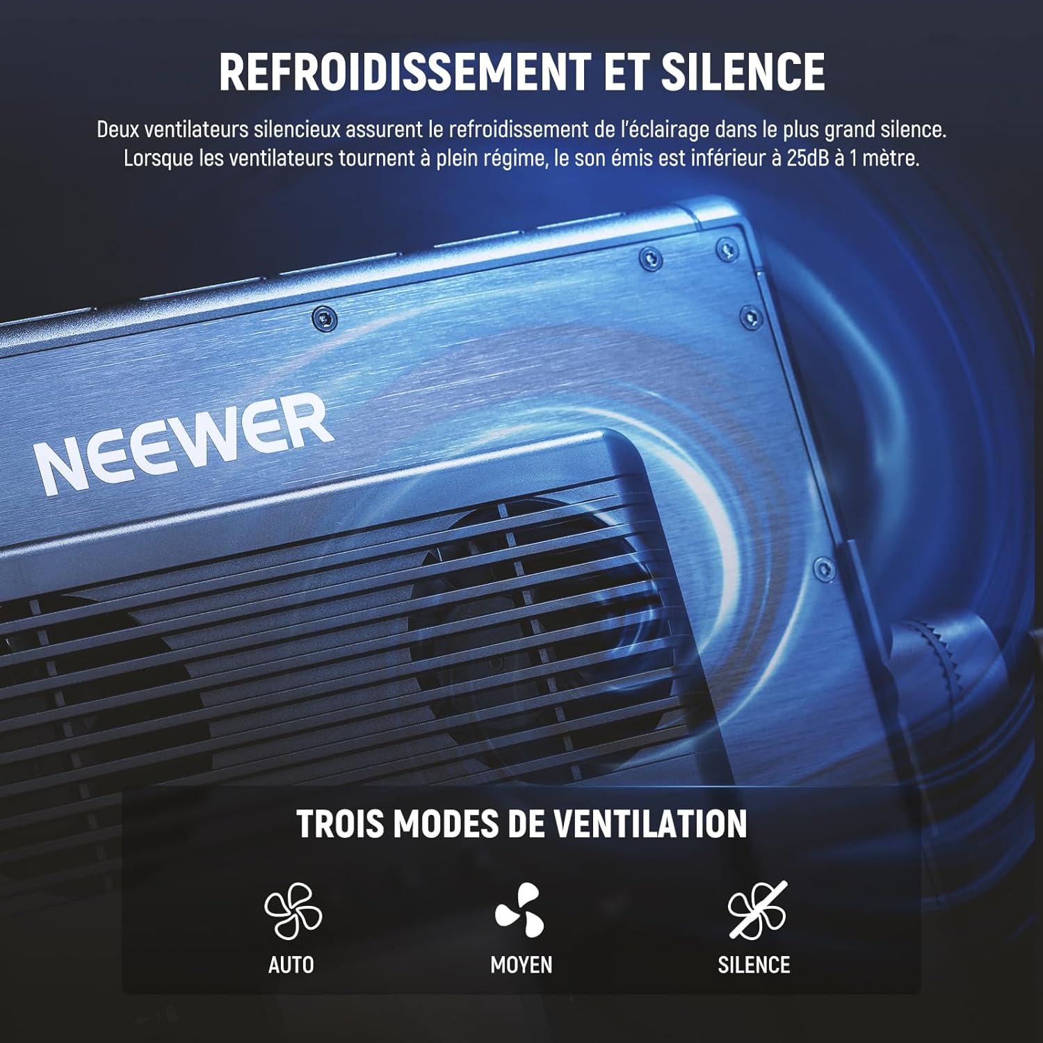 - 【Ventilateurs Silencieux et Sortie Constante】Le boîtier métallique et les deux ventilateurs silencieux assurent une dissipation efficace de la chaleur pour une durée de vie prolongée et évitent les interférences sonores même à haute puissance de sortie. Vous pouvez choisir parmi les modes Smart, Mid Speed et Silent pour maintenir la luminosité à un niveau stable et empêcher les changements de luminosité et de température de couleur de se produire.