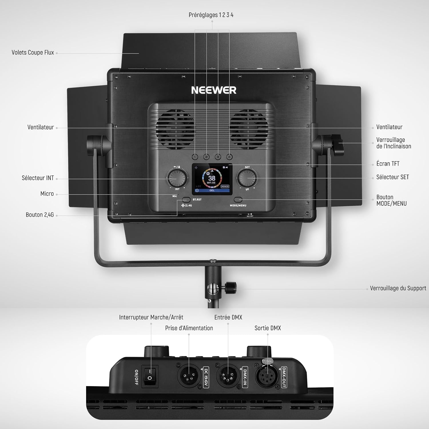 - 【Modes de Contrôle 2,4G/APP/DMX/panneau】Pour différents scénarios, cette lumière a 4 modes de contrôle d'éclairage. Le module 2,4G intégré vous permet de contrôler simultanément un groupe de lumières (y compris SL90 RGB1 RGB C80 RGB 1200 MS60C MC60B MS150B FS150B BH30S CB60B).NEEWER APP vous permet de débloquer des fonctions cachées avec smartphone. Un port DMX à 5 broches peut se connecter à une console DMX pour des configurations d'éclairage de scène complexes