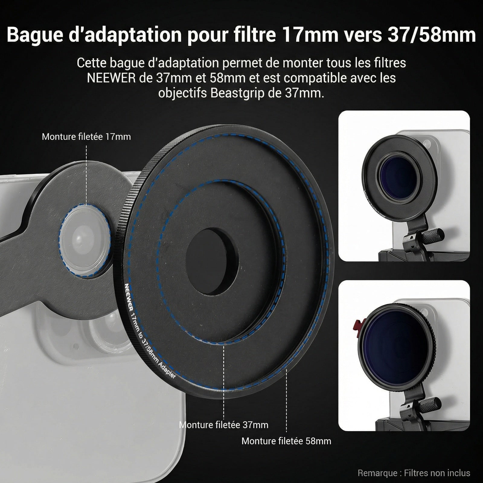 - Bague de filtre de 17 mm-37/58 mm : comprend un adaptateur de bague de filtre pour tout filtre d'objectif d'appareil photo de 37 mm et 58 mm. Également compatible avec les objectifs Beastgrip 37 mm pour un meilleur enregistrement vidéo, vlogging et diffusion en direct
