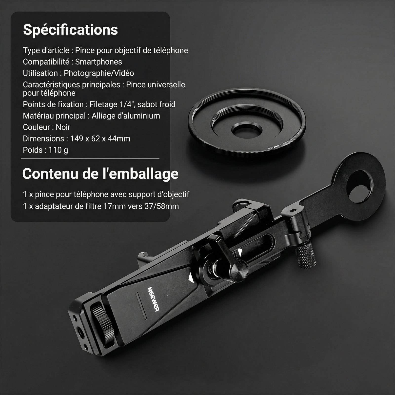 - 1 × Pince pour téléphone avec montage pour objectif
