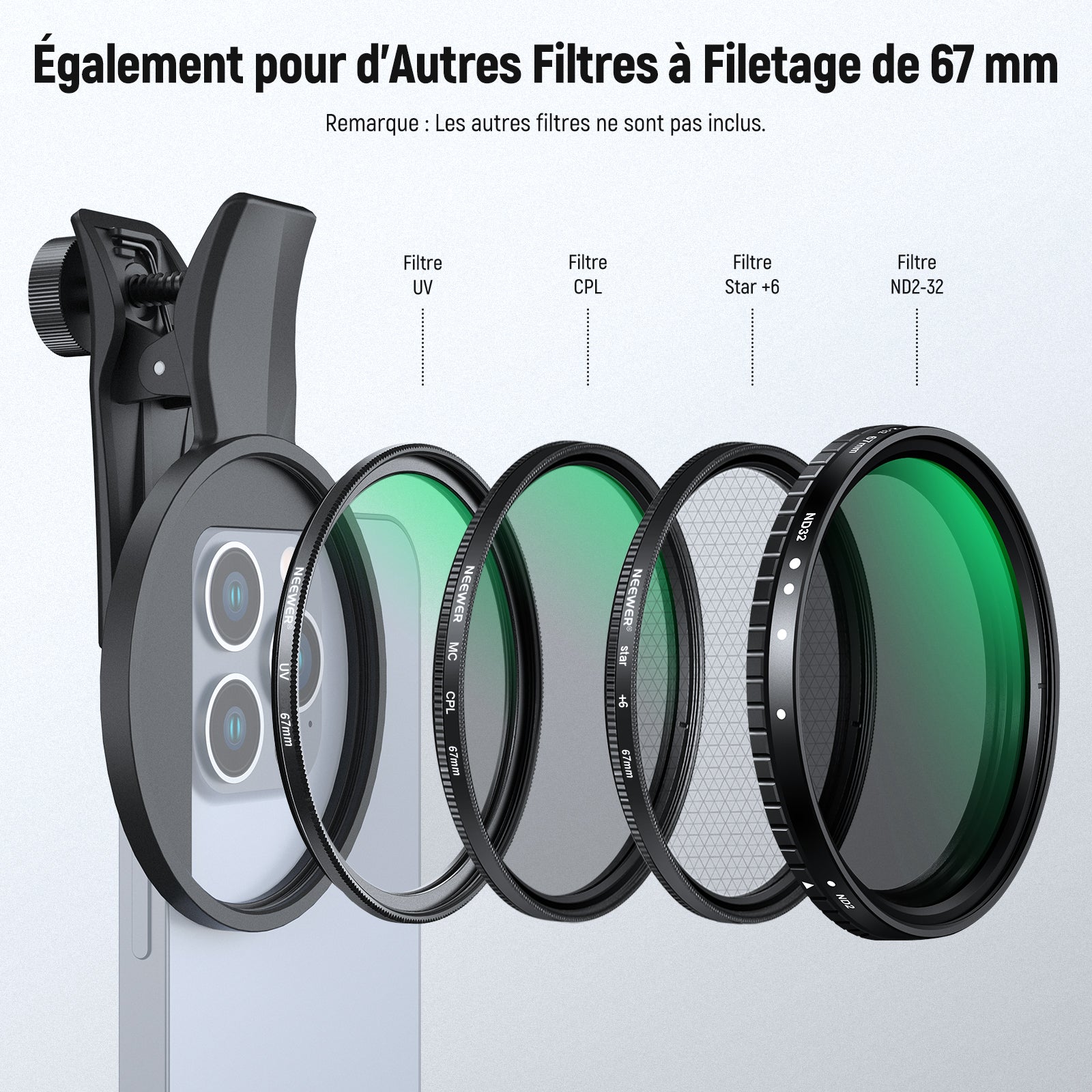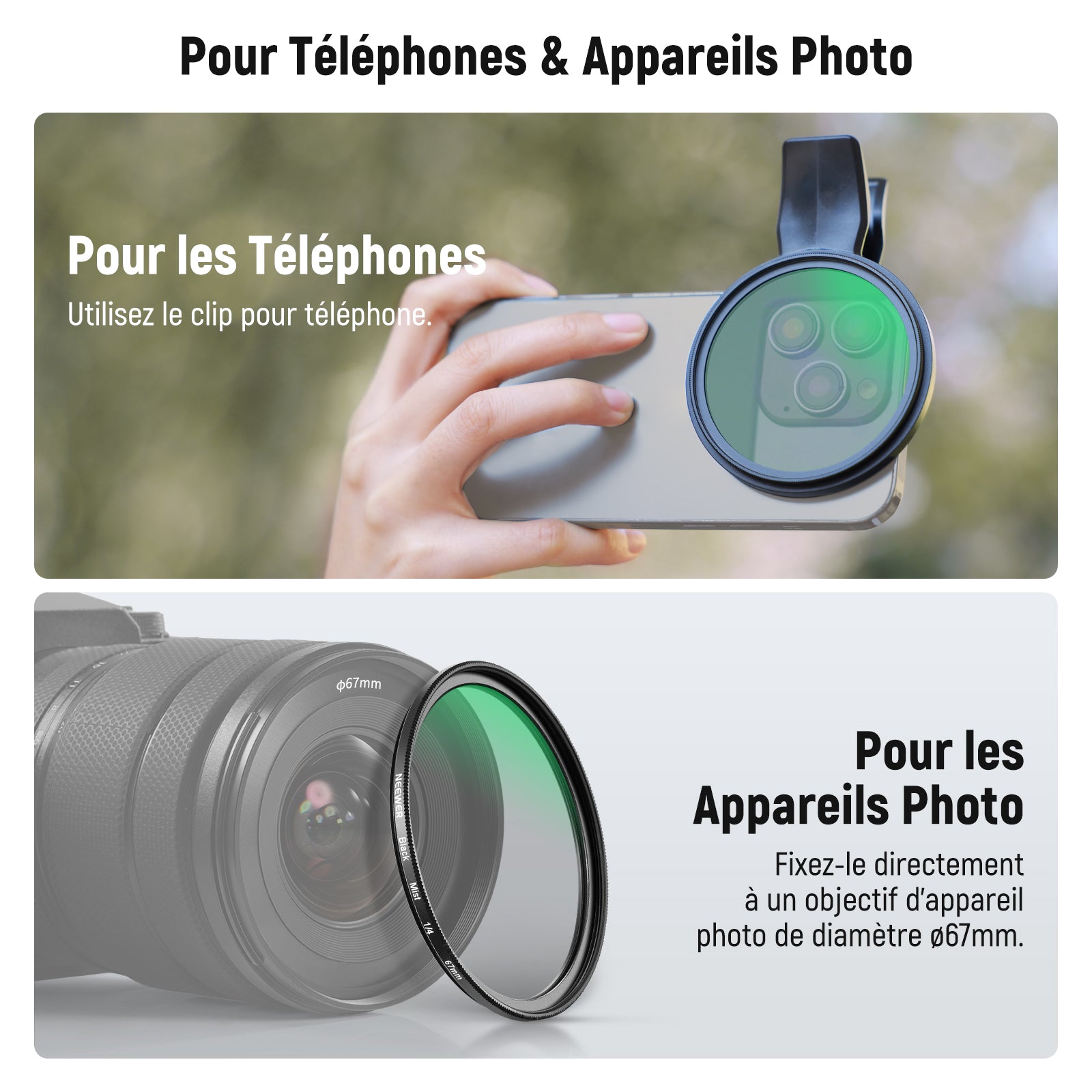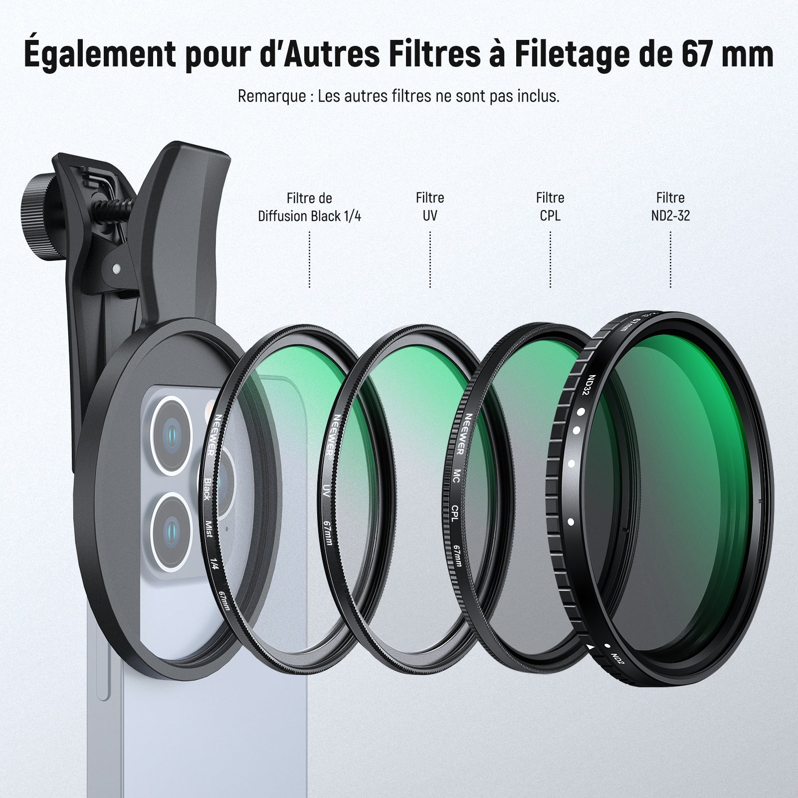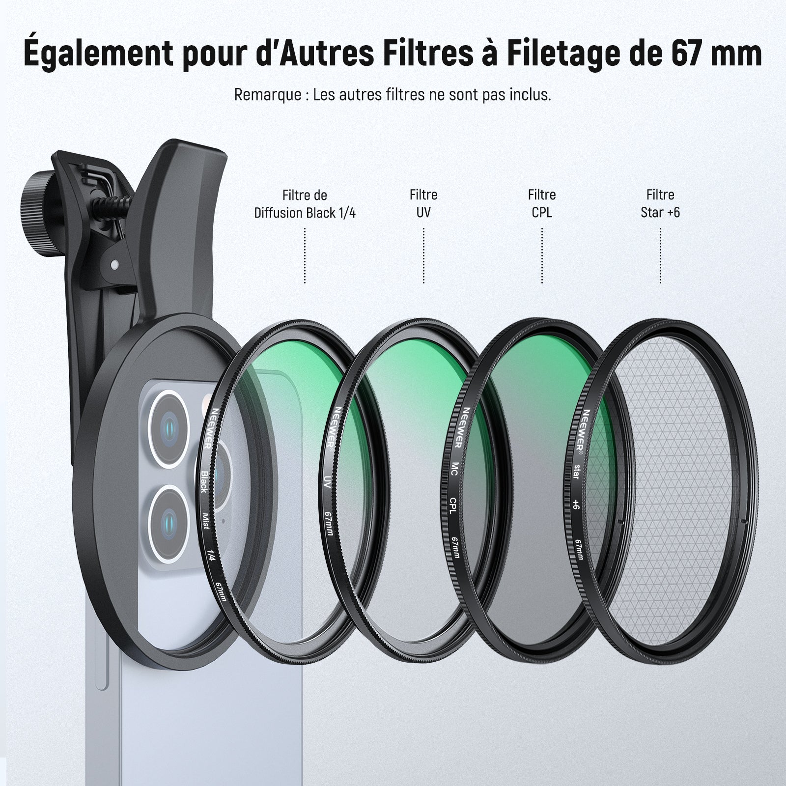 Les objectifs pour téléphone NEEWER sont utiles pour améliorer l'appareil photo de votre smartphone et rehausser votre photographie mobile. Notre collection comprend une variété d'objectifs, tels que des objectifs macro, téléobjectifs, microscopiques et fisheye. Ces objectifs sont parfaits pour la photographie de rue, de paysage, d'architecture et de groupe. Choisissez des objectifs de haute qualité pour votre appareil photo de téléphone afin de prendre des photos époustouflantes.