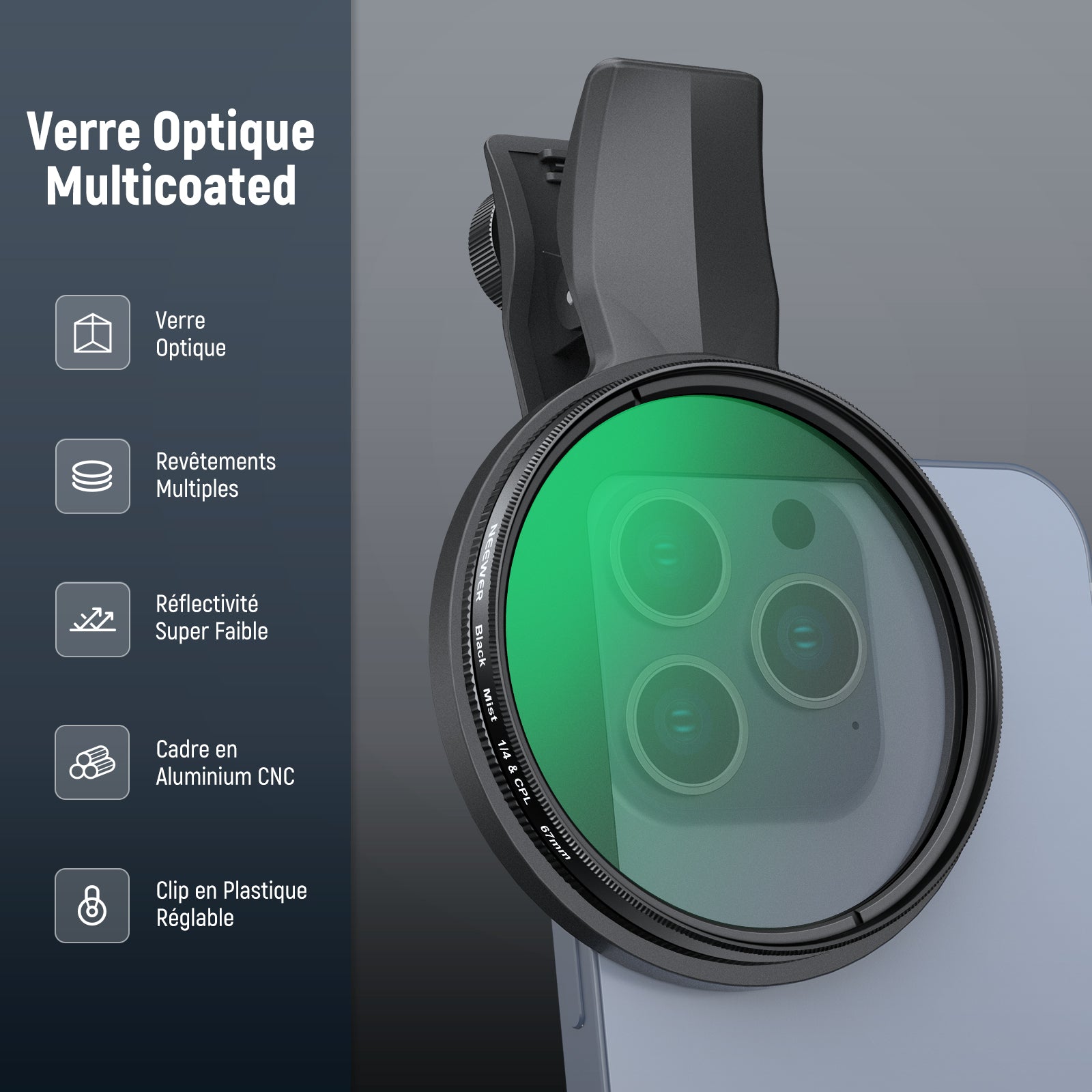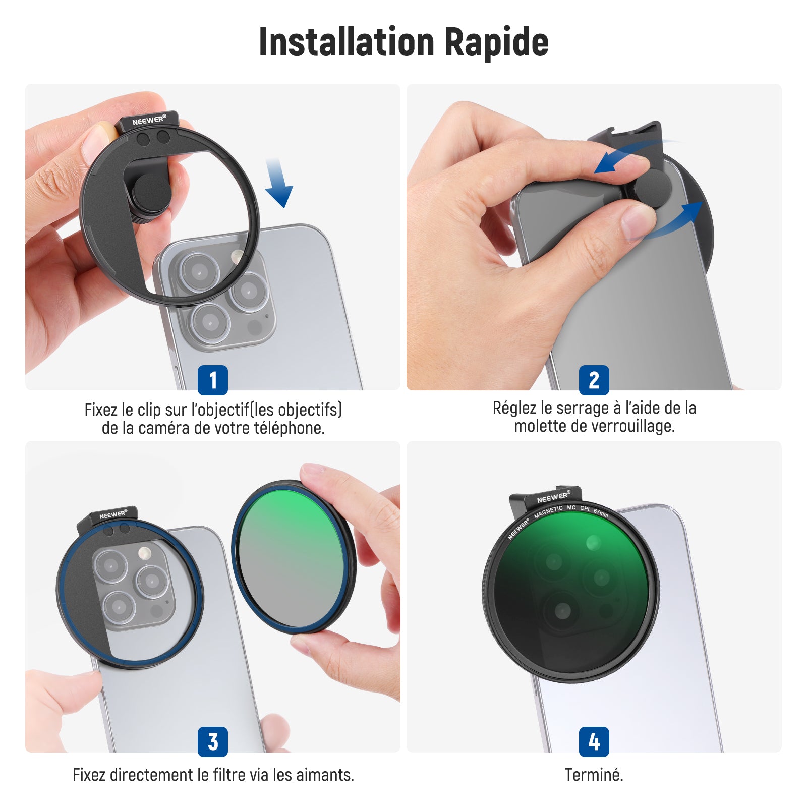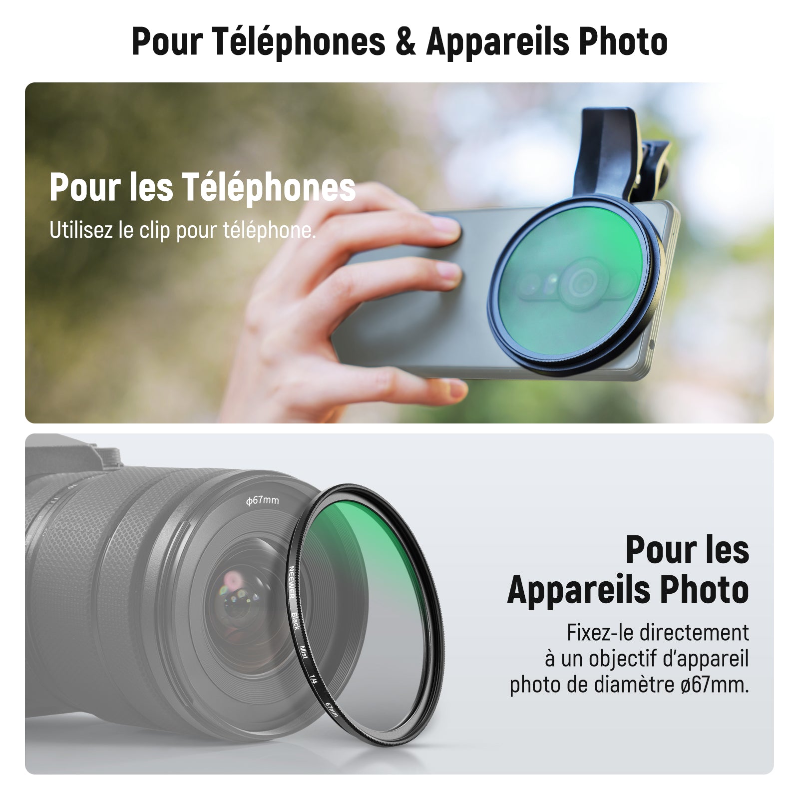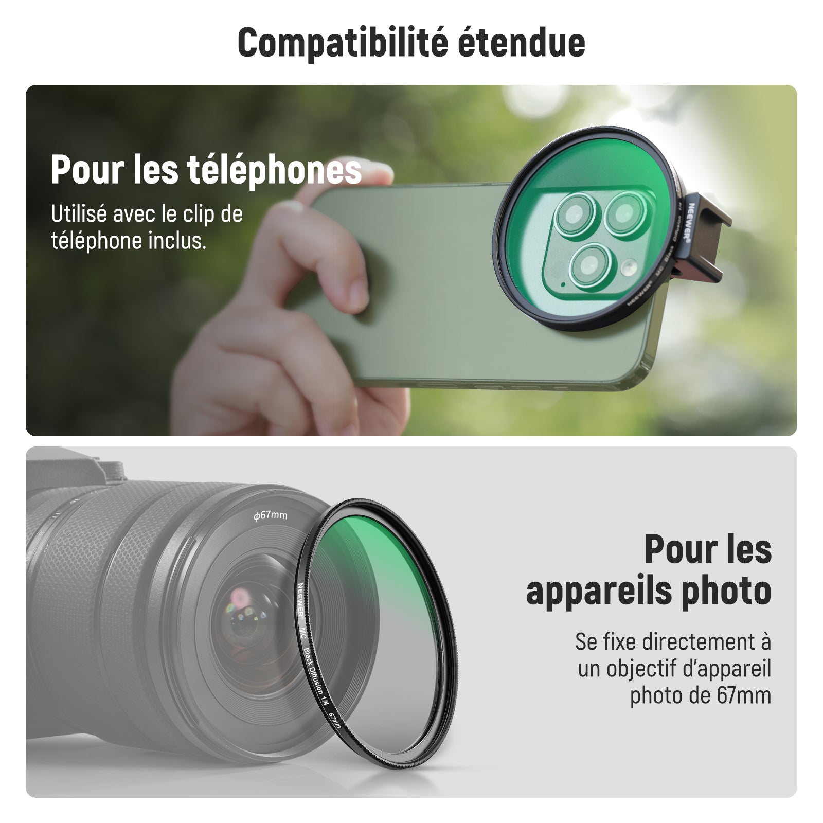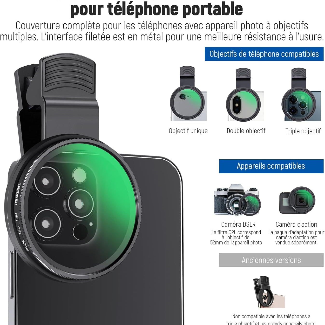 Les objectifs pour téléphone NEEWER sont utiles pour améliorer l'appareil photo de votre smartphone et rehausser votre photographie mobile. Notre collection comprend une variété d'objectifs, tels que des objectifs macro, téléobjectifs, microscopiques et fisheye. Ces objectifs sont parfaits pour la photographie de rue, de paysage, d'architecture et de groupe. Choisissez des objectifs de haute qualité pour votre appareil photo de téléphone afin de prendre des photos époustouflantes.