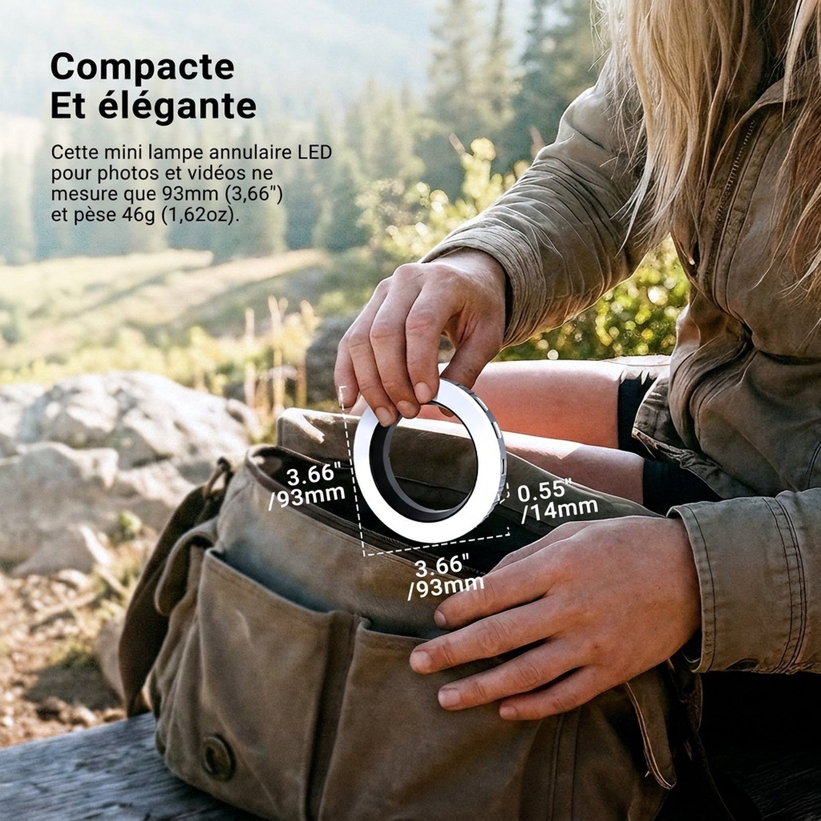 - Compact et élégant : ce mini anneau lumineux LED pour photos et vidéos ne mesure que 9,3 cm et 45,9 g. Un design esthétique et portable pour les photos et les images en déplacement, l'éclairage de photographie d'appareil photo professionnel, les selfies, l'enregistrement vidéo, les maquilleurs de voyage, etc.