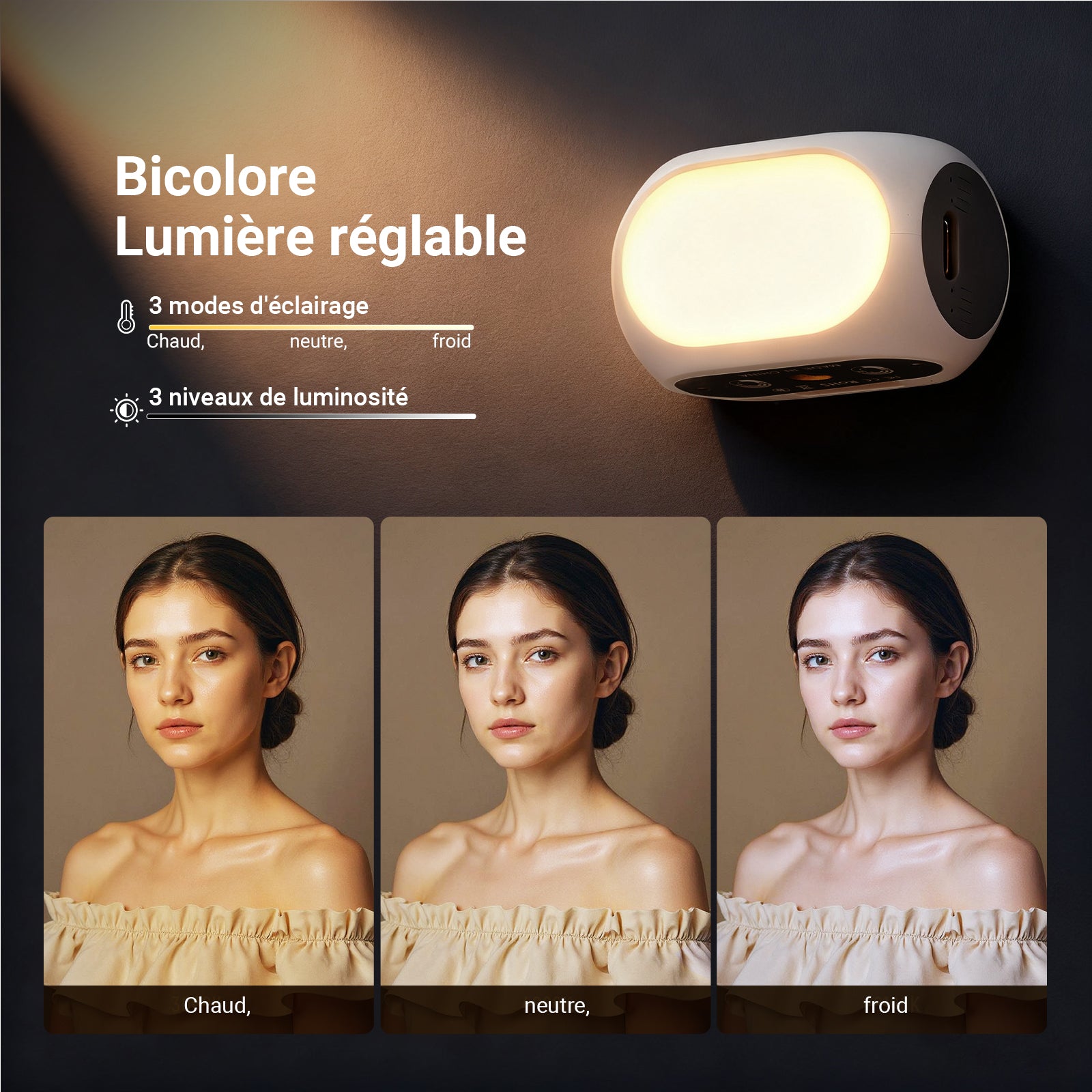 • 【Mini lampe réglable】 Cette lampe d'appoint pour téléphone et appareil photo ne mesure que 5 x 3,3 x 3,3cm. Elle est équipée de 40 LED bicolores pour un éclairage doux et lumineux, avec 3 modes d'éclairage, 3 niveaux de luminosité et un CRI élevé (90+) pour sublimer toutes les carnations et garantir des couleurs fidèles