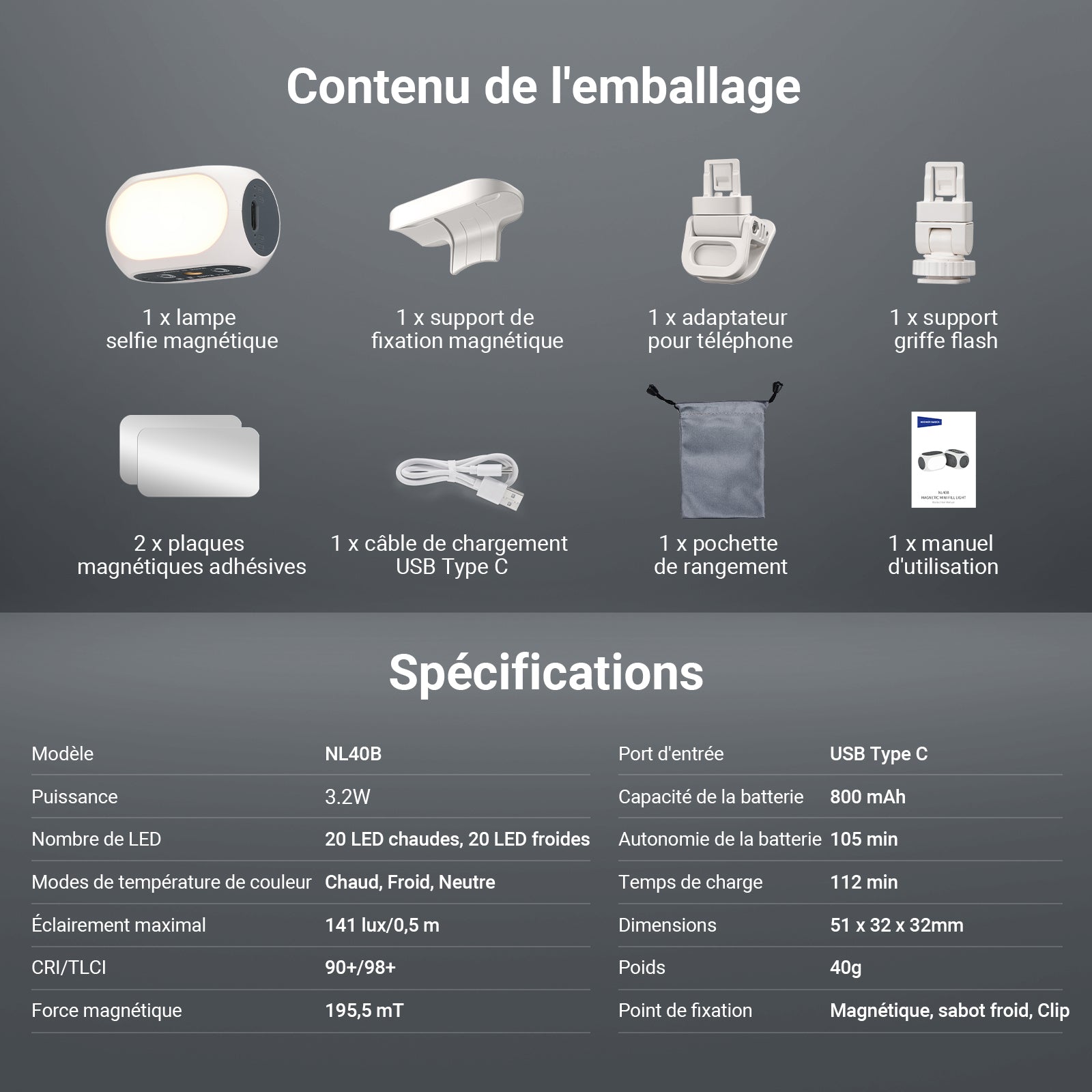 • 1 × Lumière selfie magnétique
