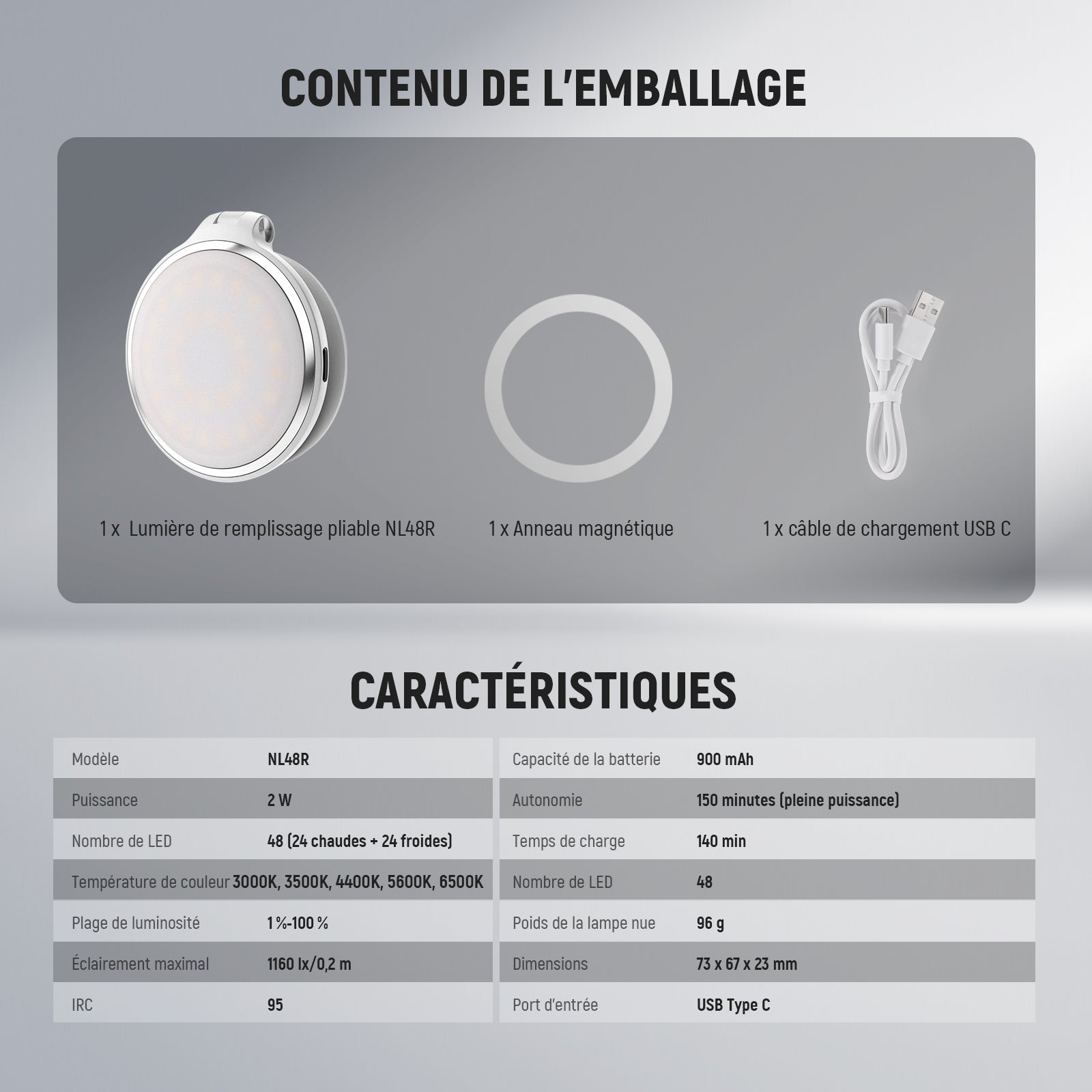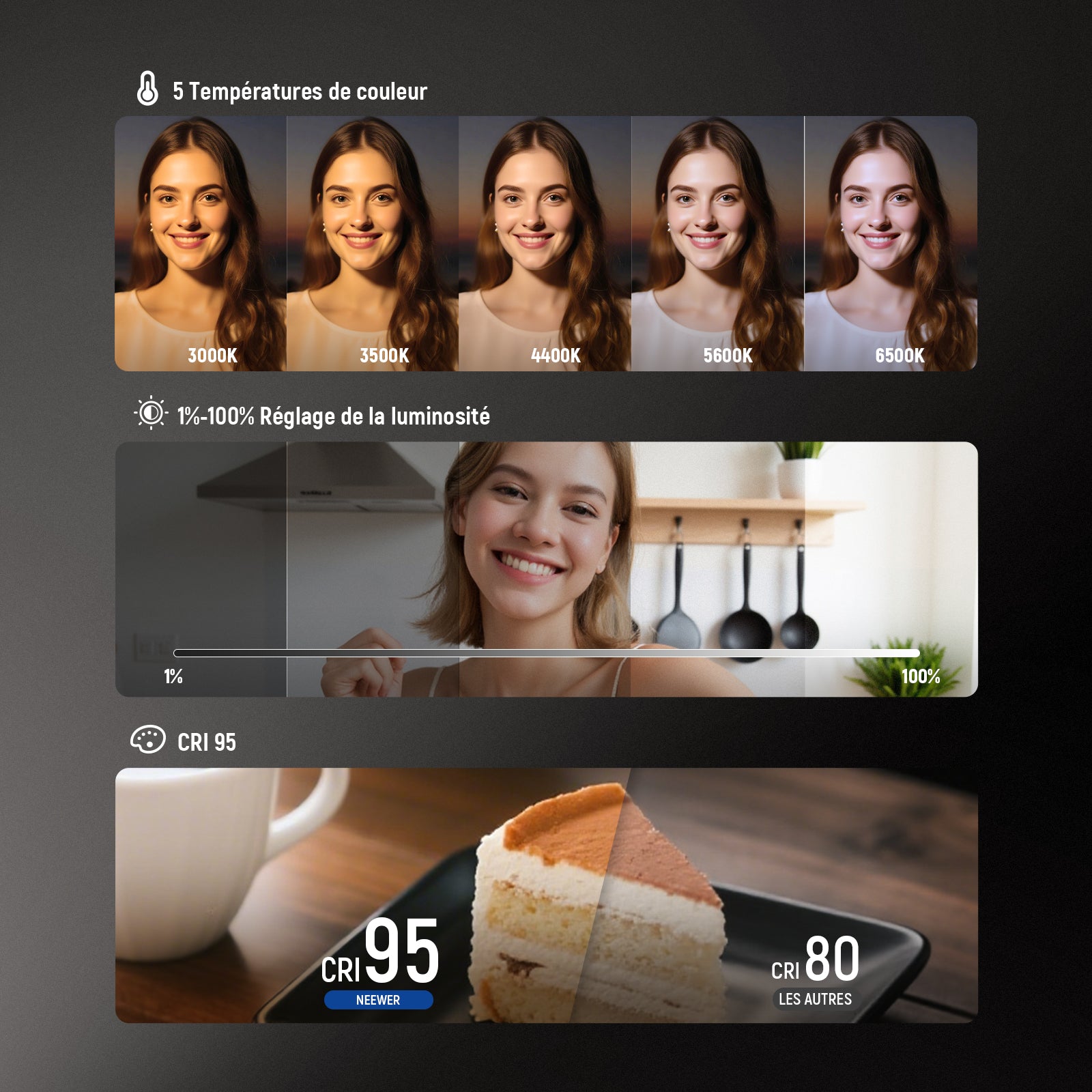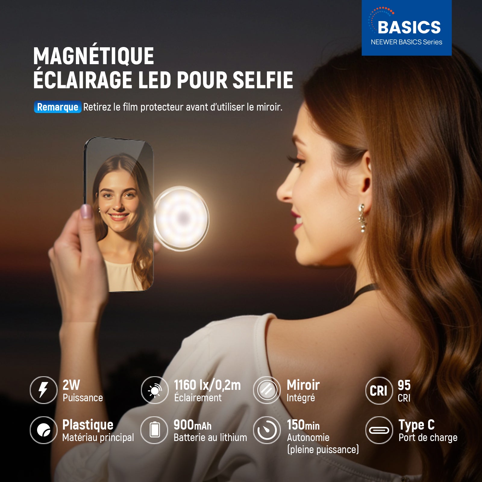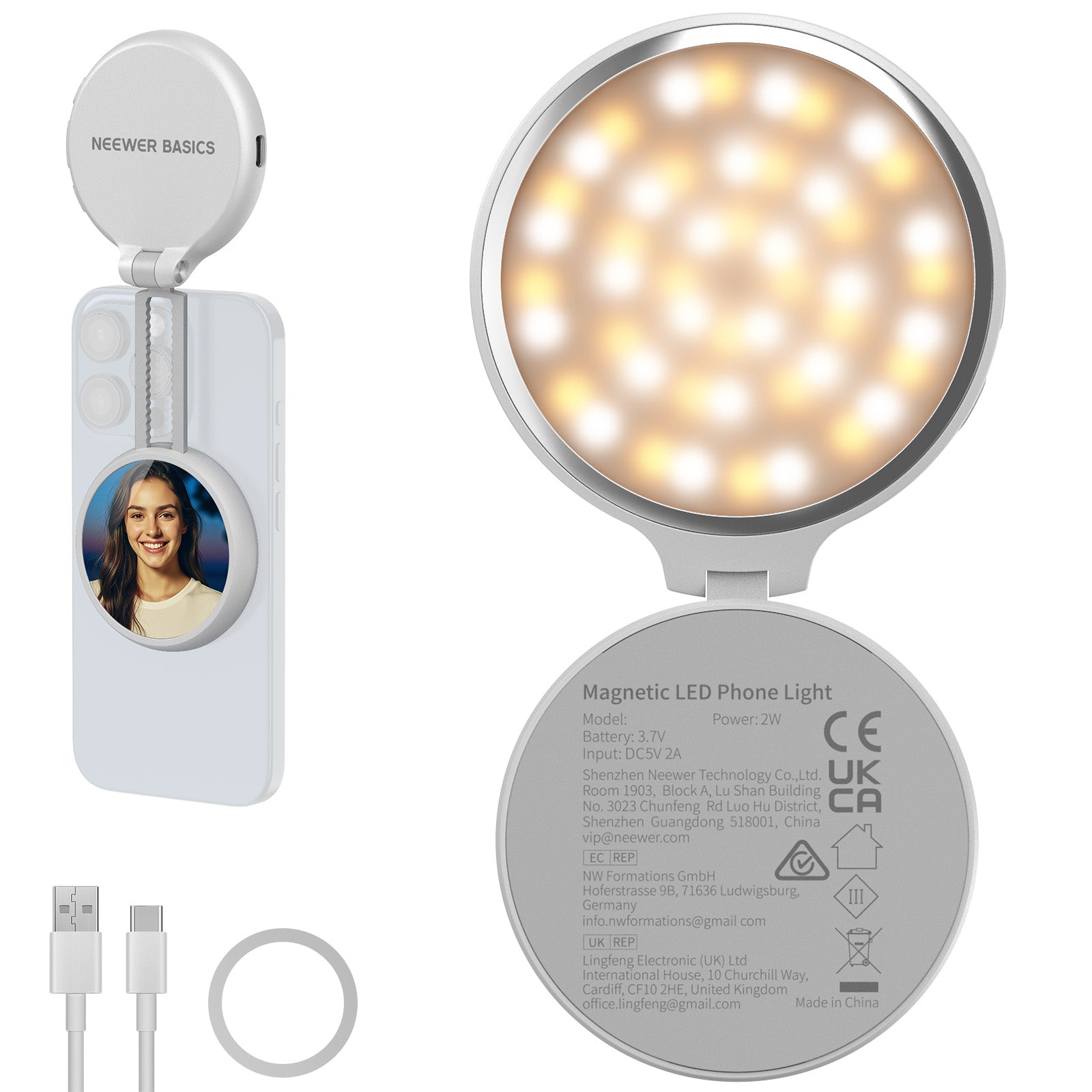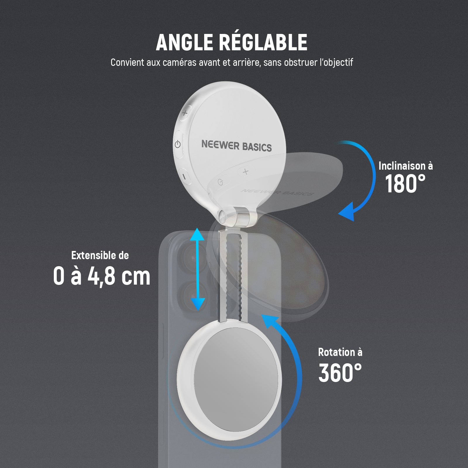 - 【Présentation de NEEWER BASICS】Simple et pratique,NEEWER BASICS est une ligne de produits économique qui se concentre sur les fonctions et les designs essentiels, sans éléments superflus.NL48R est un spot selfie pour téléphone ultra compact et portable,avec 48 LED de haute qualité qui fournissent un éclairage de 1160lx/0,2m,température de couleur et luminosité réglables et CRI95,conçu pour améliorer le teint et réduire les imperfections du visage pour vous faire paraître au mieux