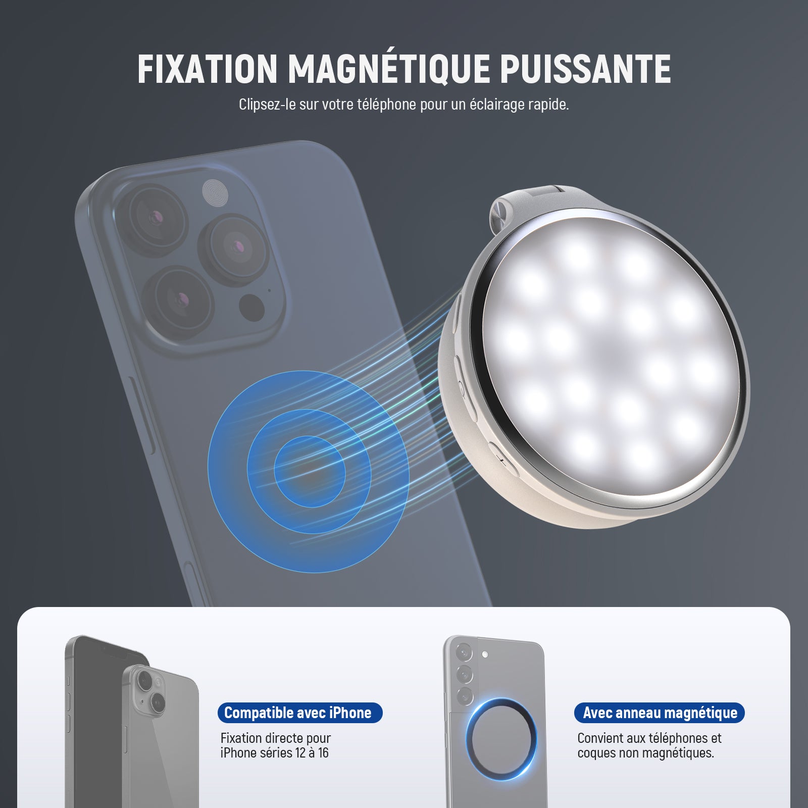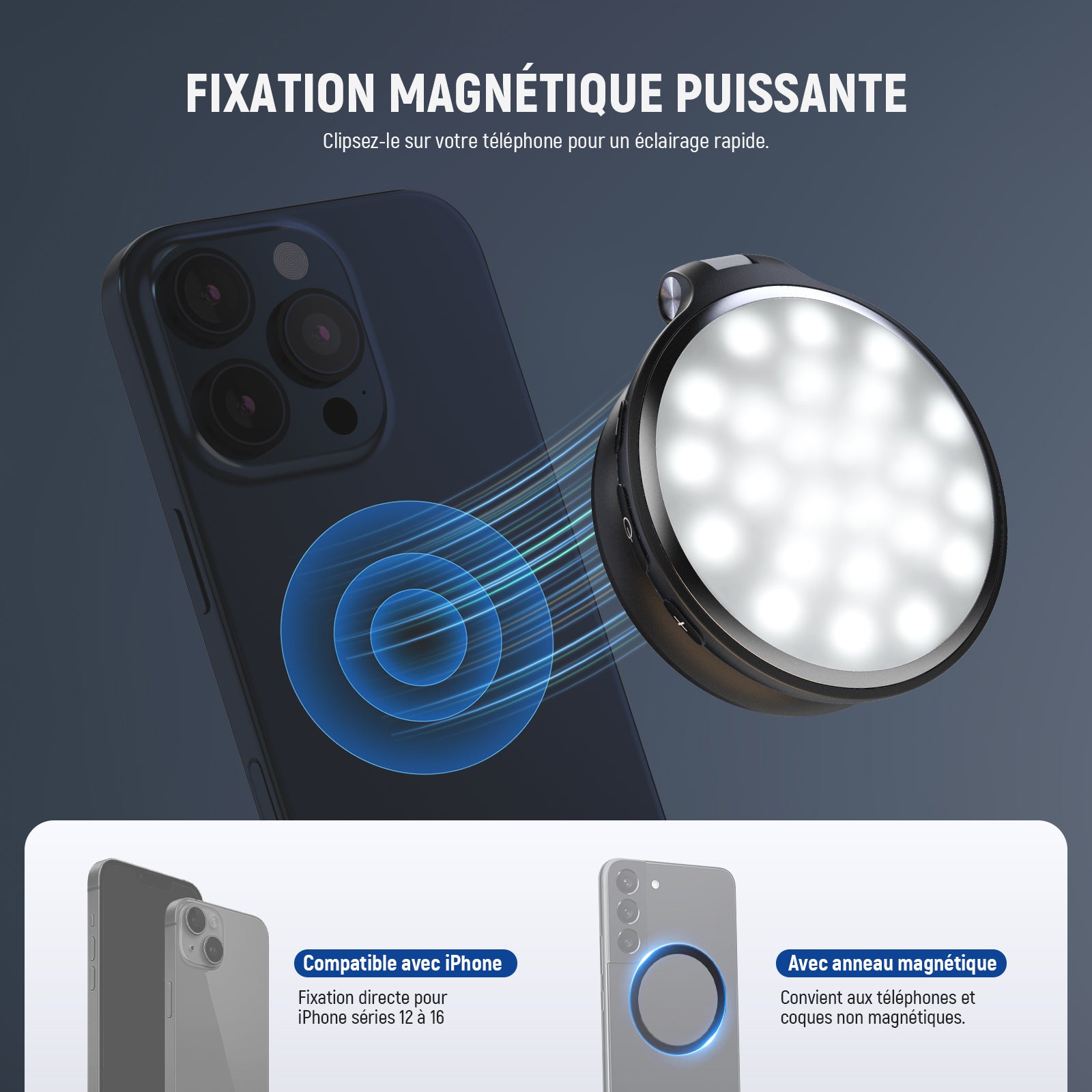 - 【Fixation magnétique rapide et angle réglable】La mini lumière de remplissage avec forte force magnétique est compatible avec MagSafe iPhone 16 Pro Max Plus 15/14/13/12 Mini MacBook Air. Pour les appareils non magnétiques, appliquez l'anneau magnétique adhésif inclus pour une installation sur les téléphones, ordinateurs portables Android, compatible avec iPad Pro Samsung Galaxy S25 S24 S23 Ultra etc.La lumière selfie prend en charge l'inclinaison verticale et l'extension en hauteur