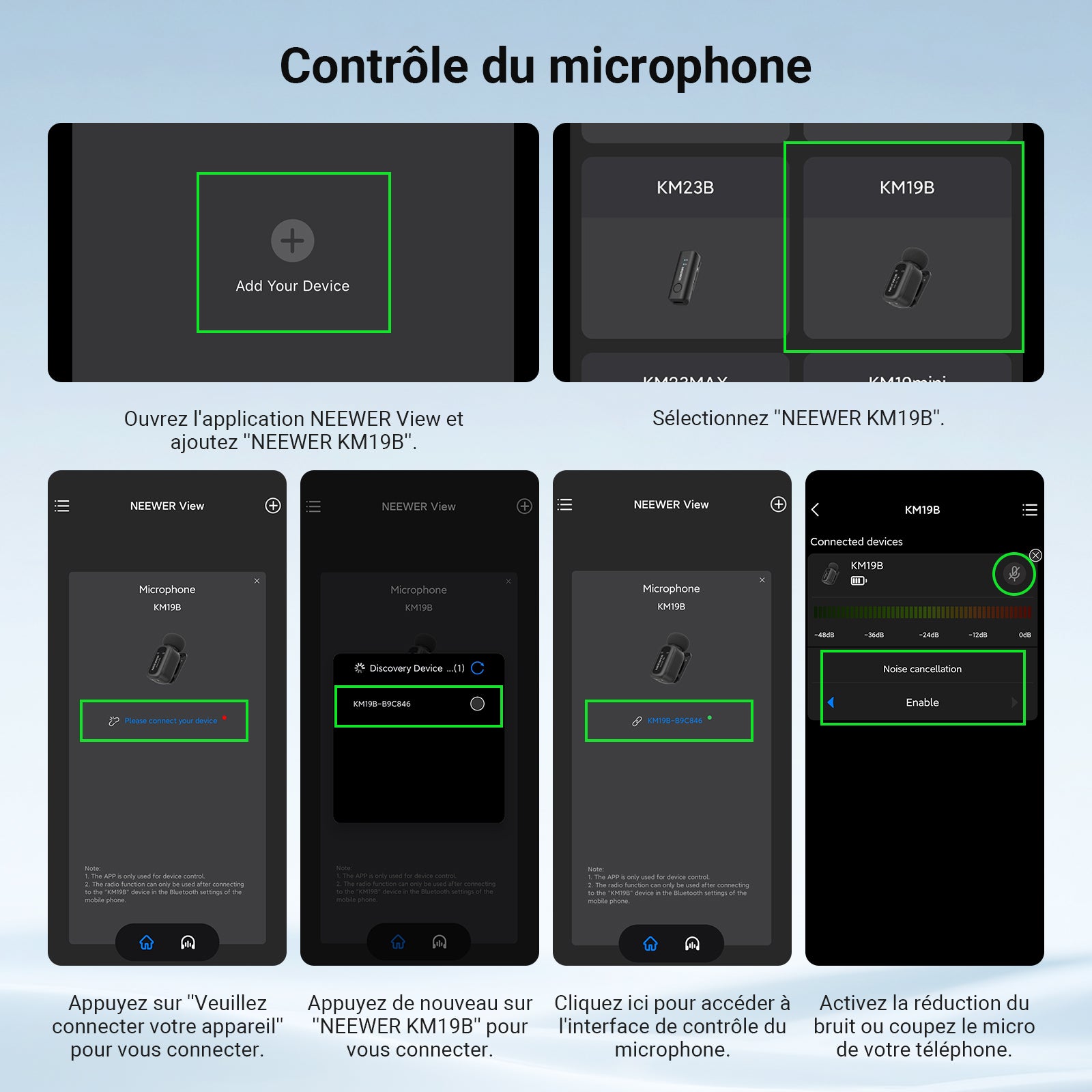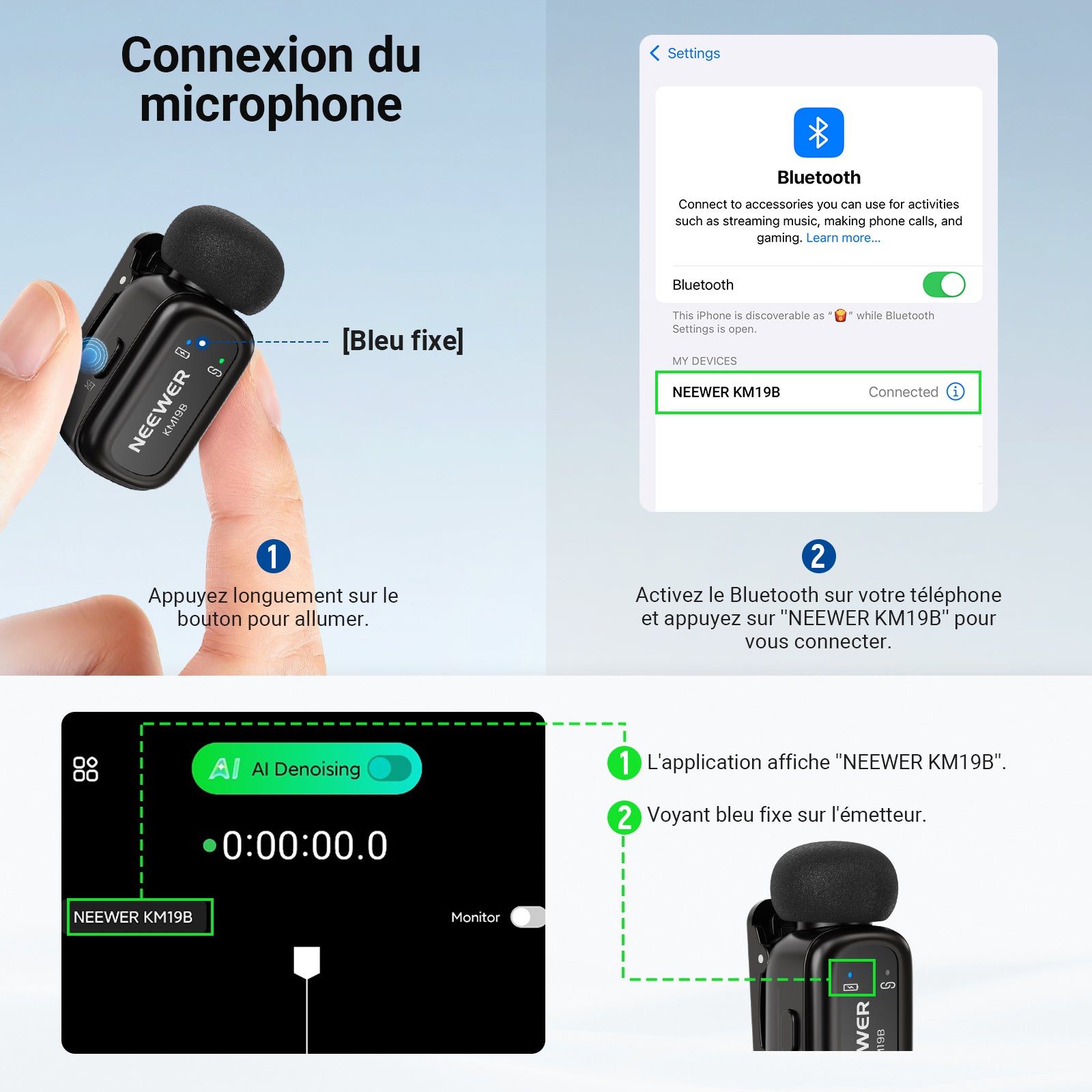- 【Connexion sans fil facile】 Appuyez longuement sur le bouton d'alimentation pour allumer l'émetteur (voyant bleu clignotant). Recherchez ensuite "KM19B" sur votre téléphone pour vous connecter. Une fois connecté, ouvrez l'application NEEWER View et vérifiez que "KM19B" apparaît bien en haut à gauche. Utilisez l'enregistreur intégré de l'application pour capturer l'audio, ou laissez l'application tourner en arrière-plan lorsque vous enregistrez avec d'autres applications
