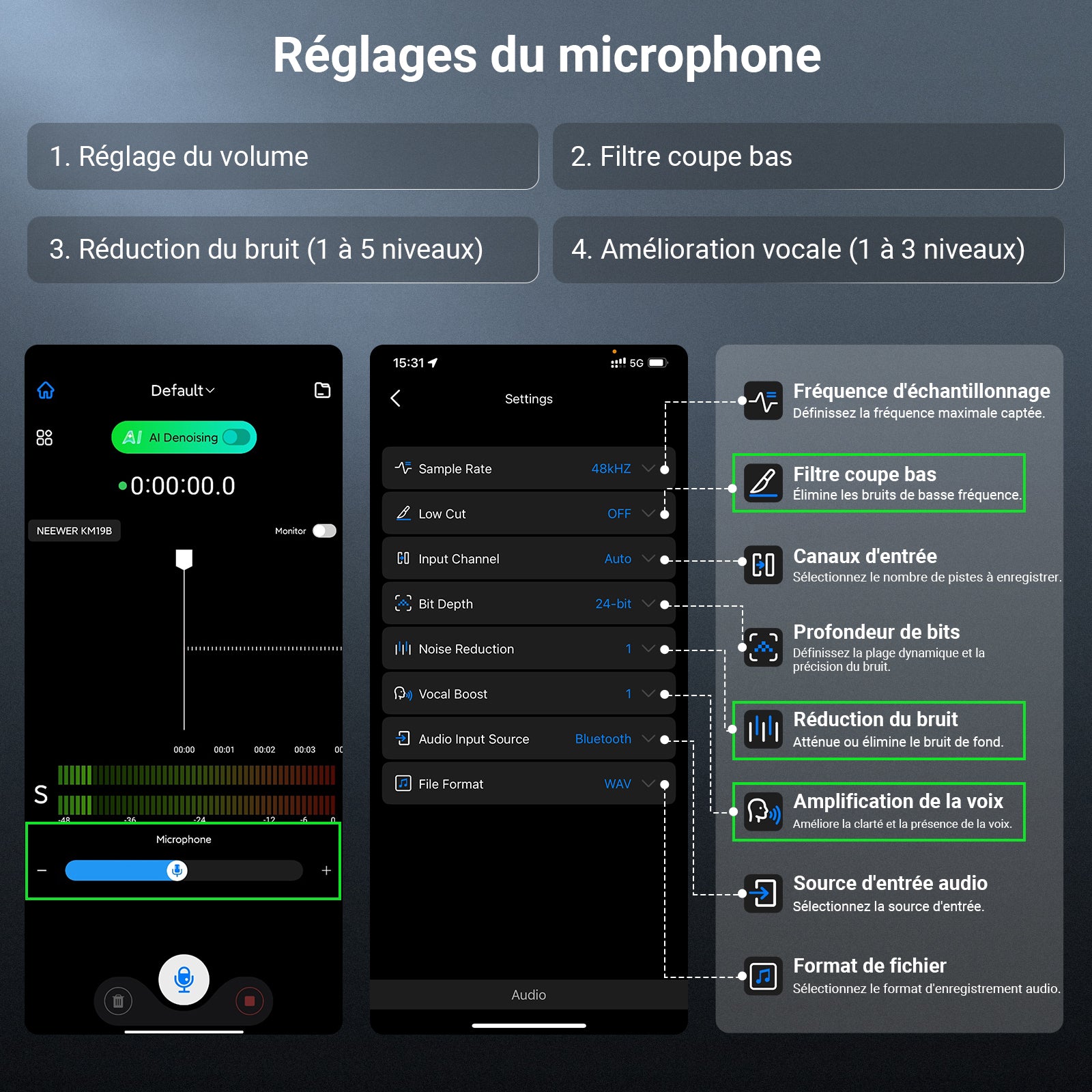 - 【Réduction intelligente du bruit】 L'émetteur omnidirectionnel est doté d'une réduction du bruit, d'une fréquence d'échantillonnage de 16 bits, d'une réponse en fréquence de 20 Hz à 8 kHz et d'un rapport signal/bruit de 76 dB pour un son clair et naturel. Pour un contrôle avancé, l'application NEEWER View propose 5 niveaux de réduction du bruit, 3 niveaux d'amélioration vocale, une coupure des basses à 75 Hz, 150 Hz et 300 Hz, et prend en charge les formats audio MP3, WAV et AAC