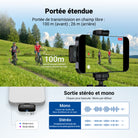 - 【Autonomie prolongée de 30h】 Une fois complètement chargées, chaque émetteur fonctionne en continu pendant 6 heures. L'étui de chargement permet une recharge complète 1,5 fois, offrant ainsi une autonomie totale de 30 heures pour une journée d'enregistrement. Portée de transmission en zone dégagée : 300'/100m (avant) ; 85'/26m (arrière)