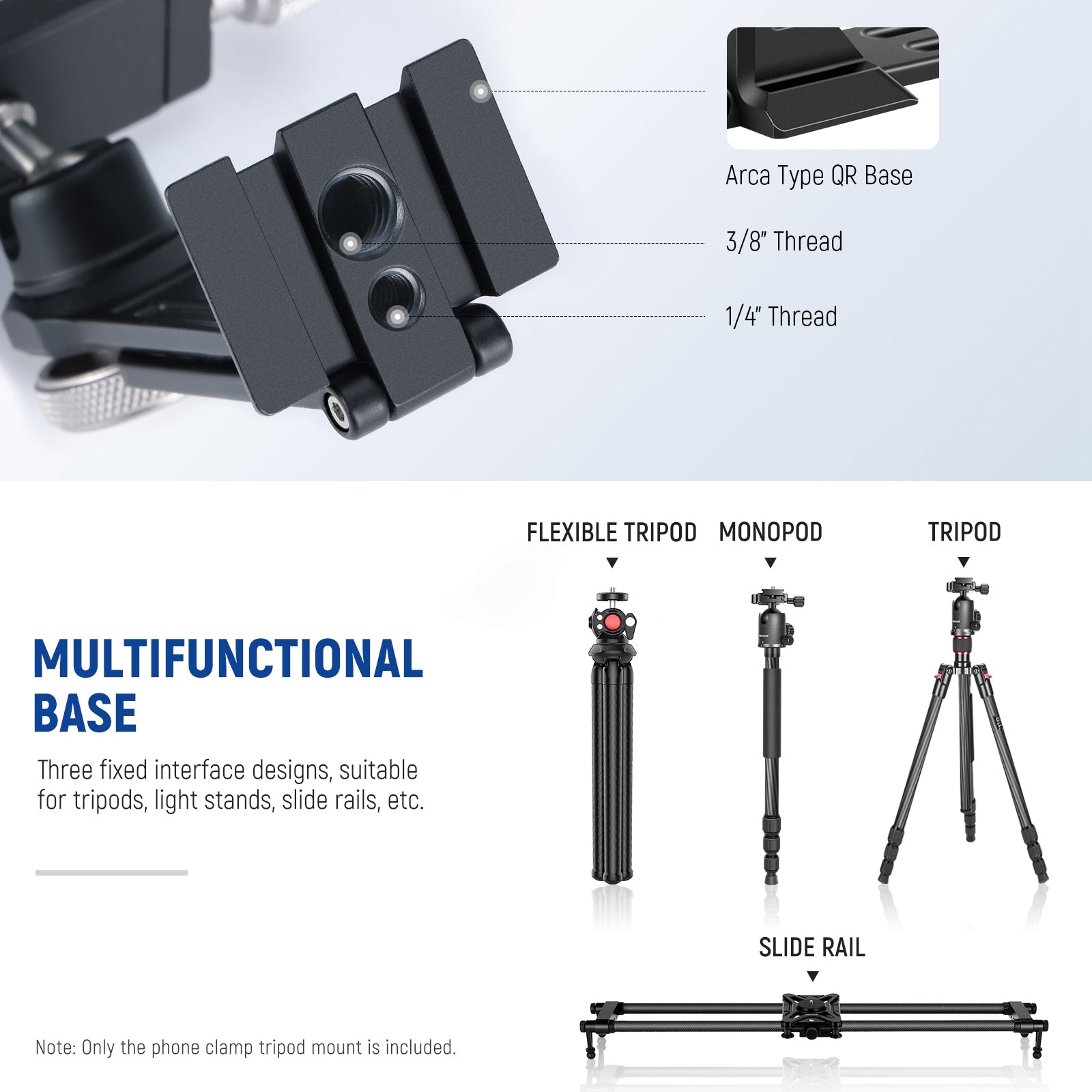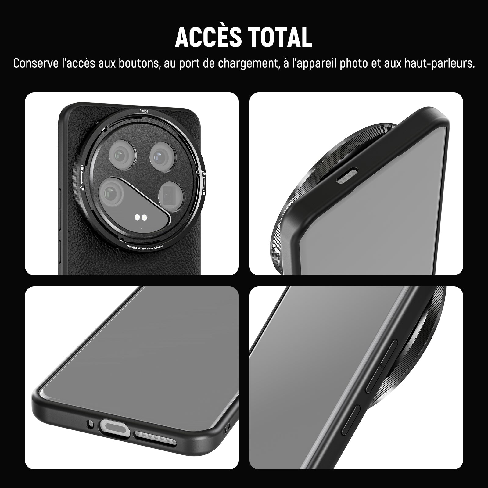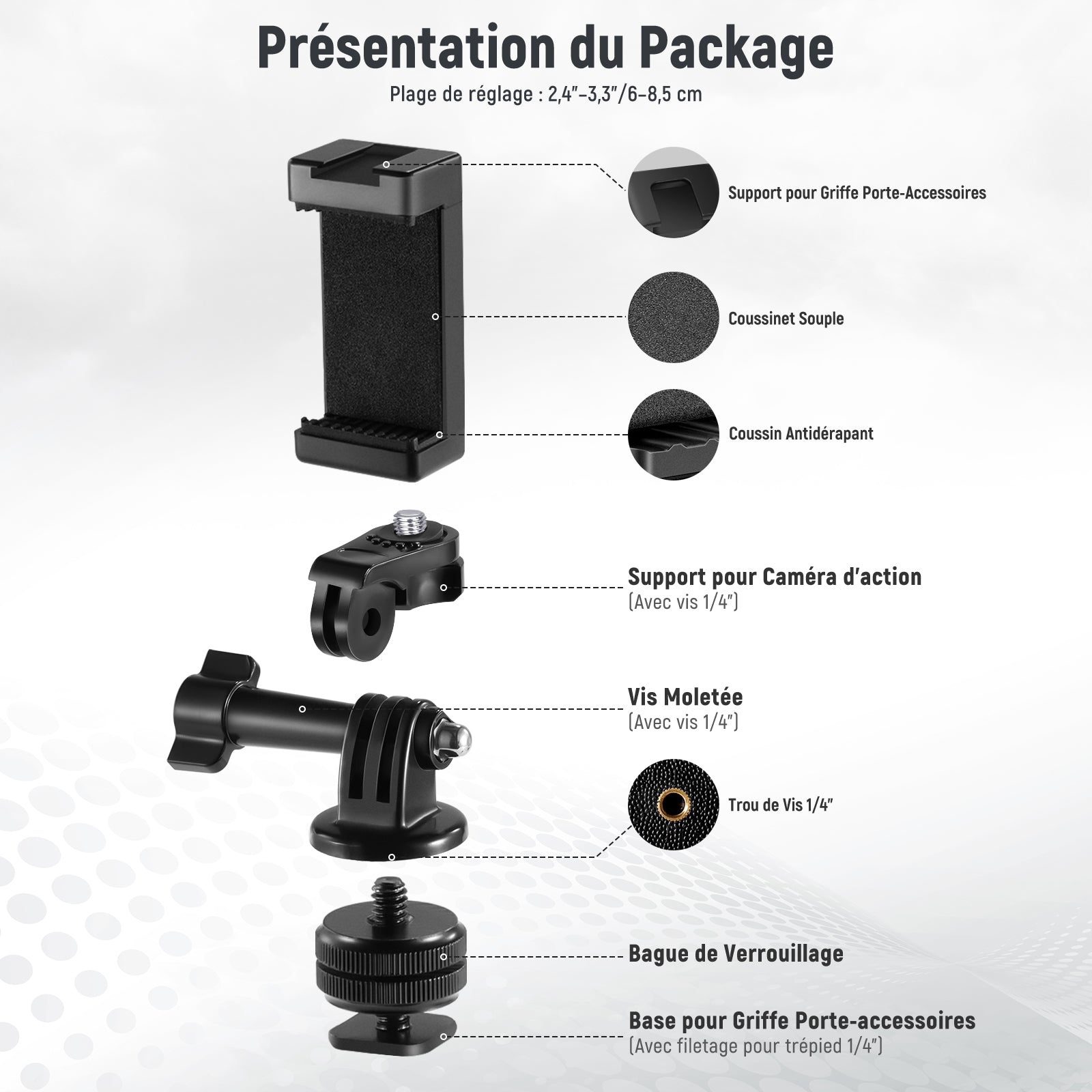 Cages/étuis de téléphone dédiés et universels, poignées, commandes Bluetooth, chariots, glissières, trépieds et autres accessoires pour la photographie mobile.