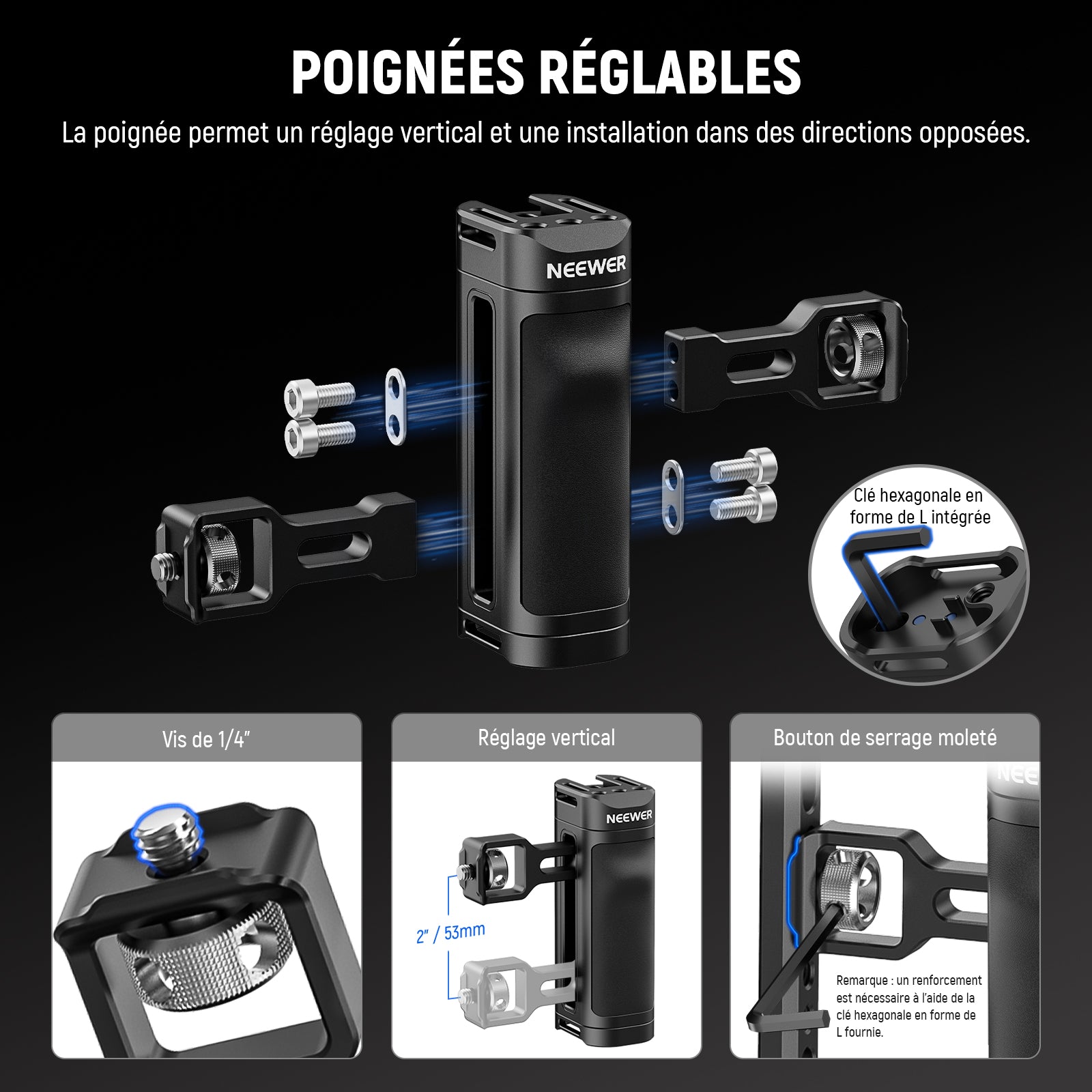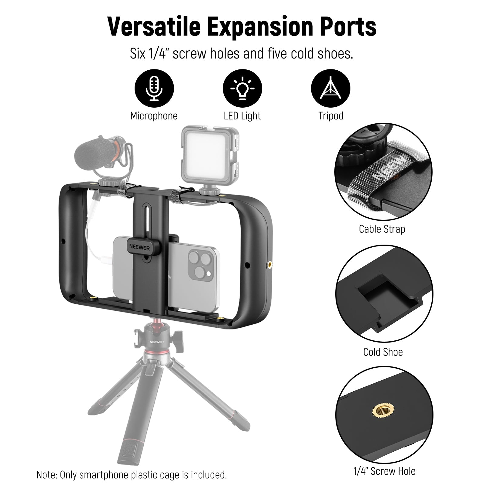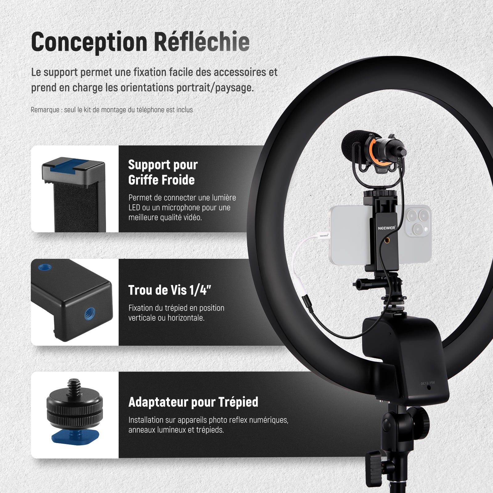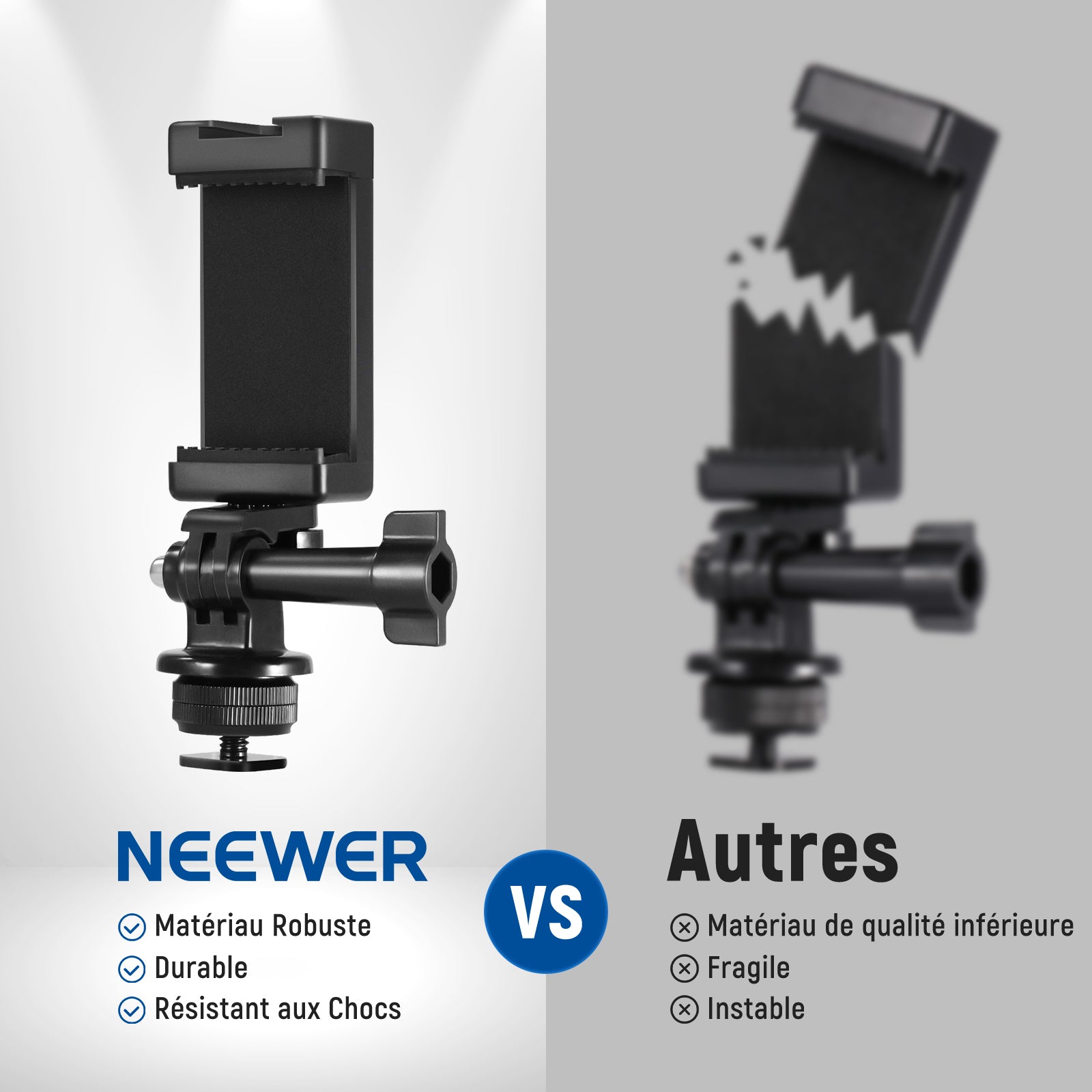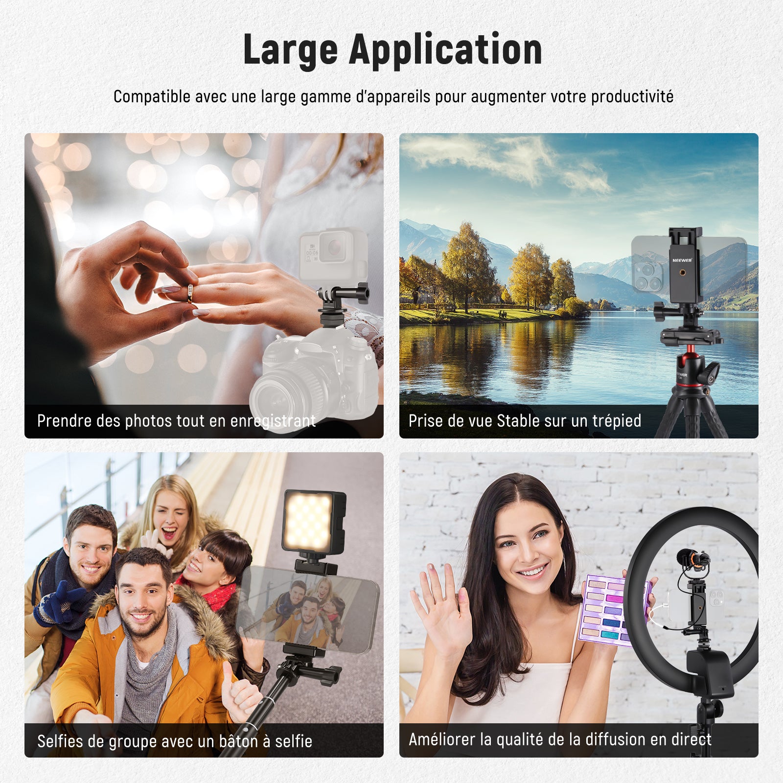 Les rigs pour smartphone NEEWER sont conçus pour améliorer vos vidéos mobiles. Notre gamme comprend des supports de trépied, des cages pour téléphone, des stabilisateurs, et plus encore. Compatibles avec une large variété de smartphones, y compris les iPhone, Samsung et autres marques, ces accessoires s’adaptent facilement à vos besoins.