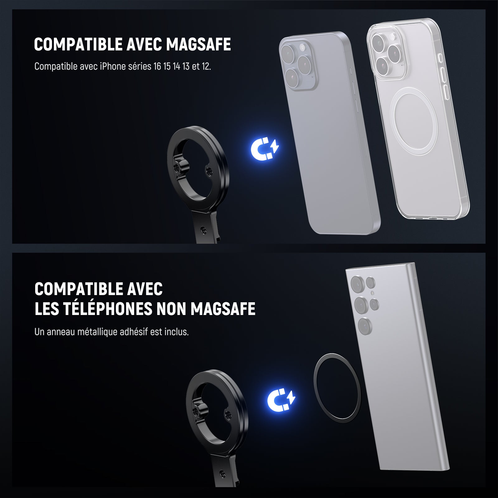 - Support magnétique pour téléphone: le support de téléphone magnétique dispose d'un design magnétique,avec un côté qui se fixe en toute sécurité aux smartphones(limité aux smartphones magnétiques uniquement,non compatible avec d'autres accessoires),et l'autre pour accessoires tels que lumières de remplissage ou toute surface métallique en fer.La forte adhérence magnétique assure la stabilité de votre téléphone pendant la prise de vue,réduisant considérablement le risque de chutes accidentelles
