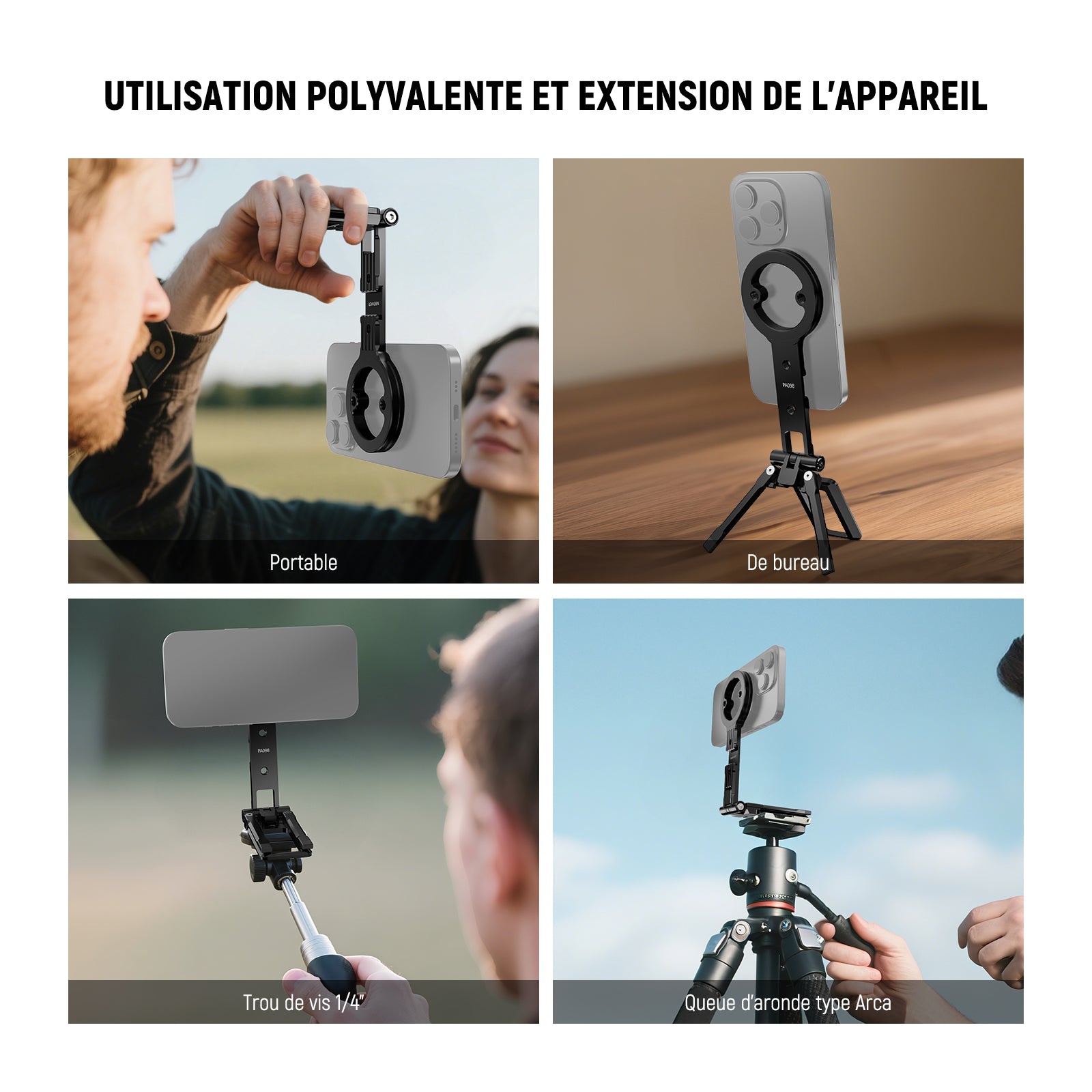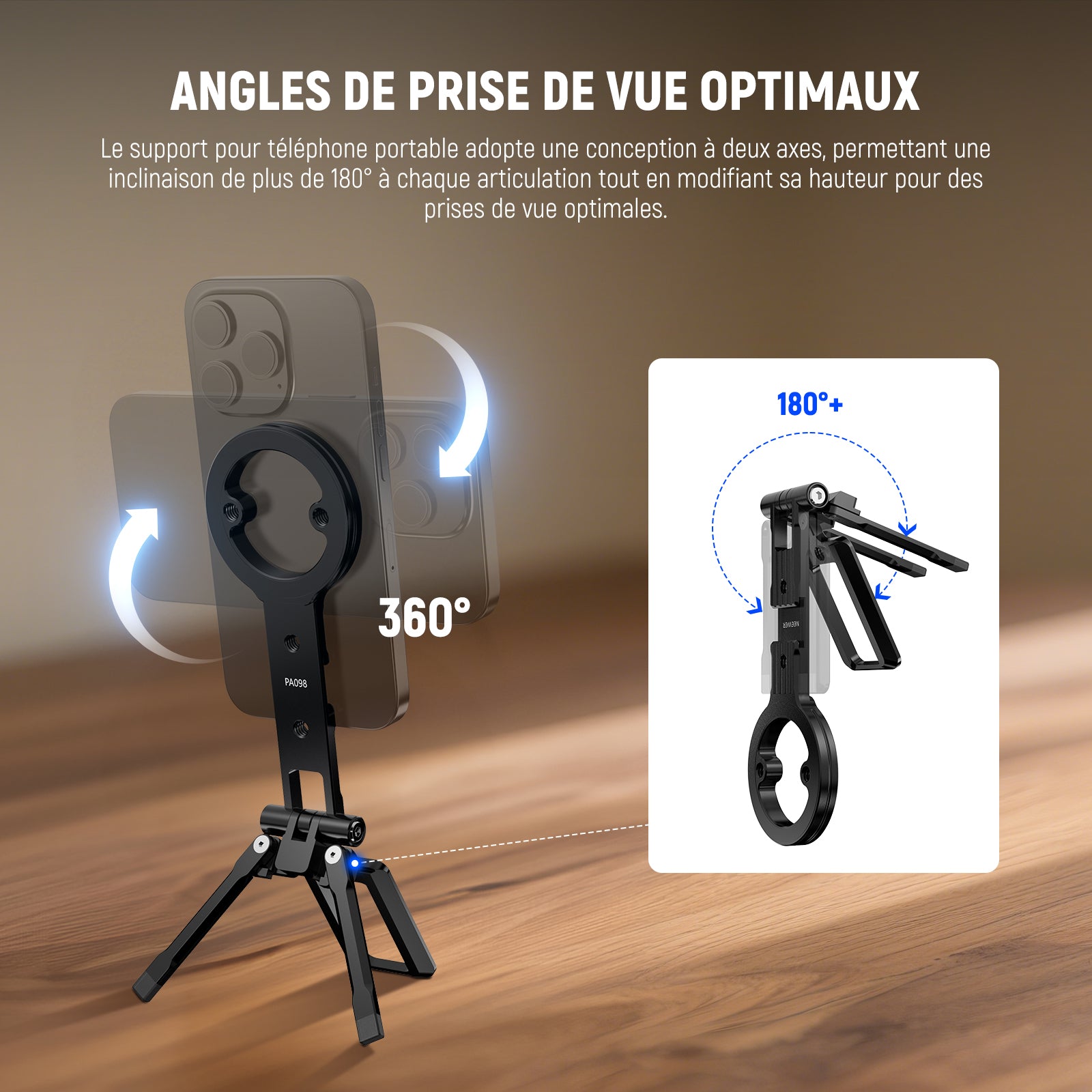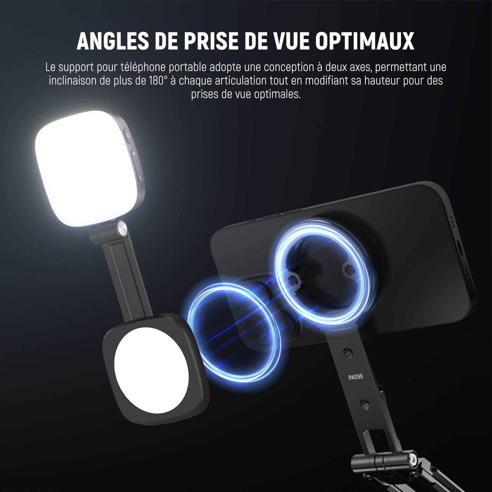 - Angles de prise de vue optimaux : le support de téléphone portable adopte un design à double axe, permettant une inclinaison de plus de 180° à chaque articulation tout en modifiant sa hauteur pour des résultats de prise de vue optimaux. En outre, la fixation magnétique facilite la rotation à 360° de votre smartphone, permettant de basculer sans effort entre les orientations horizontale et verticale pour différents besoins de prise de vue