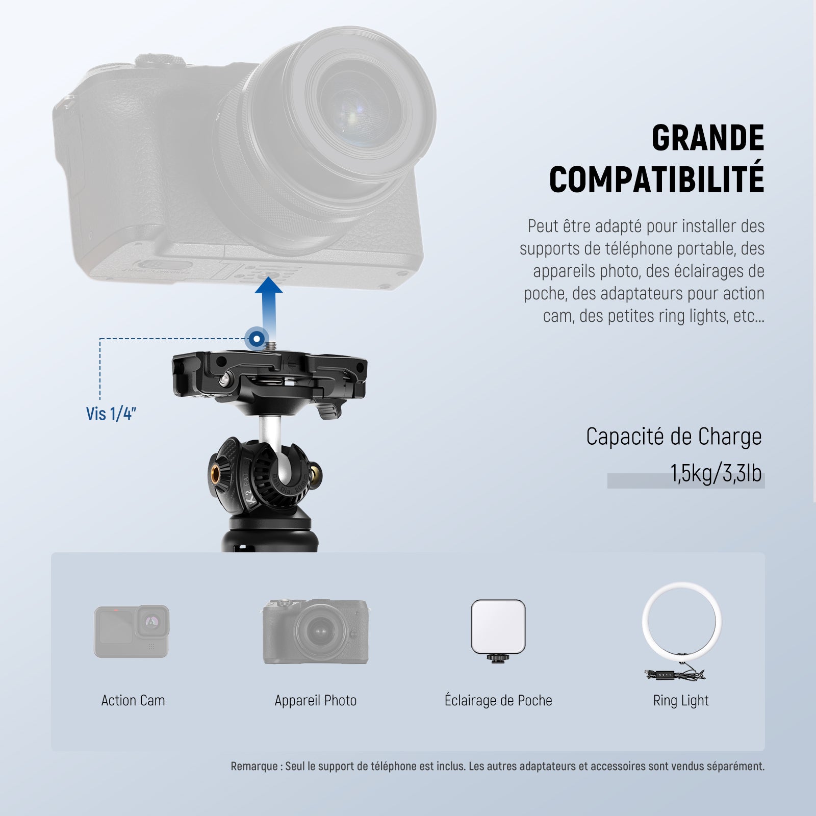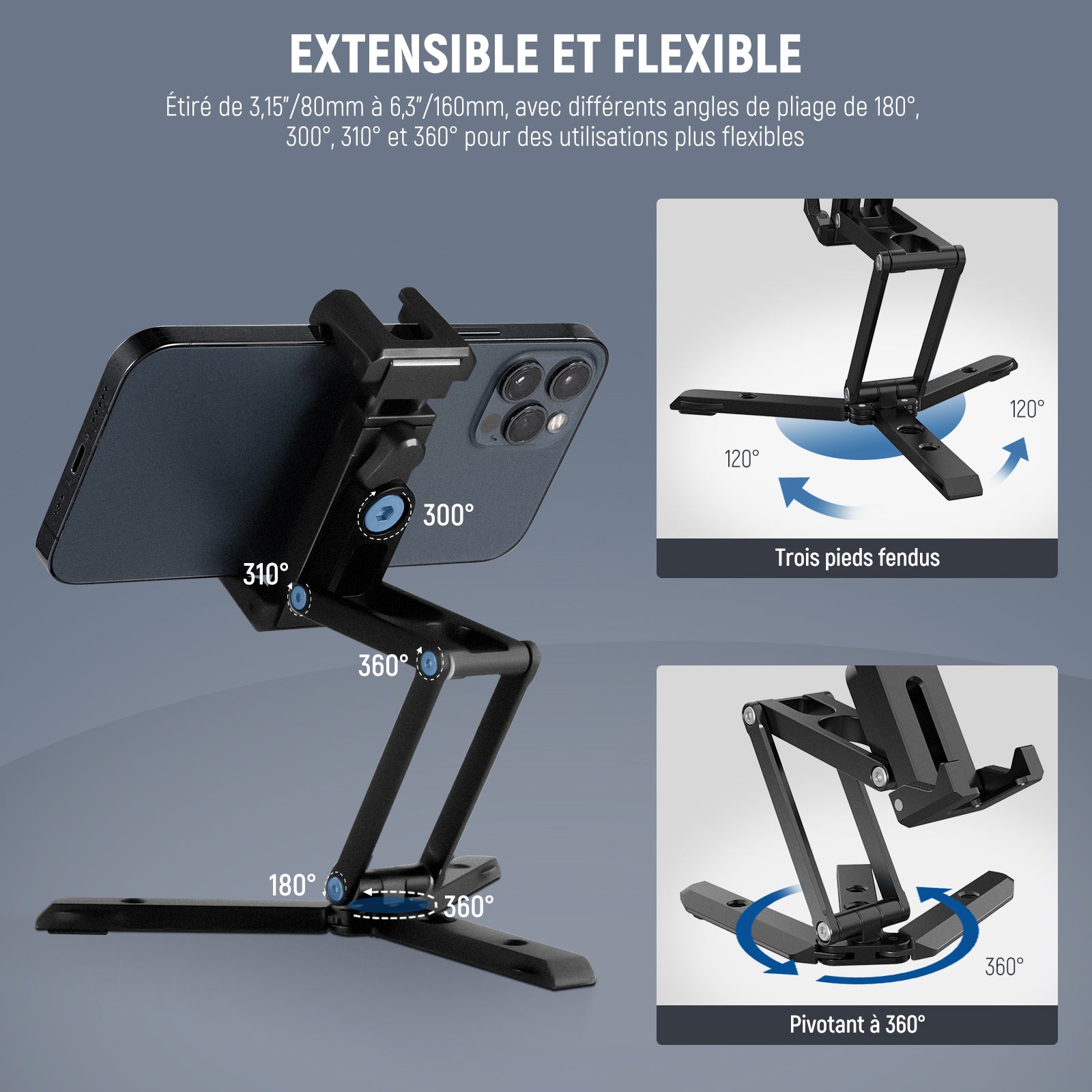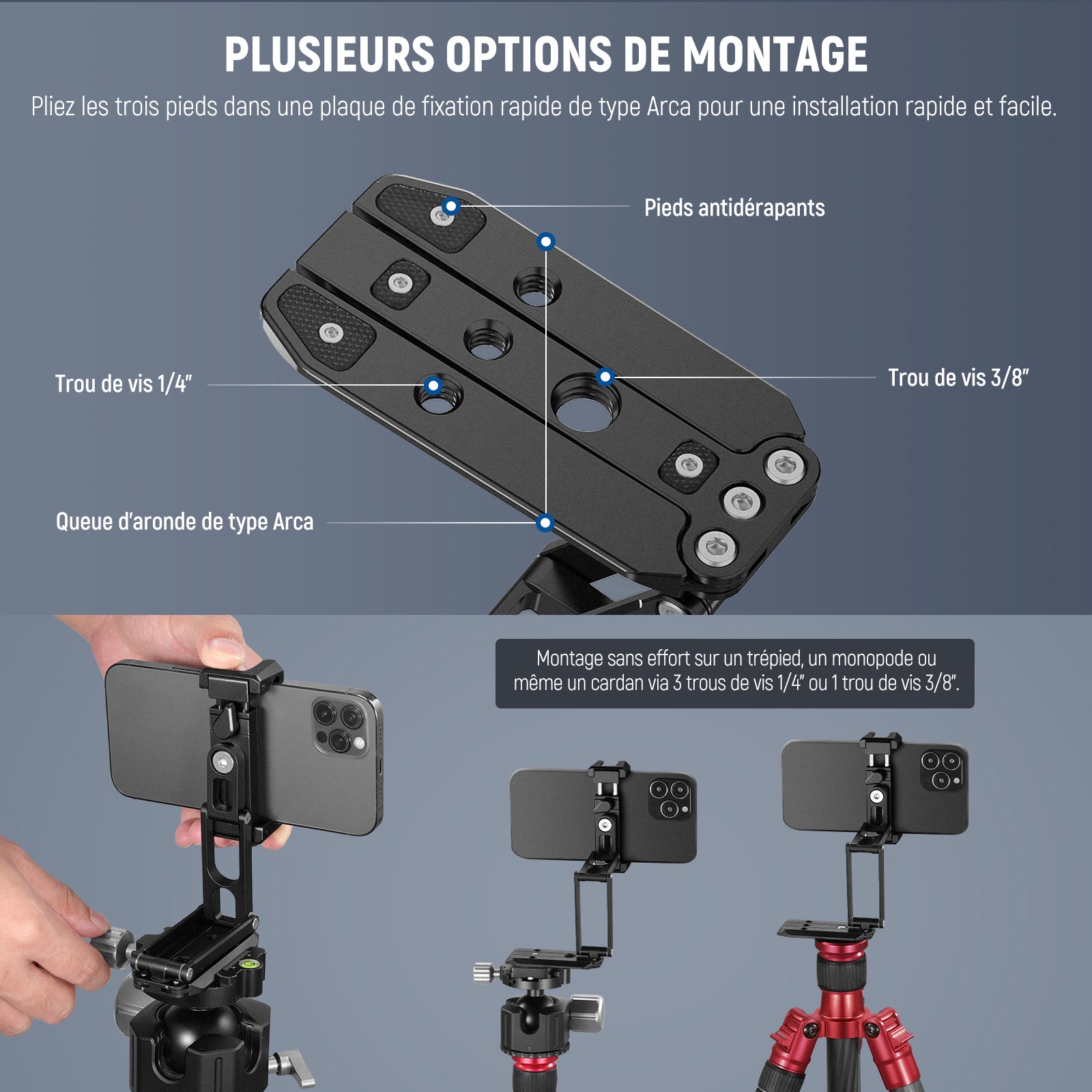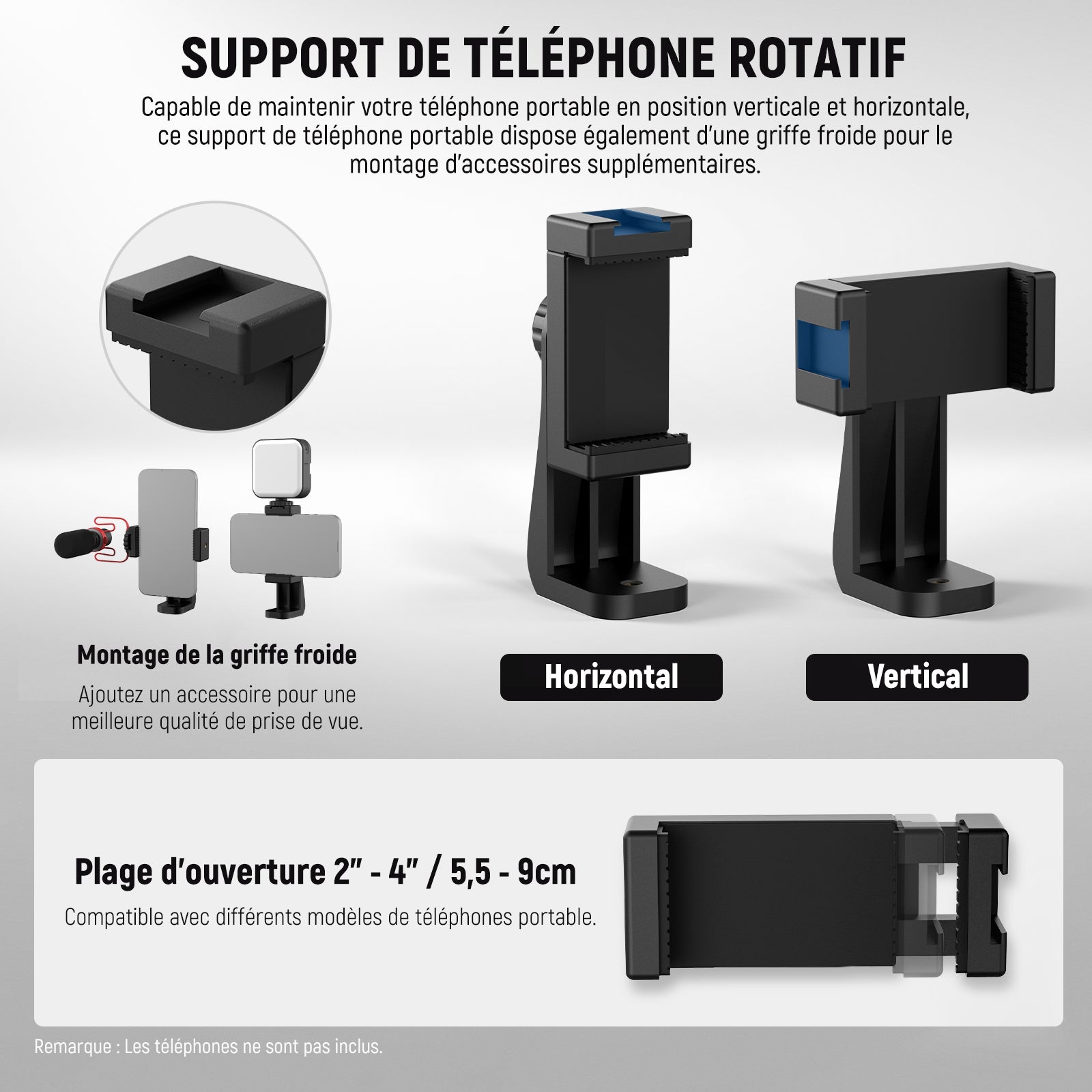 Cages/étuis de téléphone dédiés et universels, poignées, commandes Bluetooth, chariots, glissières, trépieds et autres accessoires pour la photographie mobile.