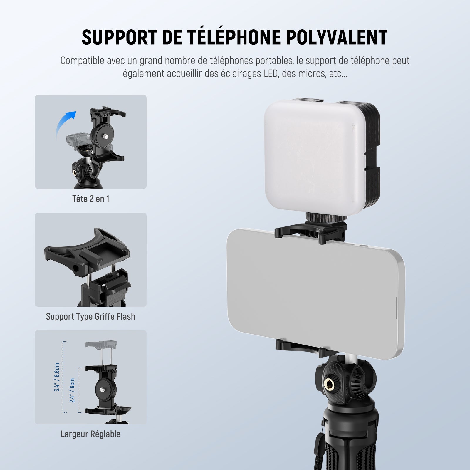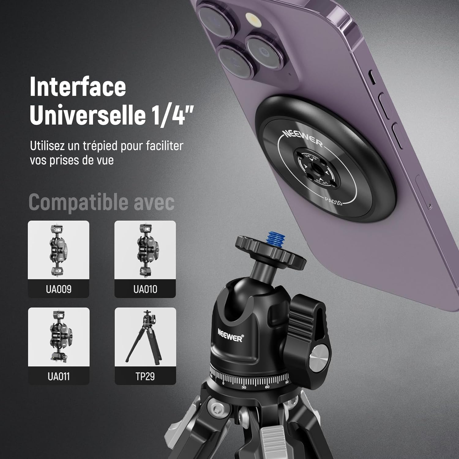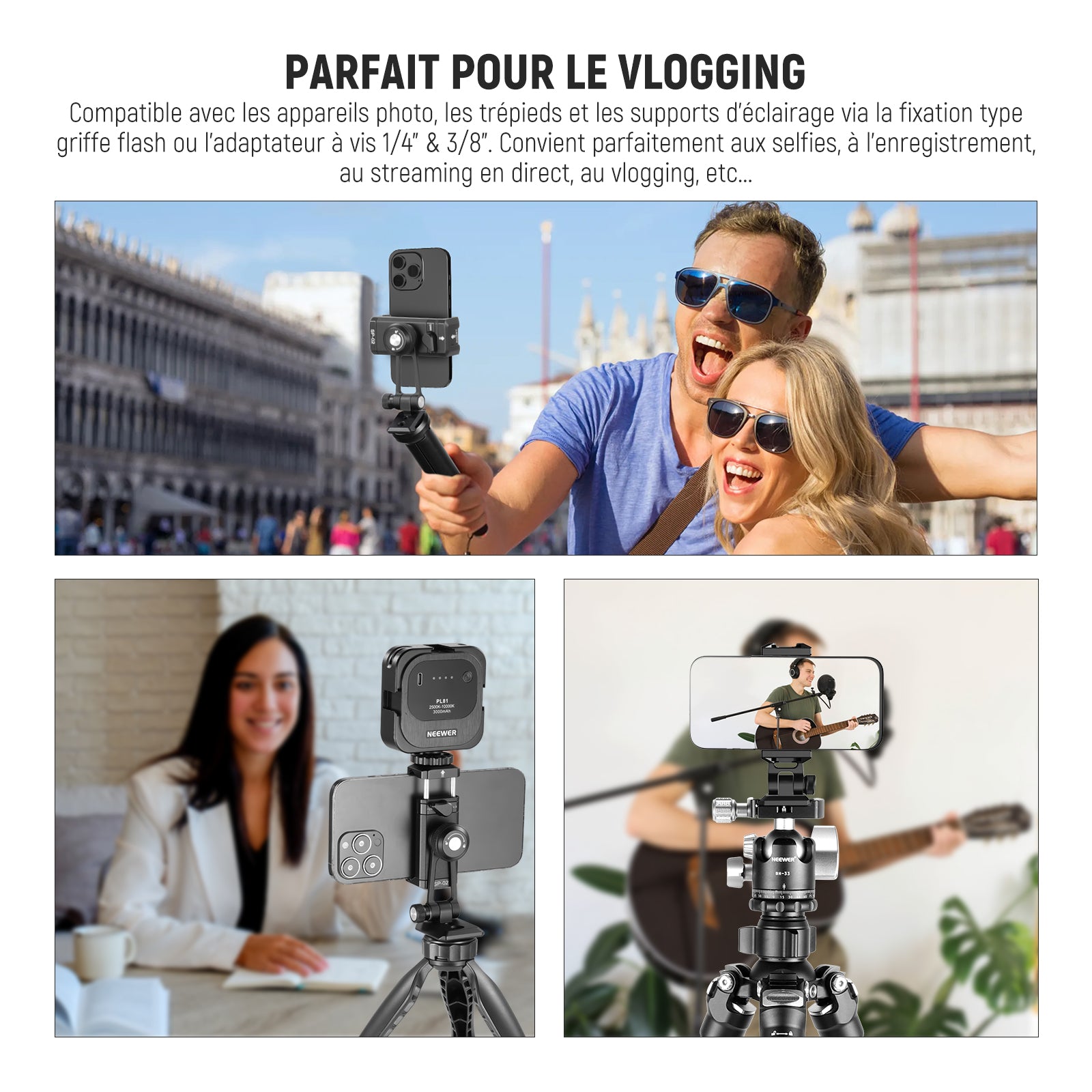 Les rigs pour smartphone NEEWER sont conçus pour améliorer vos vidéos mobiles. Notre gamme comprend des supports de trépied, des cages pour téléphone, des stabilisateurs, et plus encore. Compatibles avec une large variété de smartphones, y compris les iPhone, Samsung et autres marques, ces accessoires s’adaptent facilement à vos besoins.