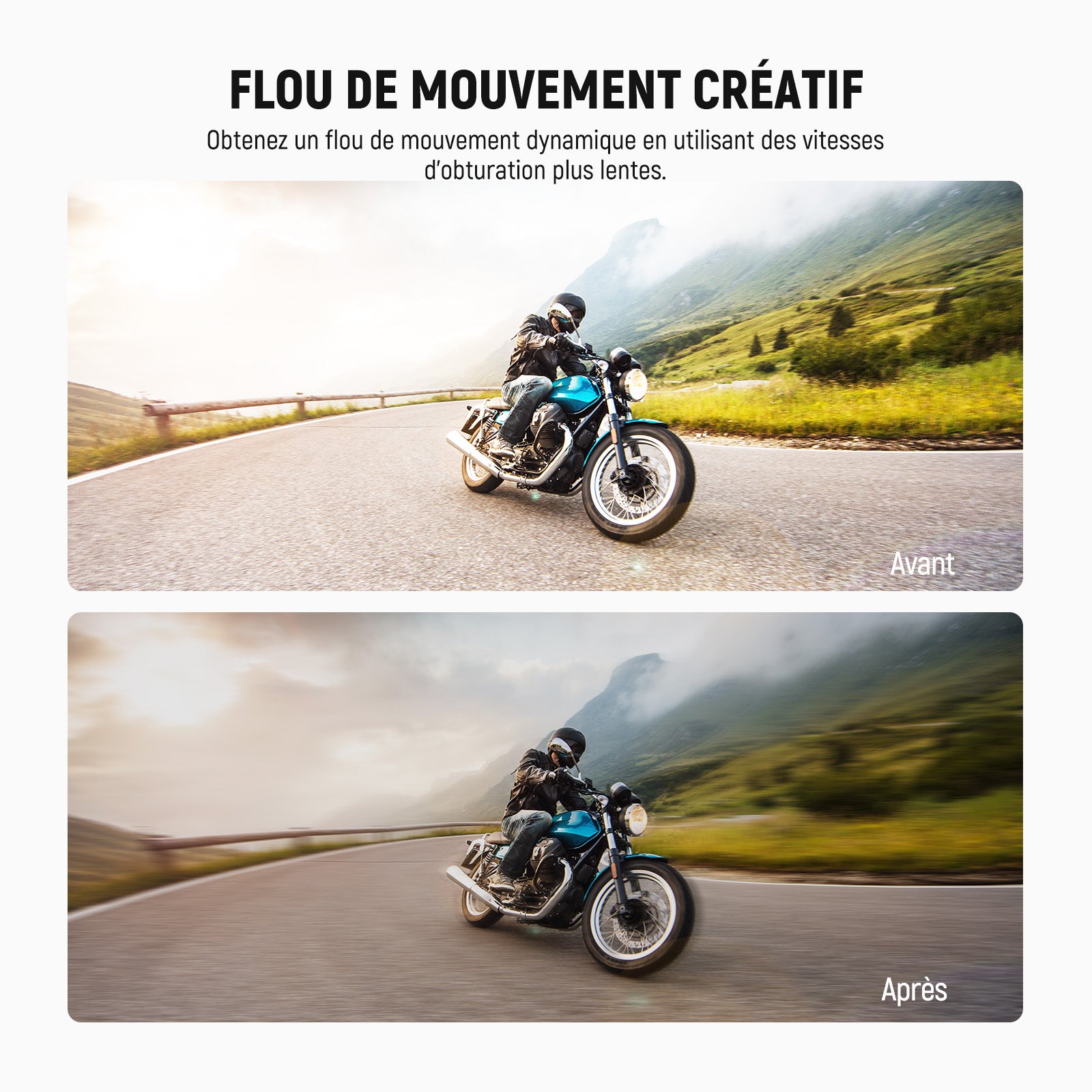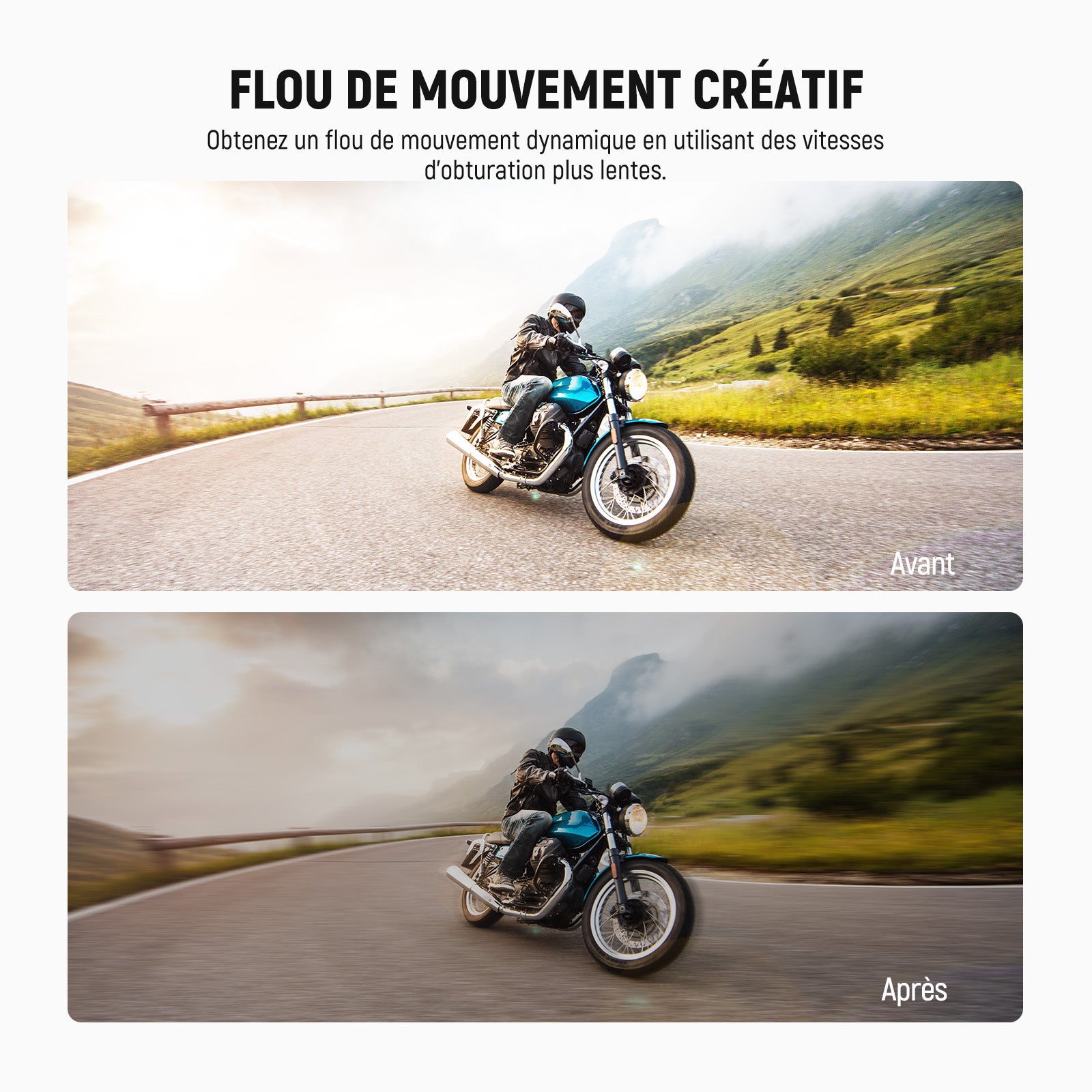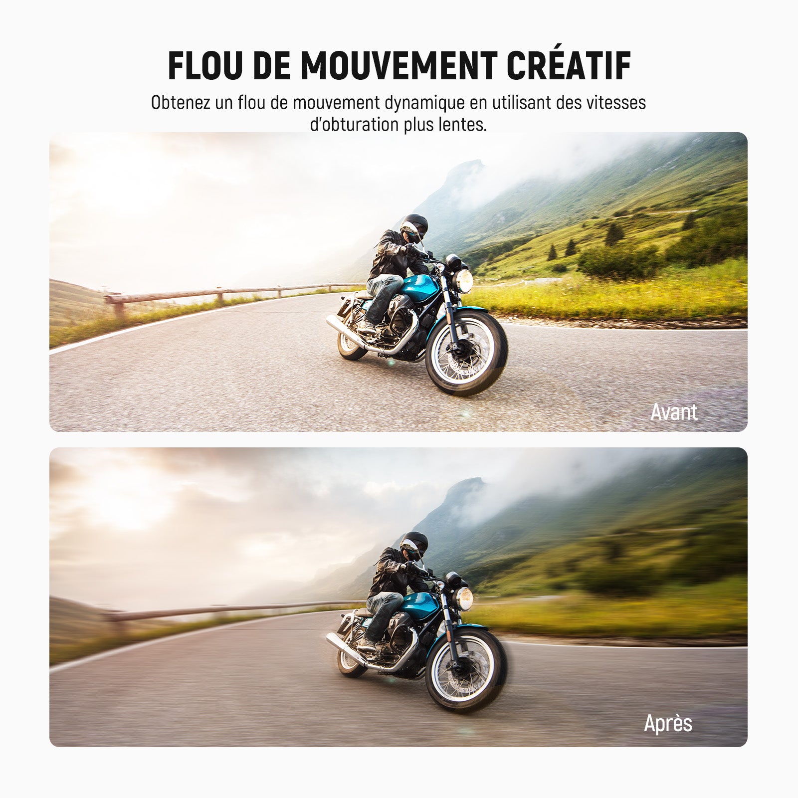 - 【Exposition extérieure équilibrée】 Les filtres à densité neutre ND16 pour objectif réduisent la lumière de 4 diaphragmes afin d'éviter la surexposition en conditions de forte luminosité et de capturer rivières, cascades et traînées lumineuses avec un flou de mouvement fluide.