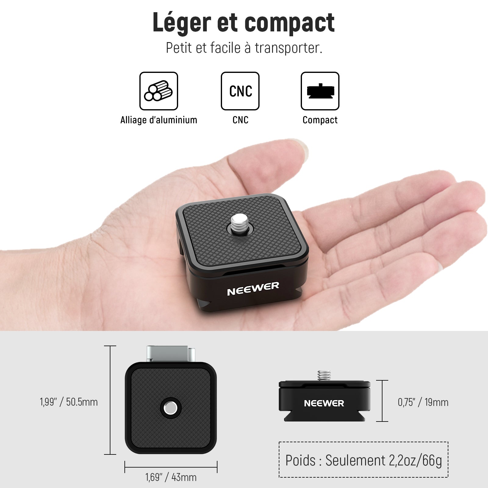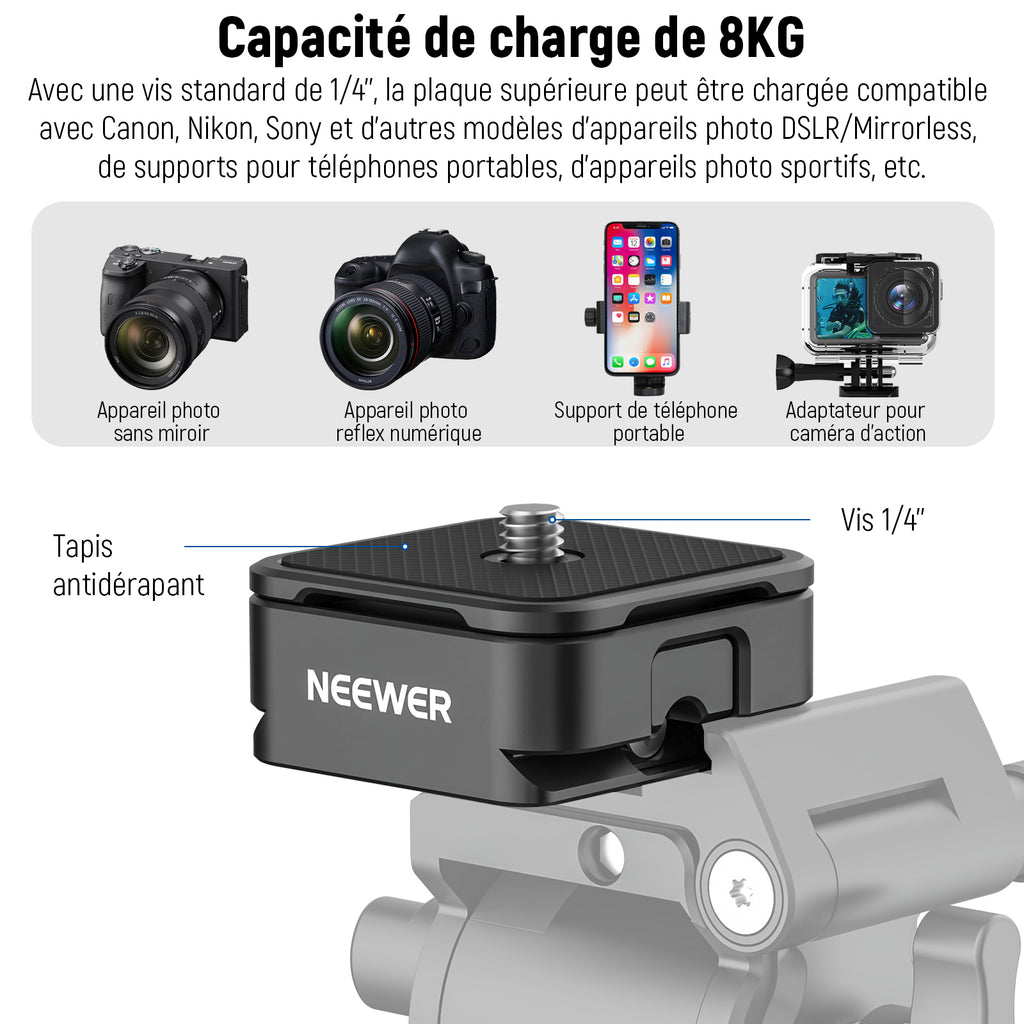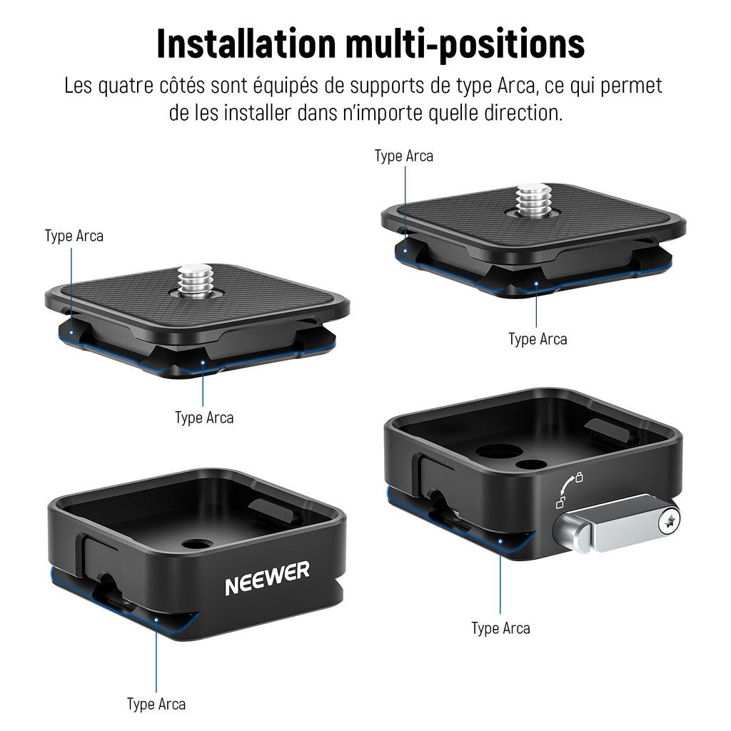 - Nouvelle Plaque à Fixation Rapide à Quatre Côtés de Type Arca- Le système du kit de plaque à fixation rapide NEEWER CA009 utilise un nouvelle plaque à fixation rapide et possède des rainures de type Arca sur les quatre côtés, ce qui vous permet de passer rapidement du stabilisateur à la tête de trépied sans vous préoccuper du sens de montage. La base est également fournie avec un système de montage compatible Arca Swiss pour différentes têtes de trépied. Remarque : La pince est uniquement compatible avec la plaque de dégagement rapide fournie. Elle n’est pas compatible avec d’autres plaques.