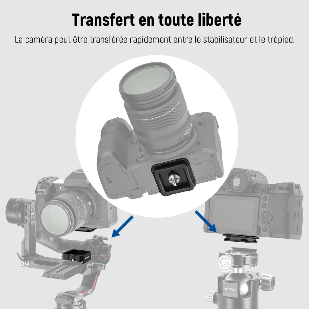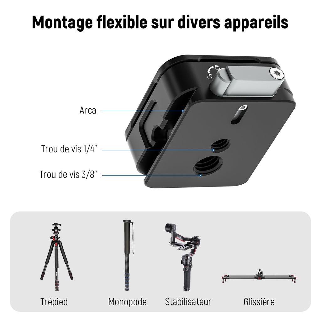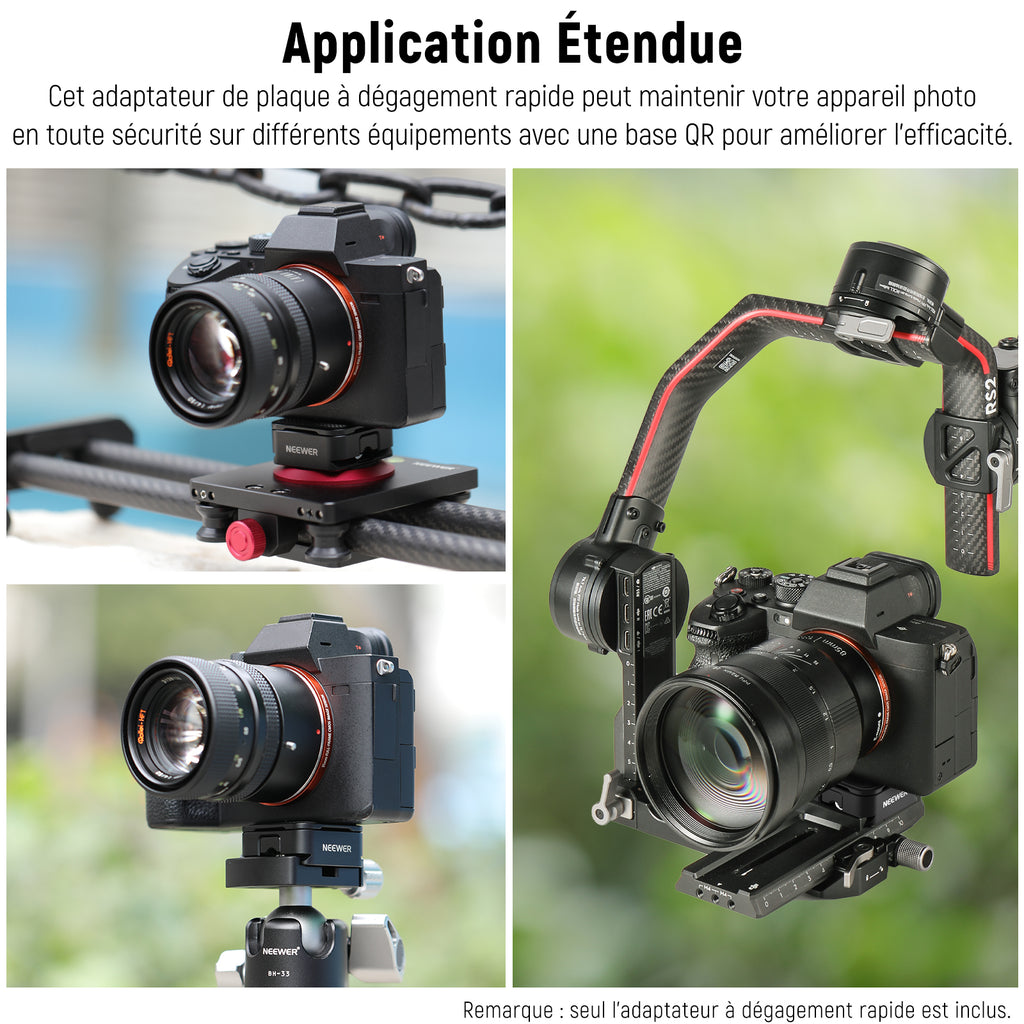 - Changement Rapide Entre les Différents Appareils- Utilisez ce kit de plaque à fixation rapide pour monter rapidement et facilement votre appareil photo sur une tête de trépied/monopode, un stabilisateur, un rail de traveling etc, et passer d'un appareil à l'autre sans changer la plaque à fixation rapide rapide. Économisez votre temps et vos efforts, augmentez votre efficacité et réduisez l'usure potentielle des filetages de votre appareil photo.
