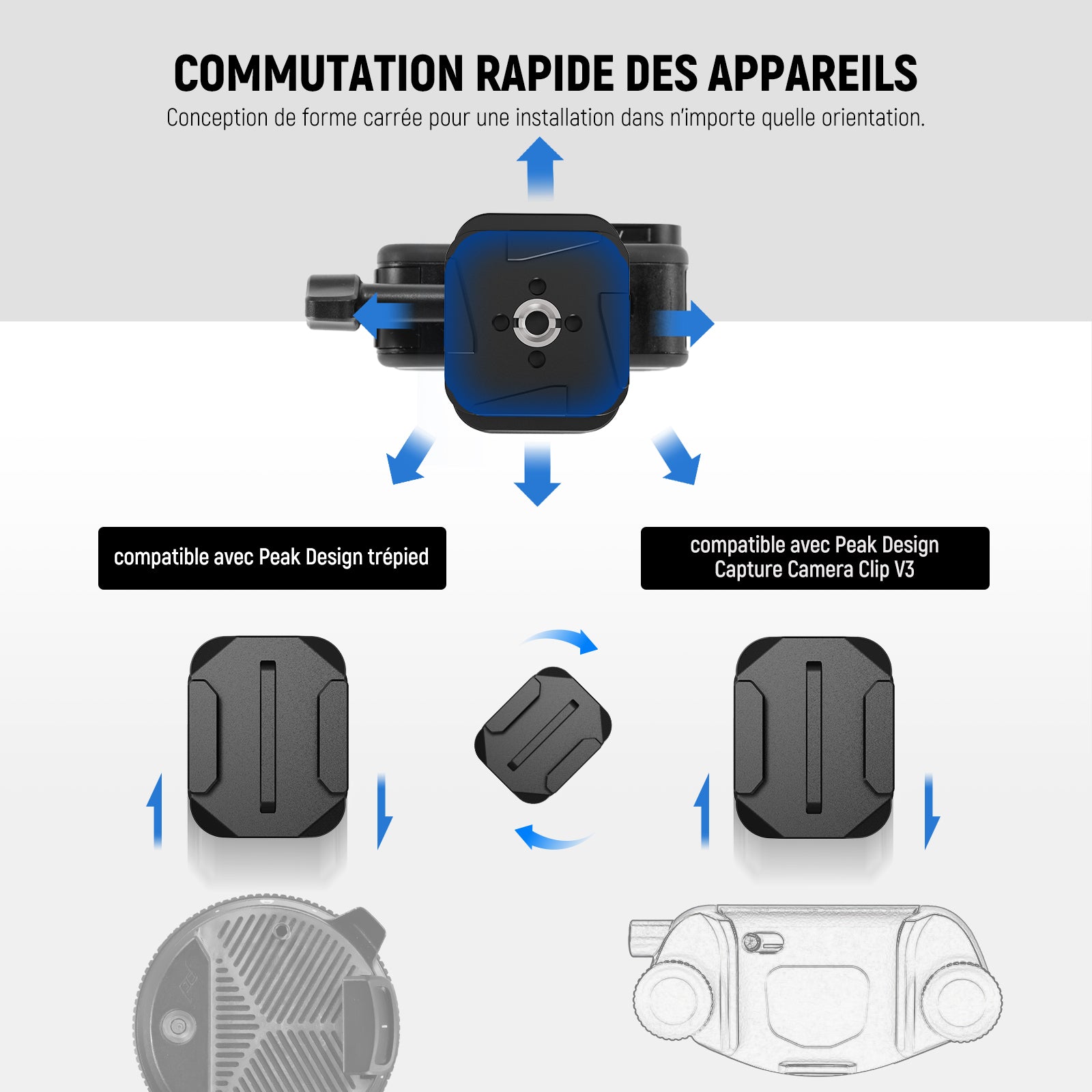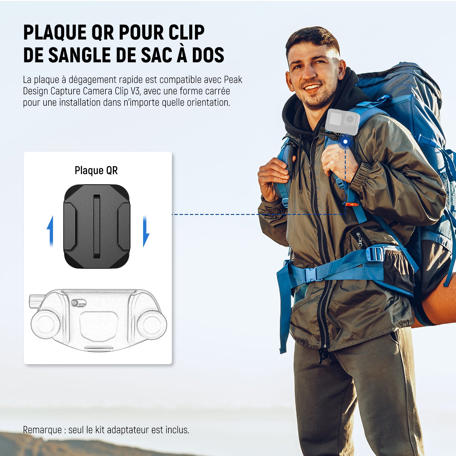 - 【Plaque QR de clip de sangle de sac】La plaque à dégagement est compatible avec Peak Design Capture Camera Clip V3 et compatible avec Peak Design Trépied,peut être installée dans n'importe quelle direction.Lorsqu'il est monté sur le clip,il s'agit d'un accessoire POV mains libres fiable pour le vélo, le ski, le surf,équivalent à une vue sur le support de cou, sous la tête et sur le menton du casque. Compatible avec GoPro Snap adaptateur et le support de serrage GM31 pour Hero 12 11 10 9