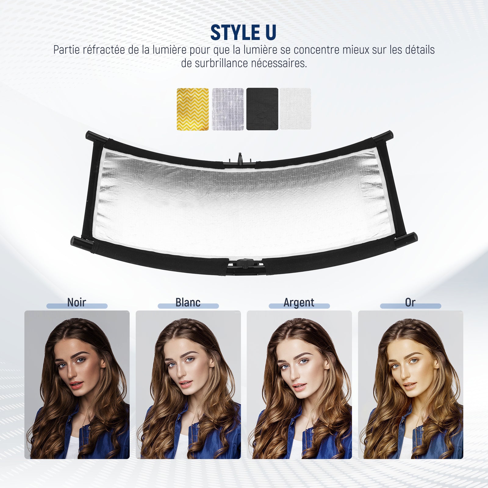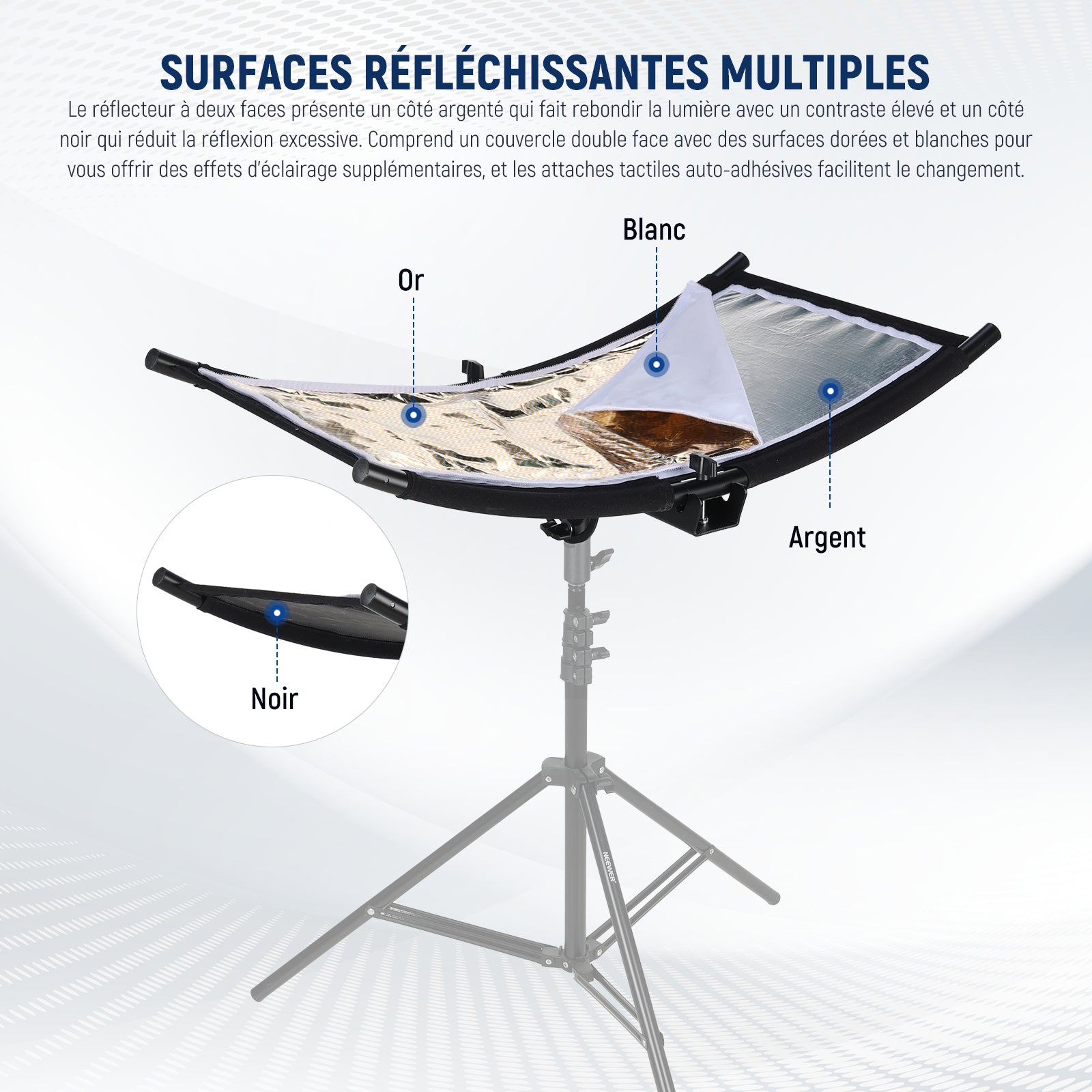 - 【Plusieurs couleurs de lumière】 Le réflecteur en forme de U présente deux surfaces : une argentée qui fait rebondir la lumière avec un contraste élevé et une noire qui réduit la réflexion excessive. Un couvercle double face (or + blanc) vous offre plus d'effets lumineux, et les attaches auto-adhésives facilitent le changement de couleur