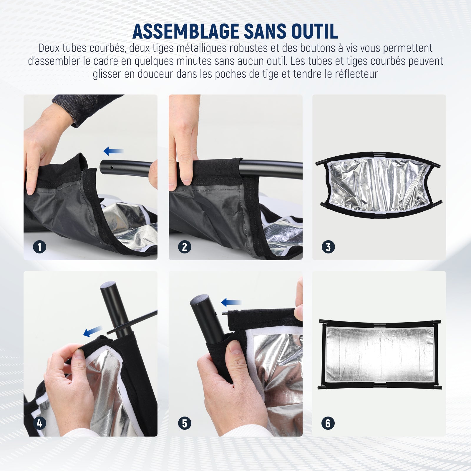 - 【Assemblage sans outil】 Deux tubes incurvés, deux tiges métalliques robustes et des boutons à vis vous permettent d'assembler le cadre en quelques minutes sans aucun outil nécessaire. Les tubes et tiges incurvés peuvent glisser en douceur dans les poches de tige et tendre le réflecteur