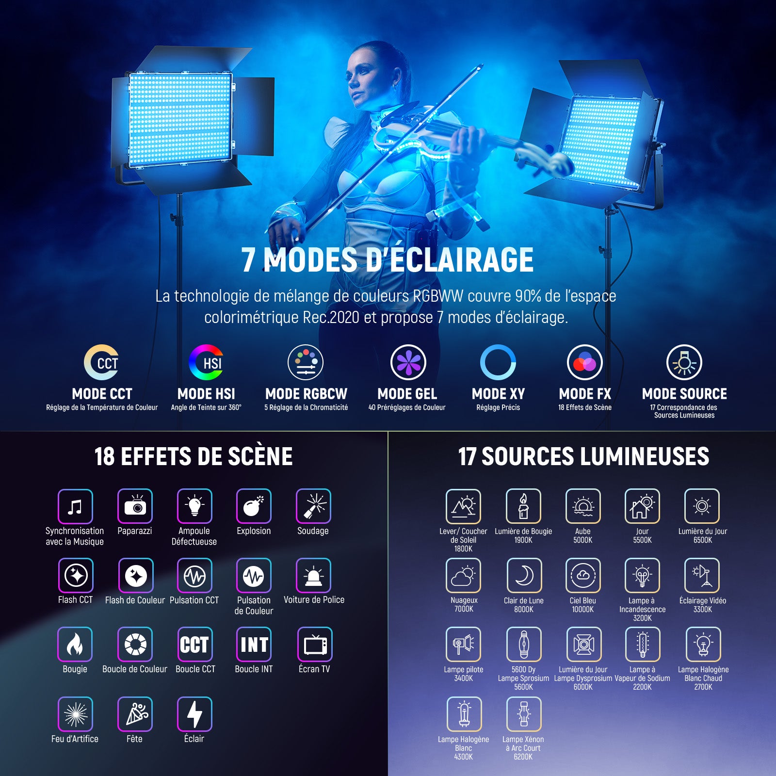 - 【7 Modes d'éclairage & Luminosité Précise】 Avec le RGB et les LED froides & chaudes mélangées, le panneau lumineux peut se vanter de solides performances de couleur, il couvre 90% de l'espace colorimétrique Rec.2020 grace à la technologie de mélange RGBWW. 7 modes : CCT/HSI/RGBCW/GEL/FX/XY/SOURCE, dont FX avec 18 effets de scène et SOURCE avec 17 correspondances de sources lumineuses. La technologie PWM permet un réglage précis par paliers de 0,1% de 0 à 100% et avec 4 courbes de réglage.