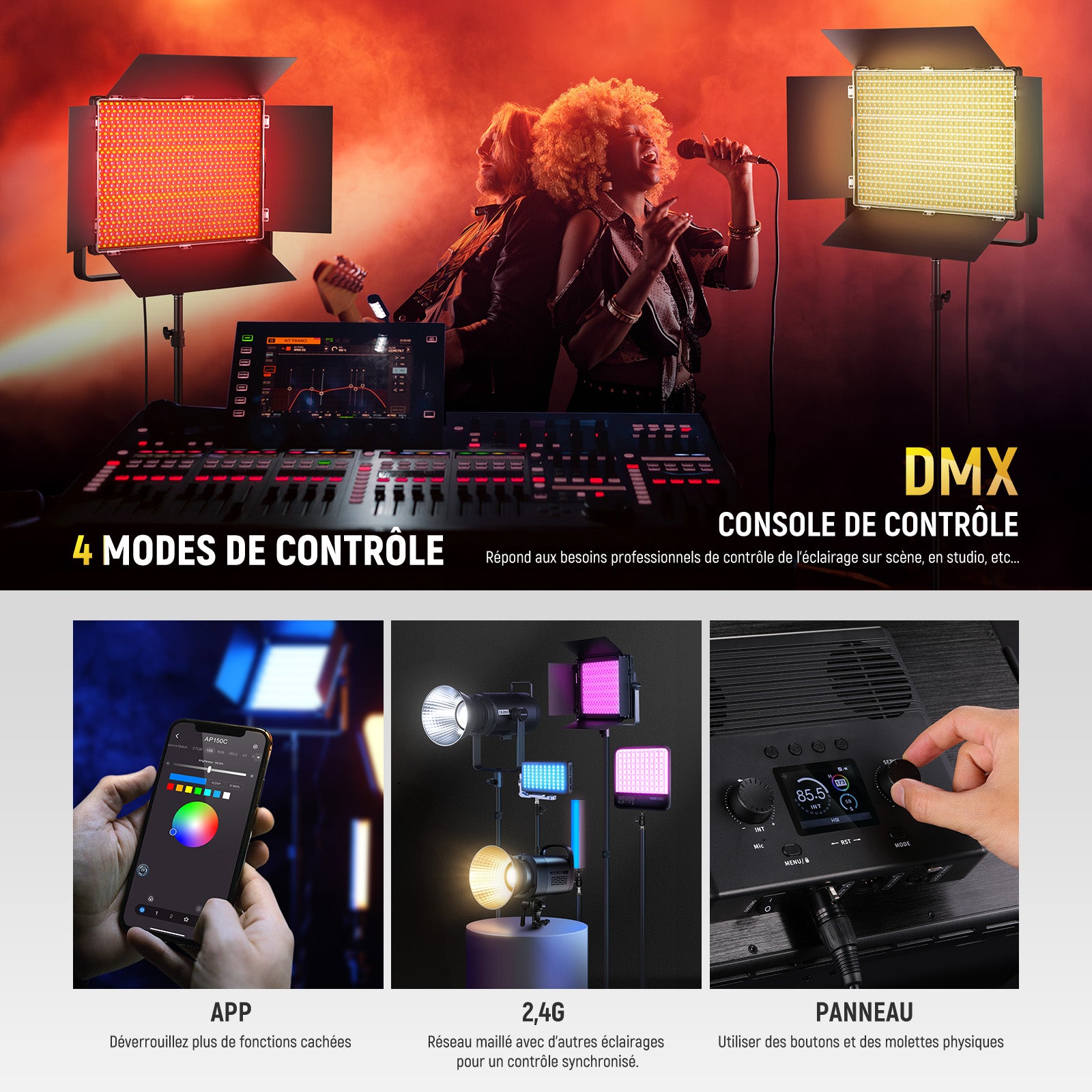 - 【Contrôle APP/2,4G/ Panneau/DMX】4 méthodes de contrôle pour satisfaire les pro et les novices. L'APP NEEWER permet le contrôle sans fil et la gestion groupée de plusieurs éclairages ; le module 2,4G intégré assure un contrôle maître/esclave avec différents modèles d'éclairages (SL90 PRO, RGB1, RGB1200, MS60C, MS60B, MS150B, FS150B, CB60B...) ; le panneau avec un écran couleur intuitif qui affiche les paramètres est simple à utiliser ; un port DMX à 5 broches pour se connecter à une console DMX.