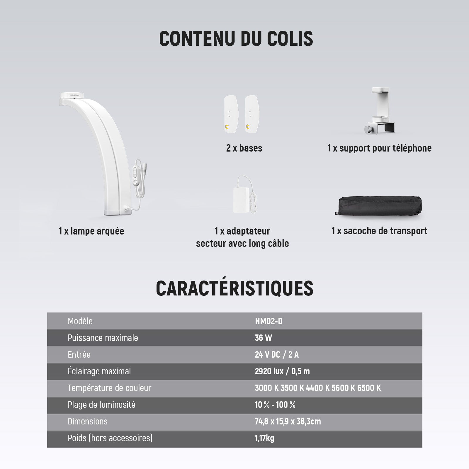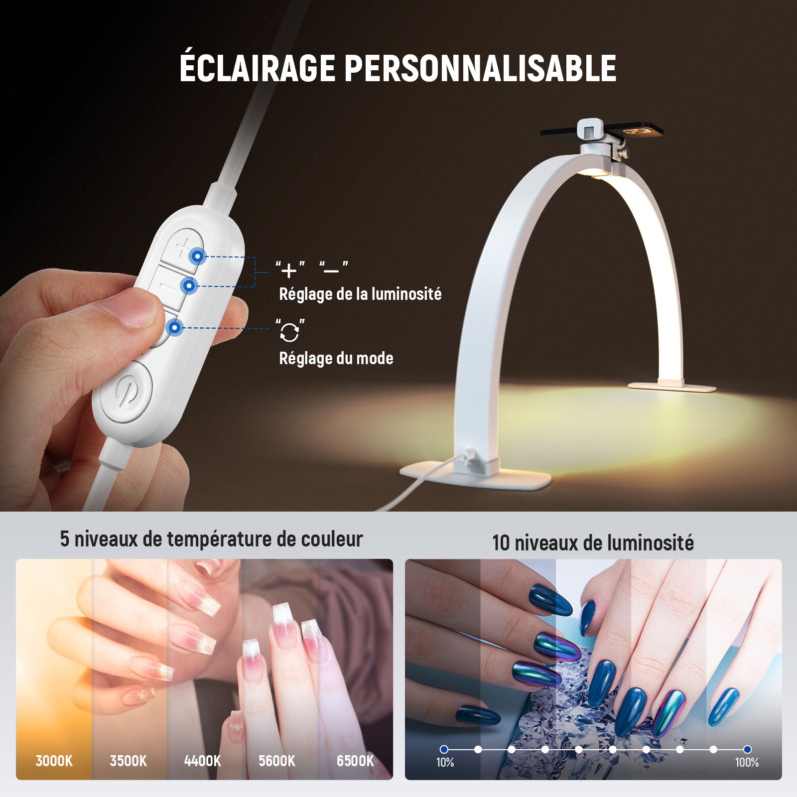 - 【Présentation de NEEWER BASICS】 Simple et pratique, NEEWER BASICS est une gamme de produits économiques qui se concentre sur les fonctions et le design essentiels, sans accessoires ni matériaux superflus. La HM02-D est une lampe de bureau pliable en demi-lune, offrant un éclairage à intensité variable avec une température de couleur réglable, idéale pour diverses tâches telles que le nail art, les soins de la peau, les loisirs créatifs, la couture, etc. Un support pour téléphone est inclus