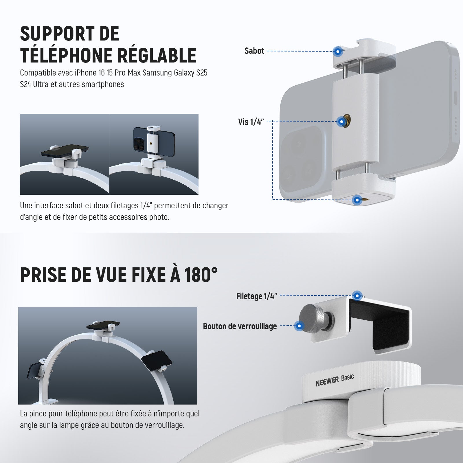 - 【Support de téléphone réglable】 Le support de téléphone de cette lampe de bureau LED demi-cercle portable NEEWER est compatible avec iPhone 16, 15 Pro Max, le Samsung Galaxy S25, le S24 Ultra, etc. Il se fixe à la lampe grâce à un bouton de verrouillage et est doté de coussinets en caoutchouc pour éviter les rayures. Sabot et filetage 1/4" pour le montage de petits accessoires de photographie et de vidéographie.