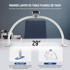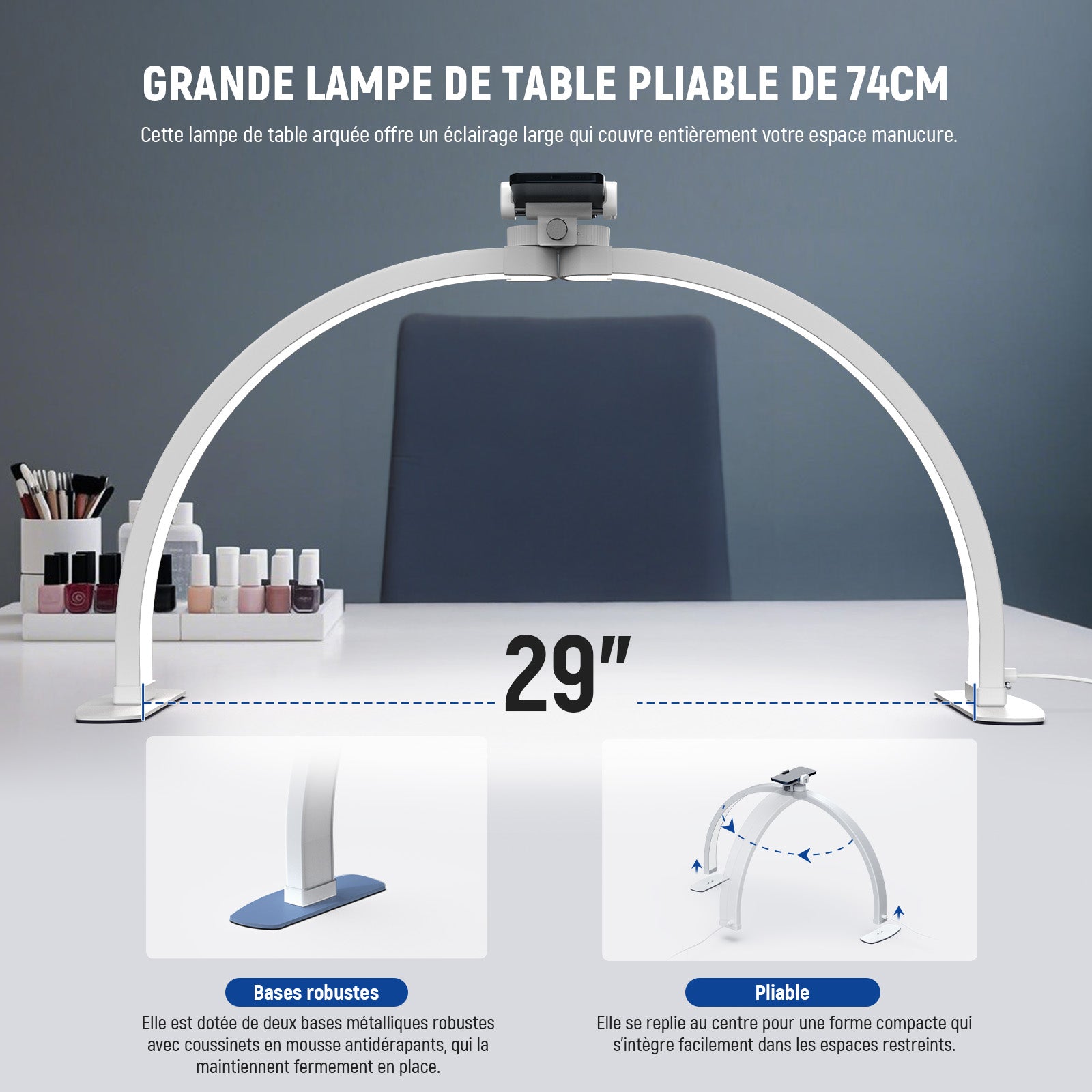 - 【Grande lampe de table pliable de 73,8 cm avec pieds lourds】 Avec un diamètre impressionnant de 73,8cm (29,1 pouces), cette lampe de table arquée offre un éclairage large qui couvre entièrement votre zone de manucure. Ses deux pieds en métal robustes avec coussinets en mousse antidérapants maintiennent la lampe fermement en place et assurent un éclairage stable et sans oscillation. Malgré sa grande taille, elle se plie en son centre pour une forme compacte