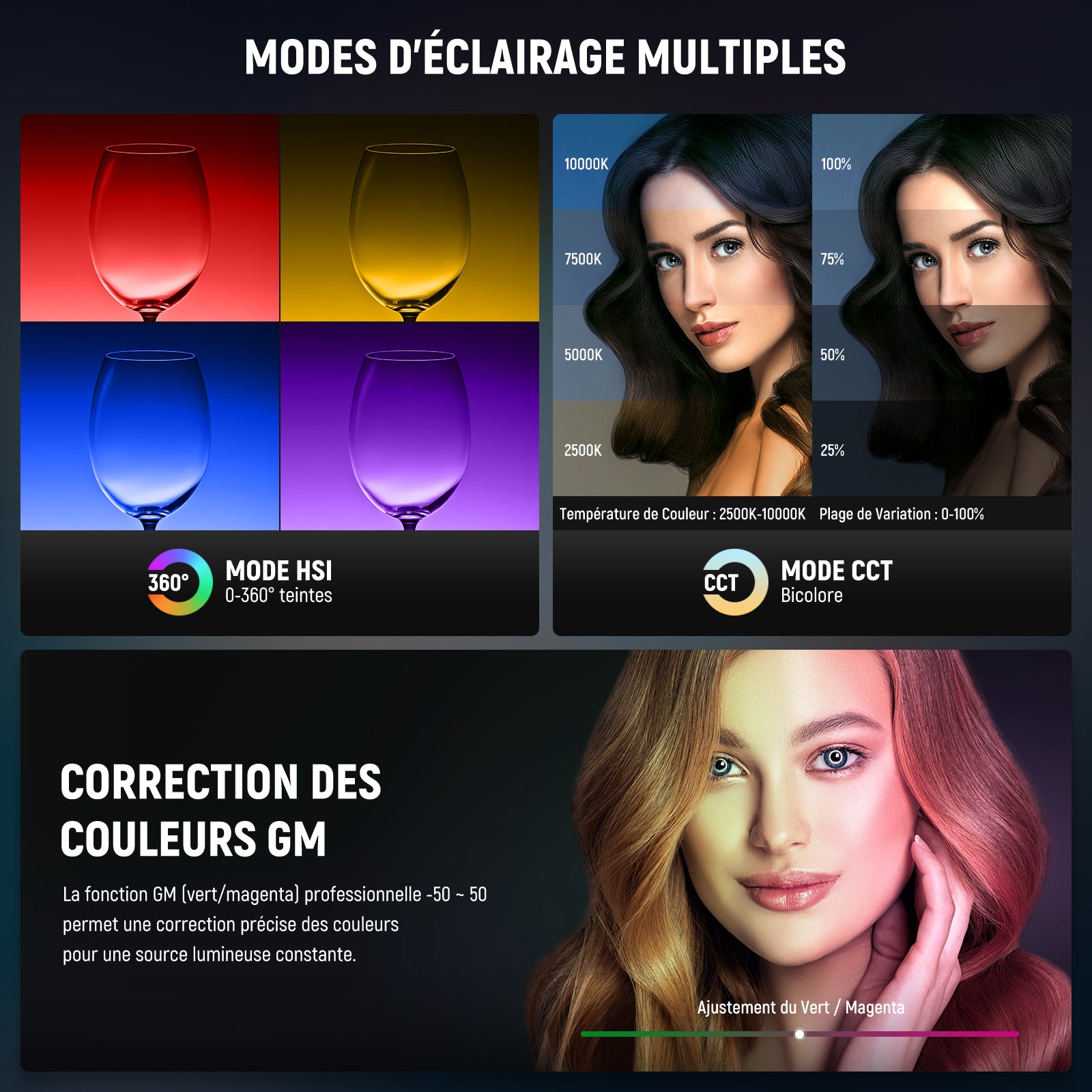 - 【Options Variées de Mode Lumineux】 Il comporte 3 modes : Le mode CCT offre un éclairage bicolore de 2500K-10000K et une plage de variation de 0-100 %. La correction de ±50 GM vous permet de calibrer la température de couleur pour un rendu des couleurs optimal. Le Mode HSI avec 360° pleine couleur RGB peut rendre vos prises de vue artistiques et expressives. Le Mode FX offre 18 effets de scène spéciaux qui rendront votre production vidéo plus réaliste
