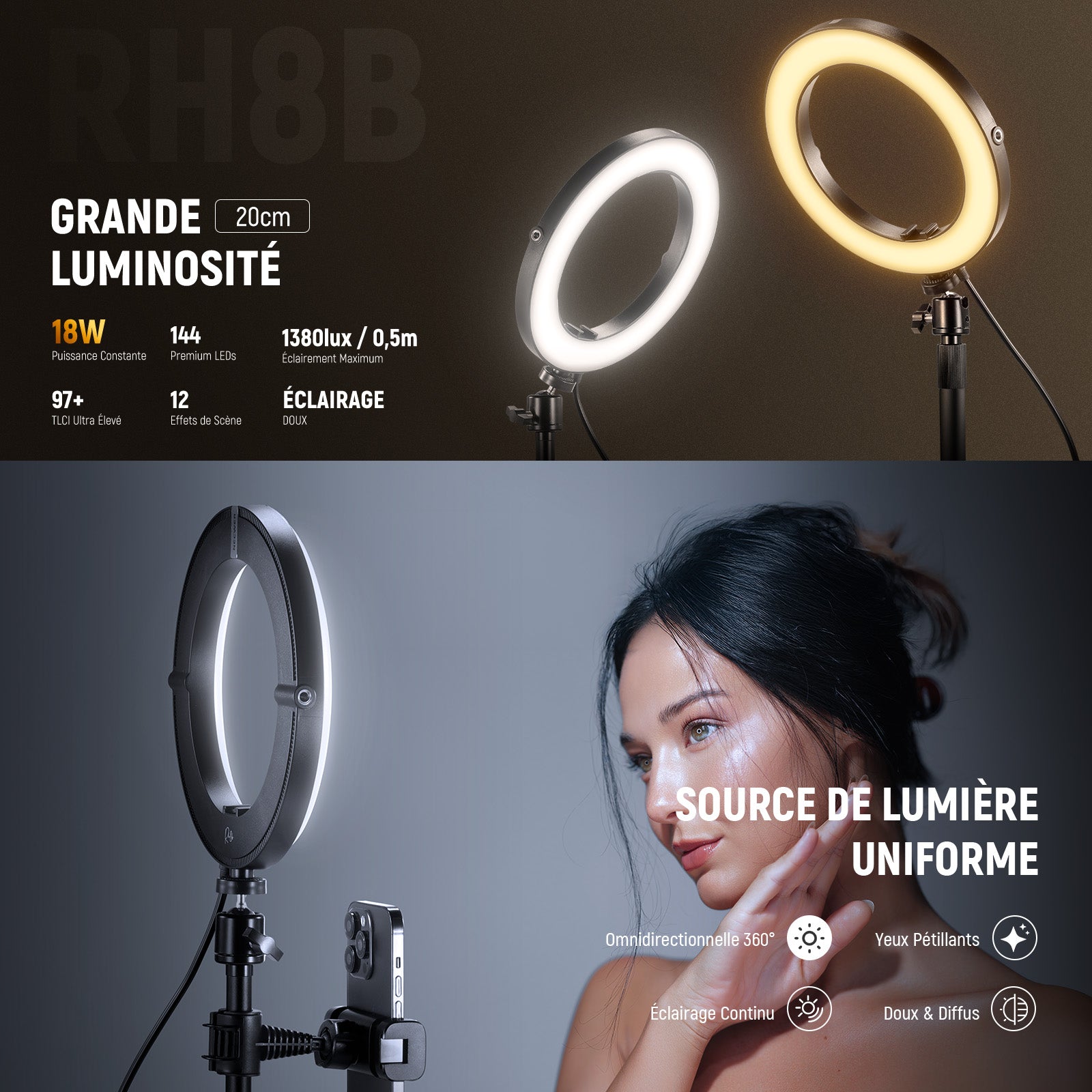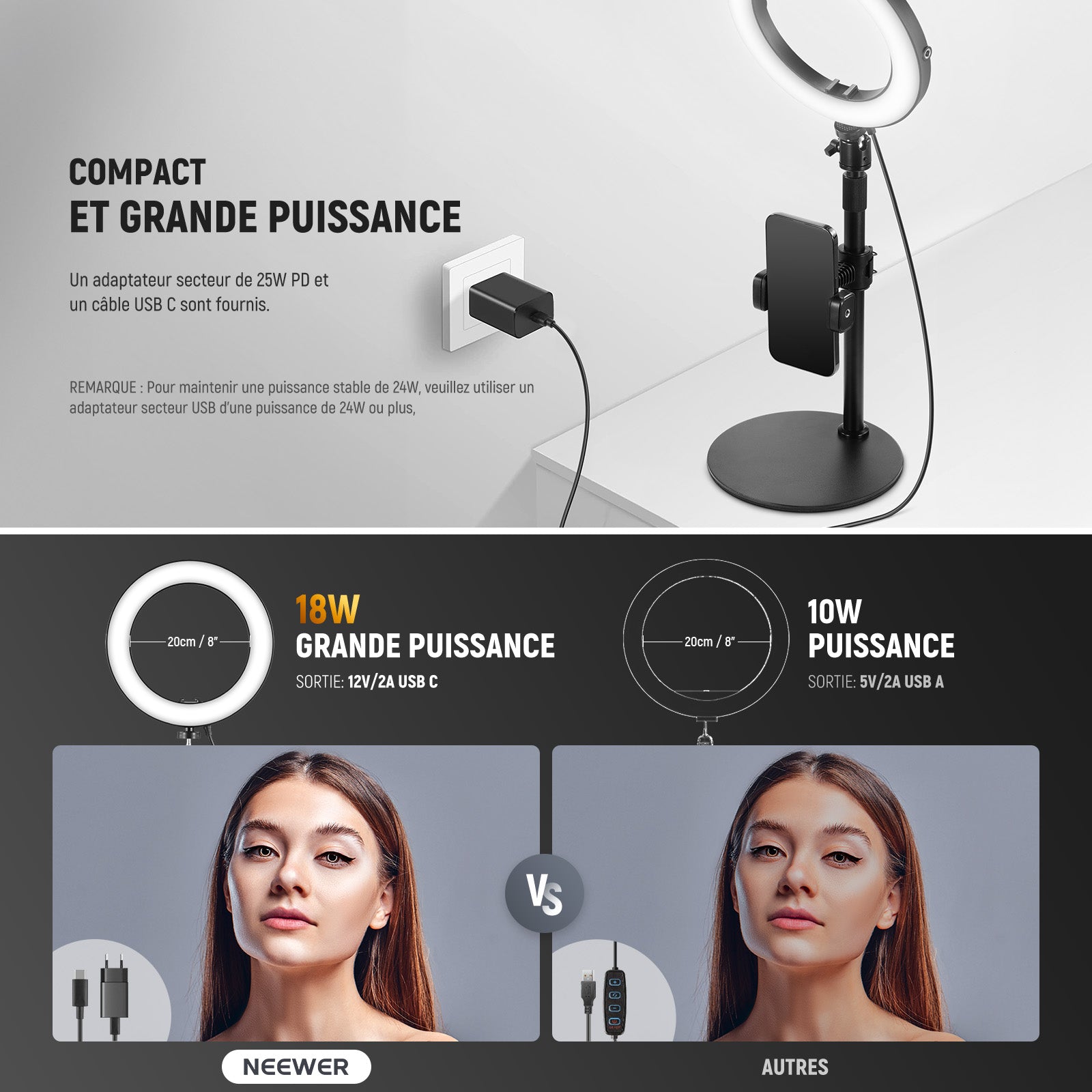 - 【Ring Light 8" 18W Bicolore avec Chargeur 25W PD】 Une puissante ring light de bureau LED de 18W pour le maquillage, le streaming, l'enregistrement vidéo, les appels Zoom, les vlogs YouTube/TikTok, les selfies, possédant 144 LED (72 blanc froid et 72 blanc chaud) qui fournissent une source de lumière puissante, diffuse et uniforme avec un éclairement allant jusqu'à 1380lux/0,5m. Il offre une grande fidélité des couleurs avec CRI95+/TLCI97+ pour reproduire des couleurs plus vraies que nature
