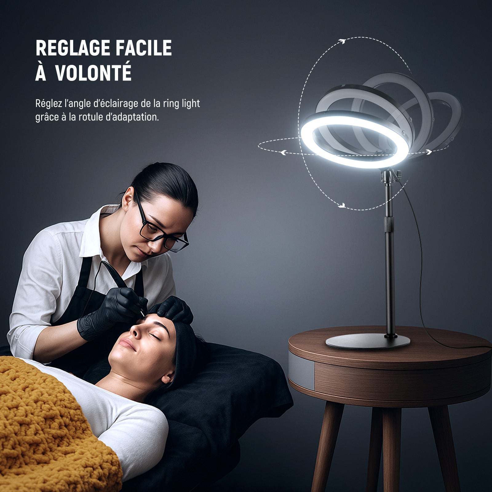 - 【Support de Bureau Réglable & Angle d'Éclairage 360°】 Notre kit ring light selfie contient un support de bureau allant de 29-45cm et une rotule 360°. Ajustez facilement la hauteur et pivotez pour trouver l'angle d'éclairage idéal. Que vous soyez un streamer, un maquilleur, que vous travailliez sur un bureau, que vous fassiez des vidéoconférences avec la webcam d'un ordinateur ou que vous enregistriez des vidéos, cette configuration réglable vous offre la flexibilité dont vous avez besoin