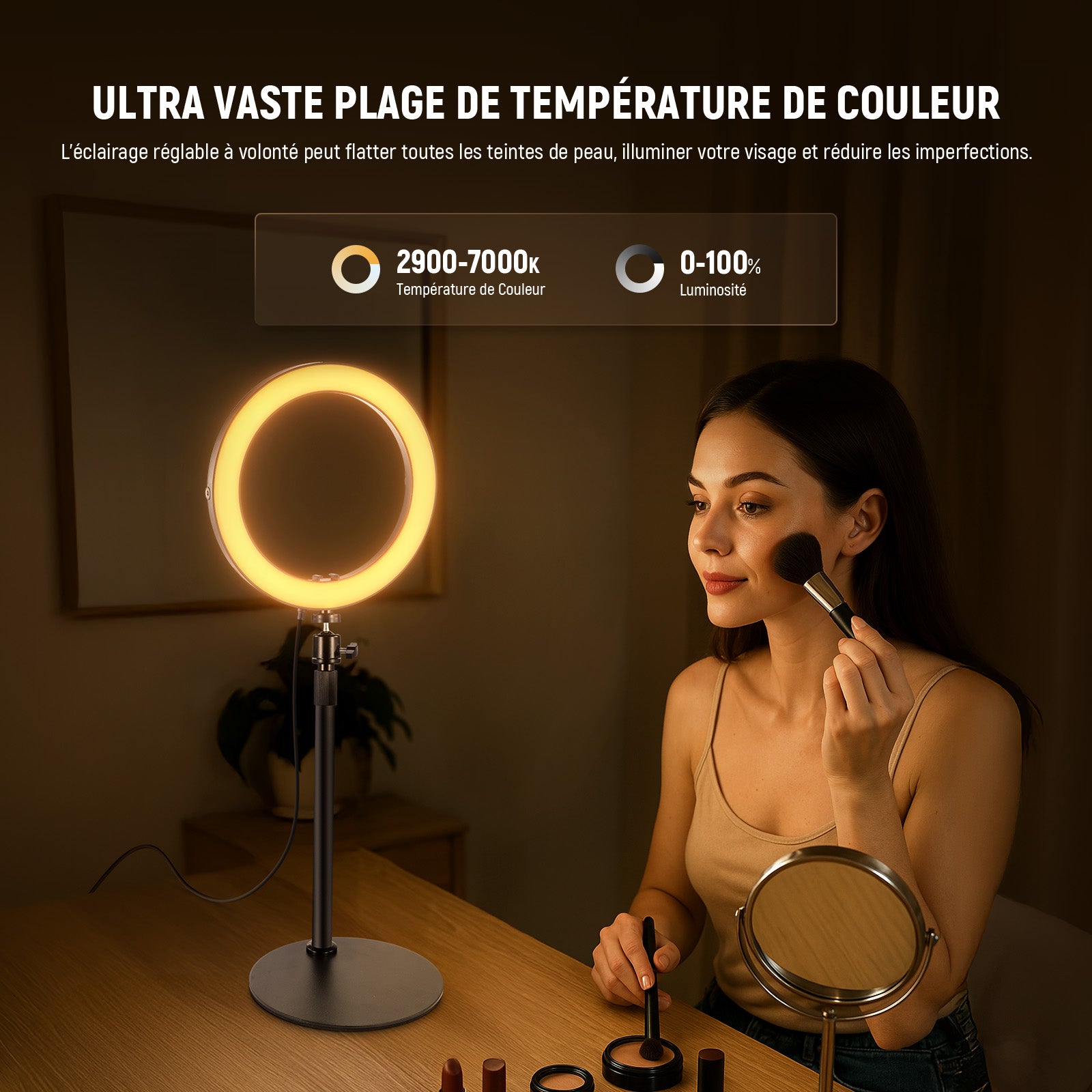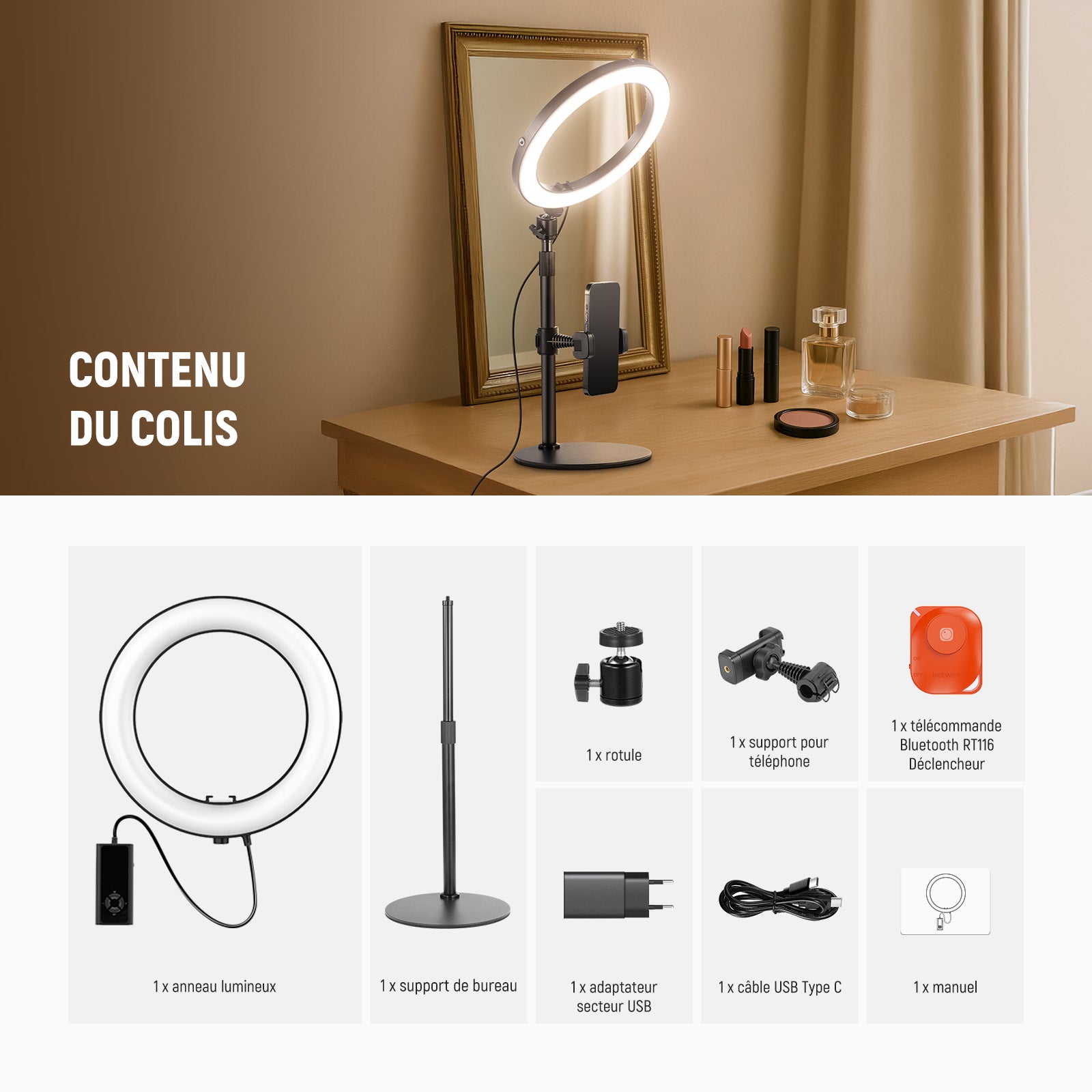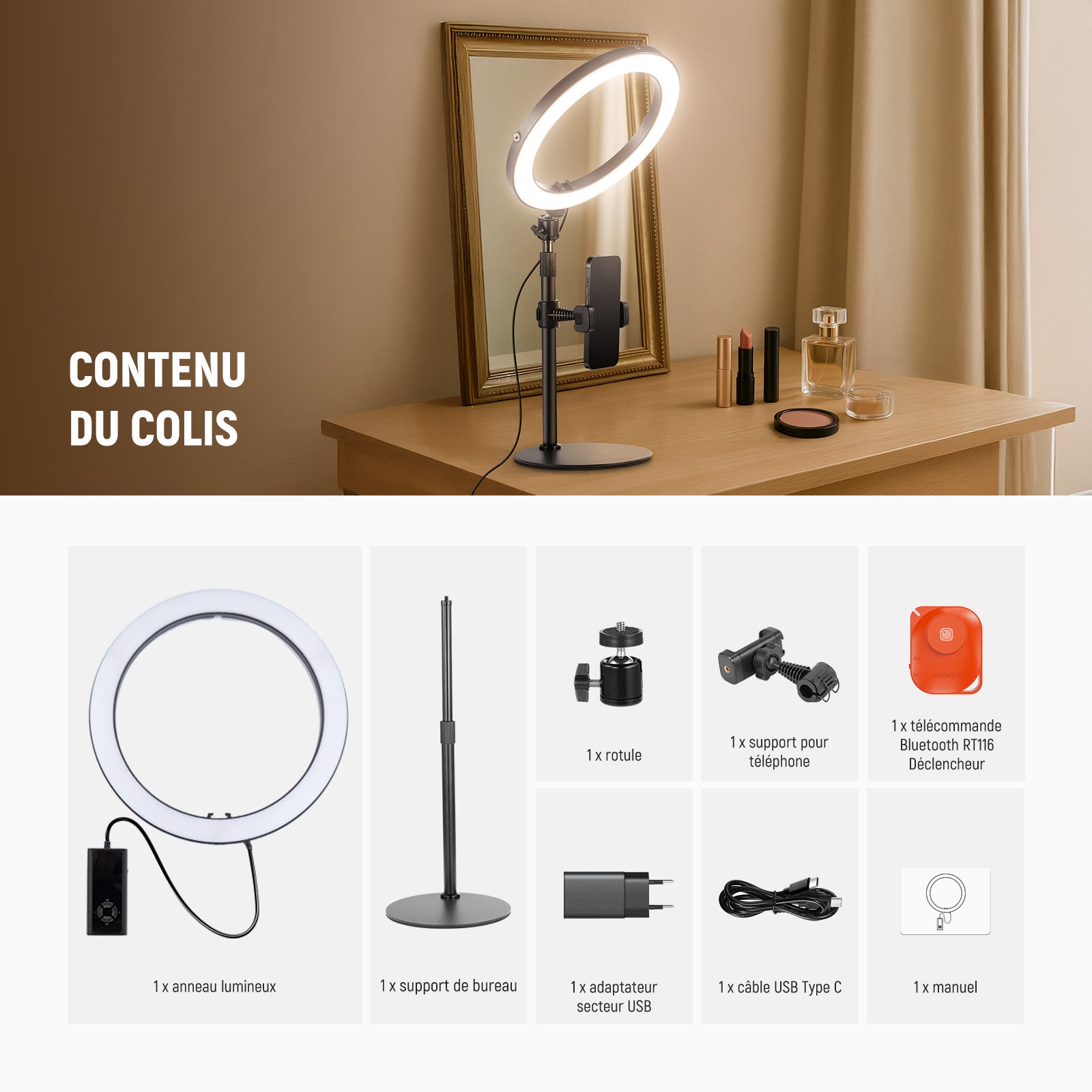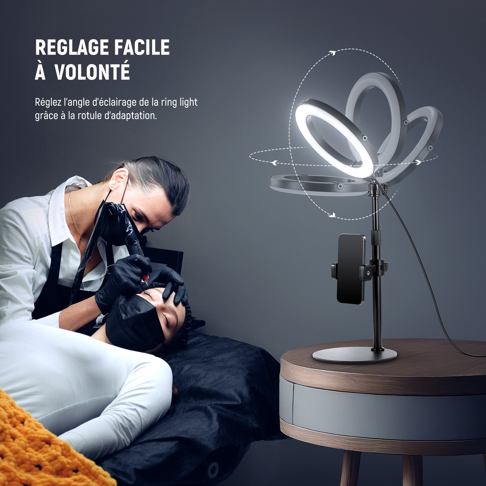 【Compact et portable】Ce kit de lampe annulaire LED de bureau, léger et compact, est compatible avec l’iPhone.Utilisable comme lampe de bureau avec support, key light, lumière d’appoint douce, anneau lumineux pour selfies, éclairage maquillage pour maquilleurs, éclairage Zoom pour ordinateur, lumière pour podcast vidéo, éclairage pour visioconférences sur ordinateur portable, vlogs sur les réseaux sociaux, streaming, etc.
