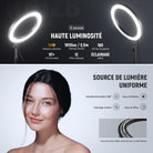 - 【Anneau lumineux bicolore puissant de 20 W】 un anneau lumineux puissant de 20 W offre une lumière principale ou de remplissage pour les maquilleurs, les extensions de cils des esthéticiennes, les tatouages, les enregistrements vidéo, le streaming en direct, les podcasts, les appels zoom, les séances photo, les selfies, YouTube, TikTok Vlog. 168 LED (84 blanc froid et 84 blanc chaud), intensité variable de 0 à 100 %, intensité d'éclairage 1660LX/0,5 m et IRC 97+/TLCI 98+ produisent une source de lumière claire ou douce, diffuse et uniforme avec une précision des couleurs irréprochable
