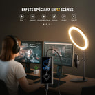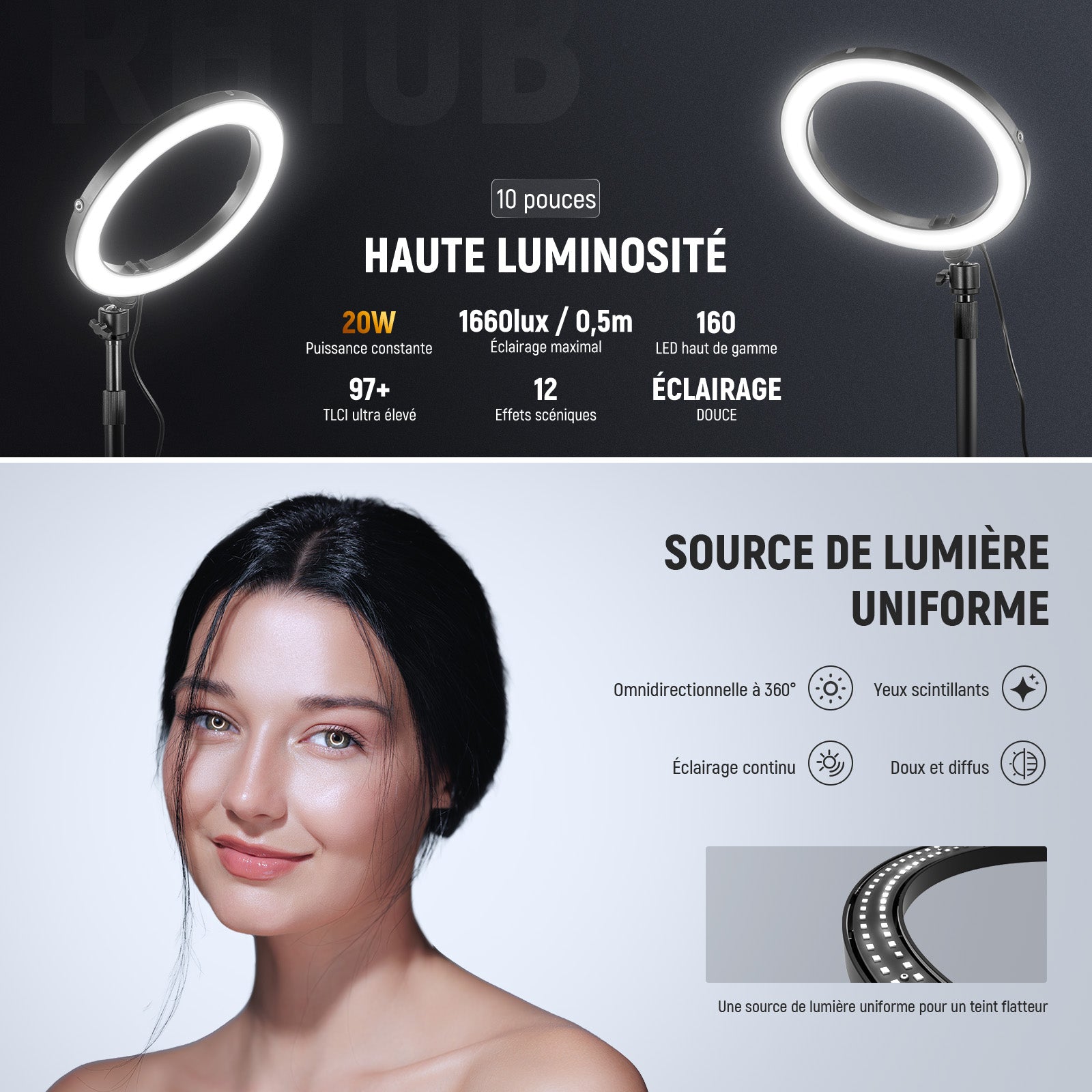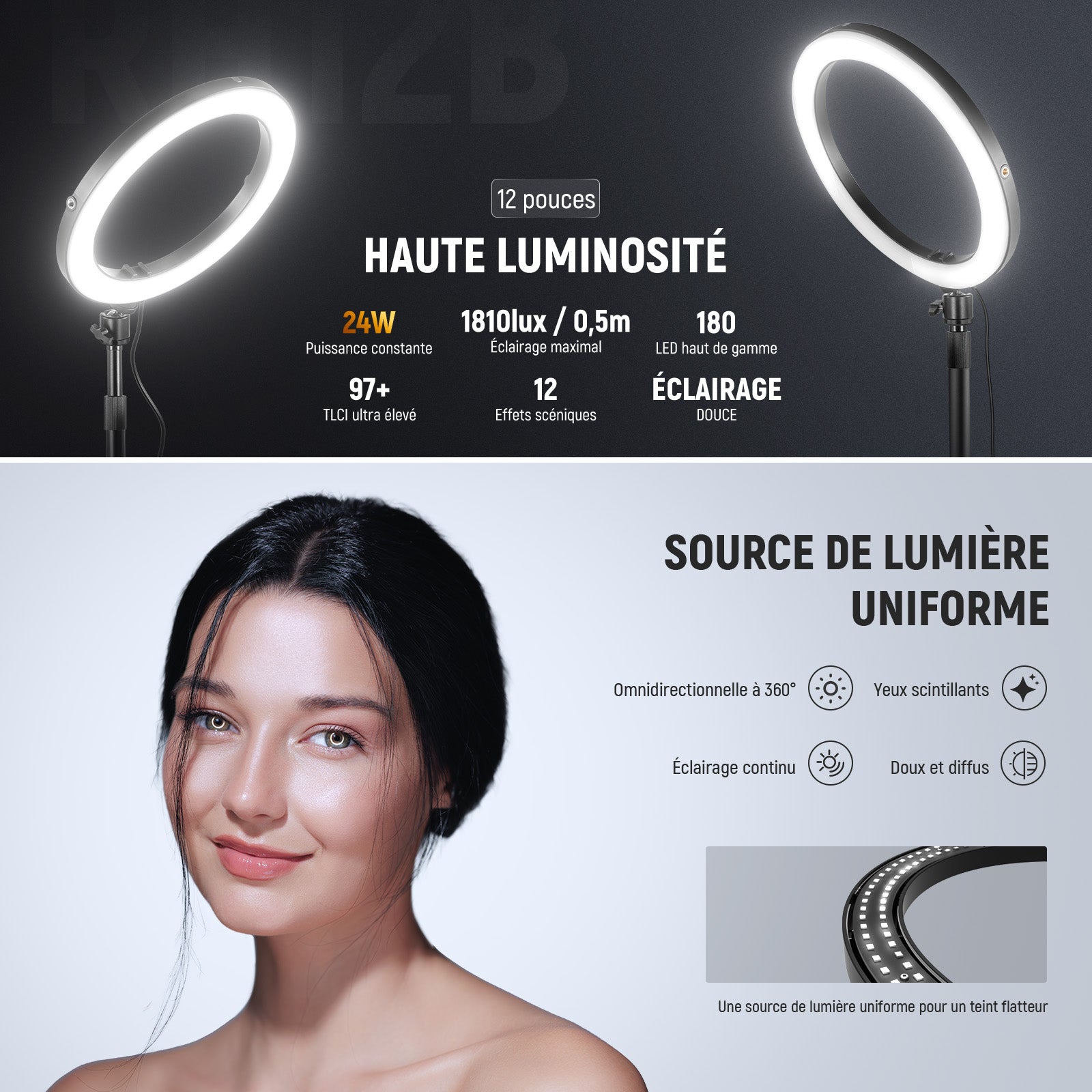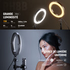 - 【Anneau lumineux bicolore puissant de 24W】 Cet anneau lumineux puissant de 20 W offre un éclairage principal ou d'appoint pour les appels Zoom, les réunions en ligne, l'enregistrement vidéo, le streaming en direct, les selfies, le vlogging TikTok,etc. 180 LED (90 blanc froid et 90 blanc chaud), gradation de 0 à 100%, intensité lumineuse de 1810 lux/0,5m et IRC 97+/TLCI 98+ produisent une lumière vive ou douce, diffuse et uniforme, avec une précision des couleurs irréprochable.